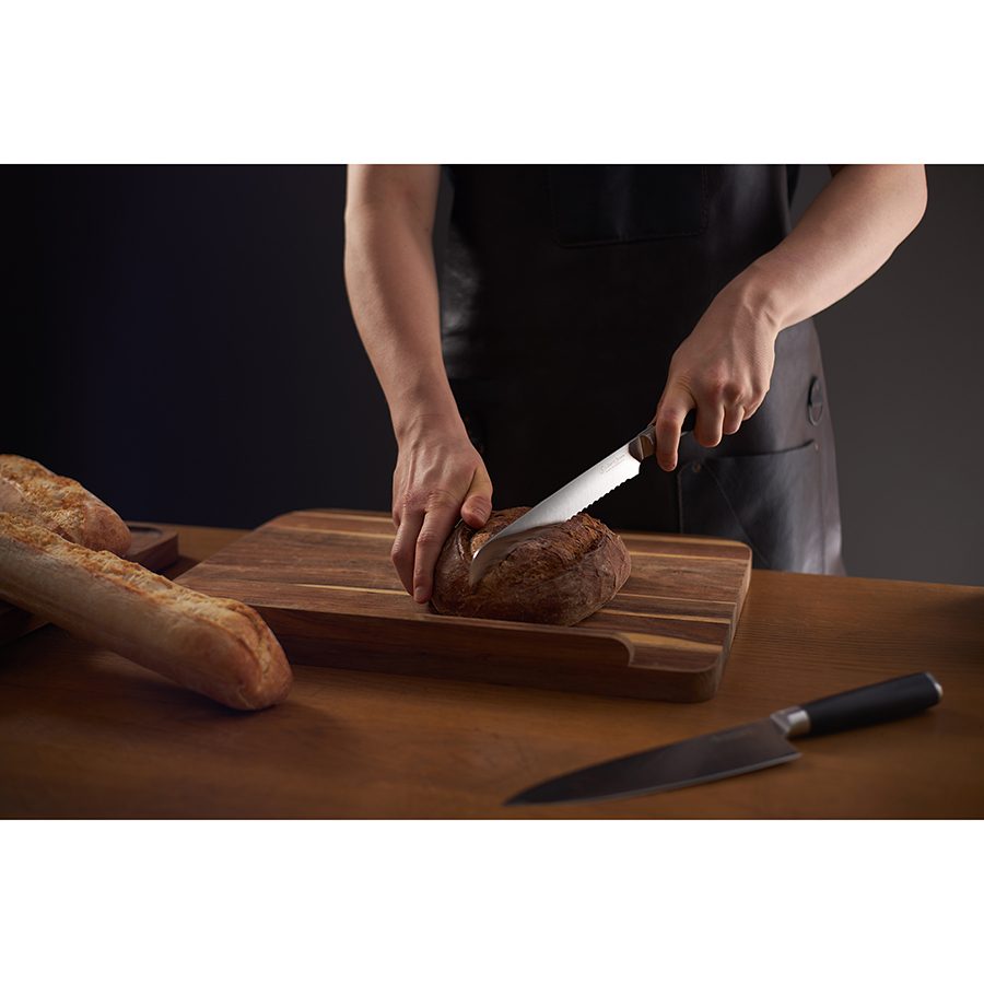 Нож Icon от бренда Liberty Jones идеально подходит для аккуратного нарезания любых видов хлеба, от хрустящих багетов до мягких булочек. Клинок из известной своими свойствами немецкой нержавеющей стали гарантирует кухонному инструменту долговечность и безупречную остроту, а ручка из композитного материала обеспечивает комфорт и безопасность в использовании. Лазерные системы контролируют угол заточки с точностью до 0,1°, что невозможно при ручной или механической обработке. Кроме того, лазерная заточка не перегревает металл (в отличие от ручных методов), сохраняя структуру стали.
