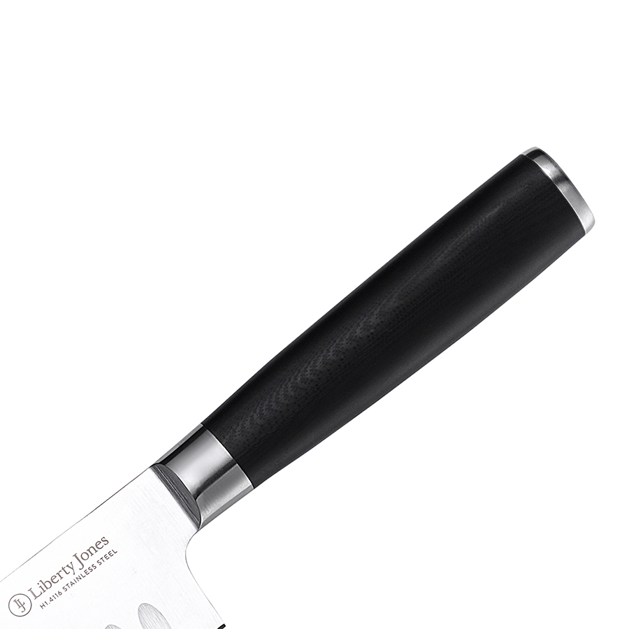 Нож Сантоку Icon от бренда Liberty Jones – идеальный выбор не только для опытных поваров, но и для любителей кулинарии, желающих достичь высоких результатов на кухне. Этот универсальный инструмент из известной своими свойствами немецкой нержавеющей стали идеально подходит для нарезки, рубки, шинковки и измельчения продуктов, обеспечивая комфорт при каждом использовании. Лазерные системы контролируют угол заточки с точностью до 0,1°, что невозможно при ручной или механической обработке. Кроме того, лазерная заточка не перегревает металл (в отличие от ручных методов), сохраняя структуру стали.