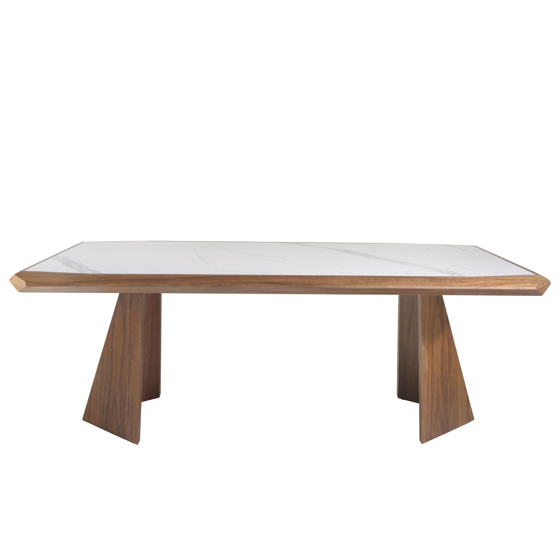 Прямоугольный обеденный стол современного дизайна из фарфорового мрамора calacatta толщиной 6 мм с матовой поверхностью и структурой из натурального шпона орехового дерева толщиной 0,5 мм. Благодаря своему геометрическому дизайну с инкрустированной столешницей из керамогранита и оригинальному дизайну ножек этот стол станет главным героем вашей гостиной.