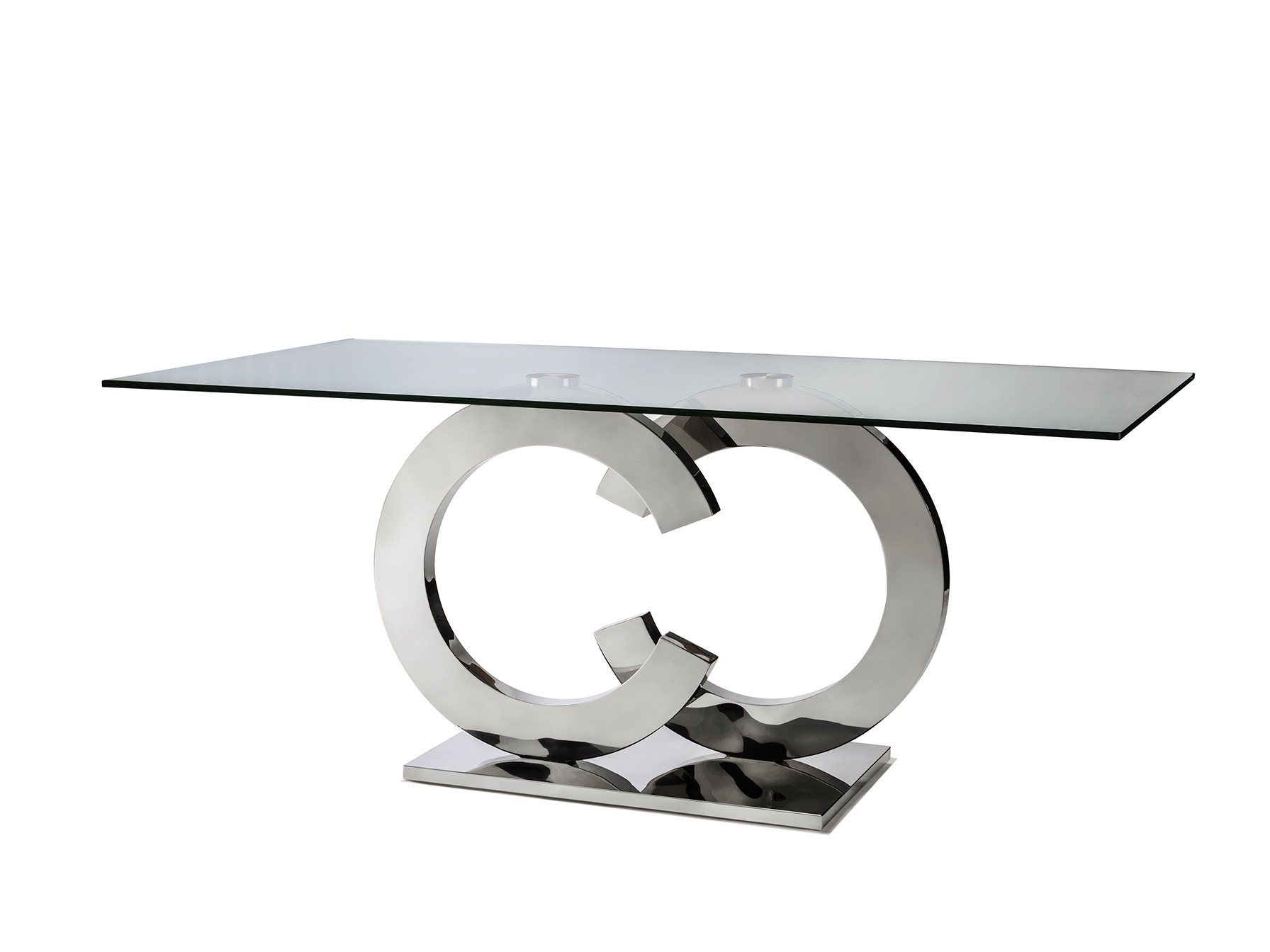 Прямоугольный обеденный стол из нержавеющей стали и безопасного стекла толщиной 12 мм с полированной кромкой.