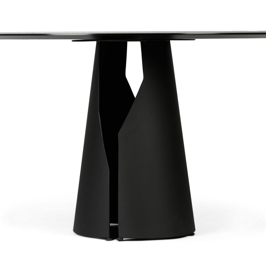 Уникальное основание с вырезной деталью — отличное место для декора, добавляя индивидуальности и стиля вашему интерьеру. Сочетание темных и светлых оттенков делает стол универсальным, идеально подходящим для любого стиля, от минимализма до классики.