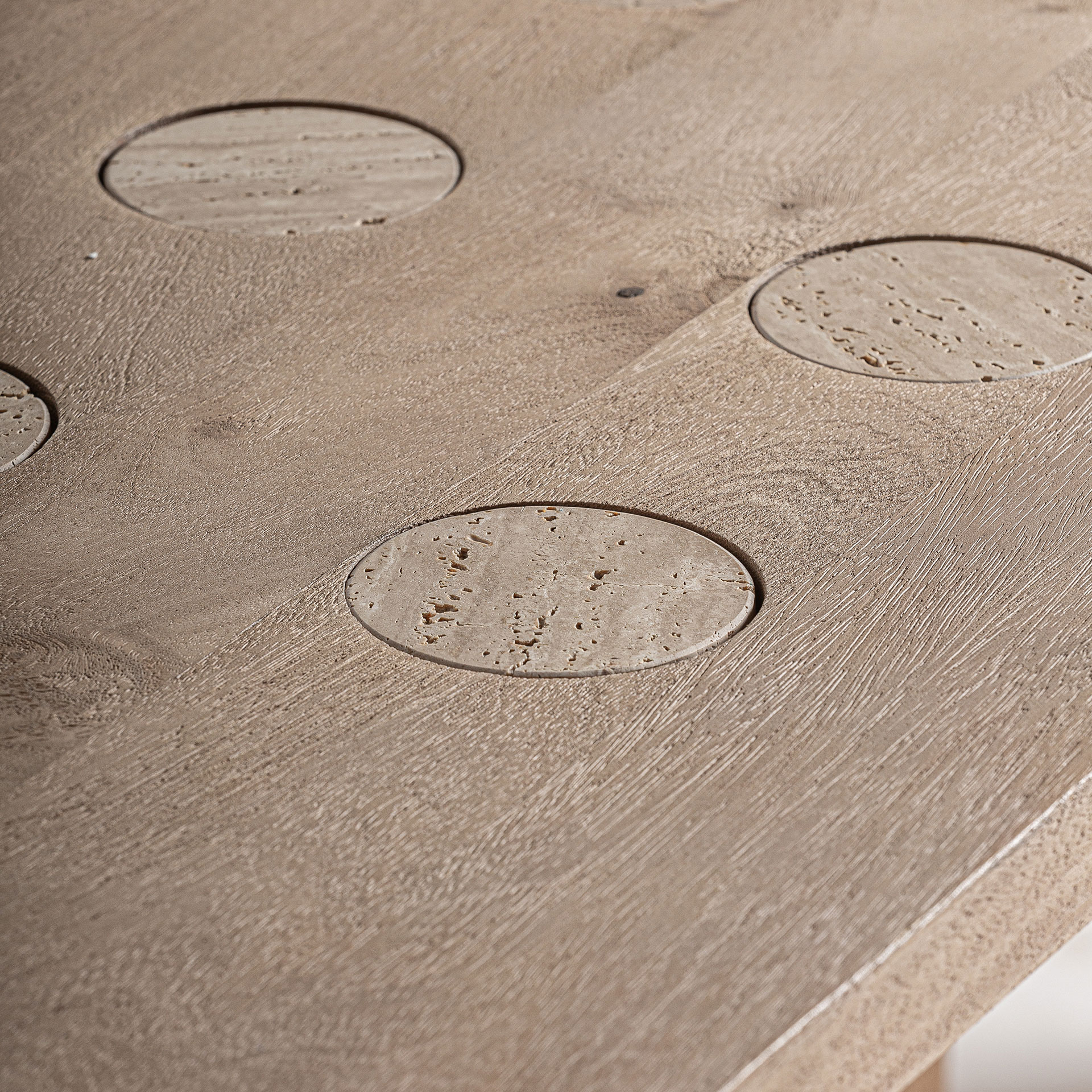 Обеденный стол JACQUARD в современном стиле. Изготовлен из мангового дерева светло-коричневого цвета в сочетании с травертином коричневого цвета. Изделие разборное.