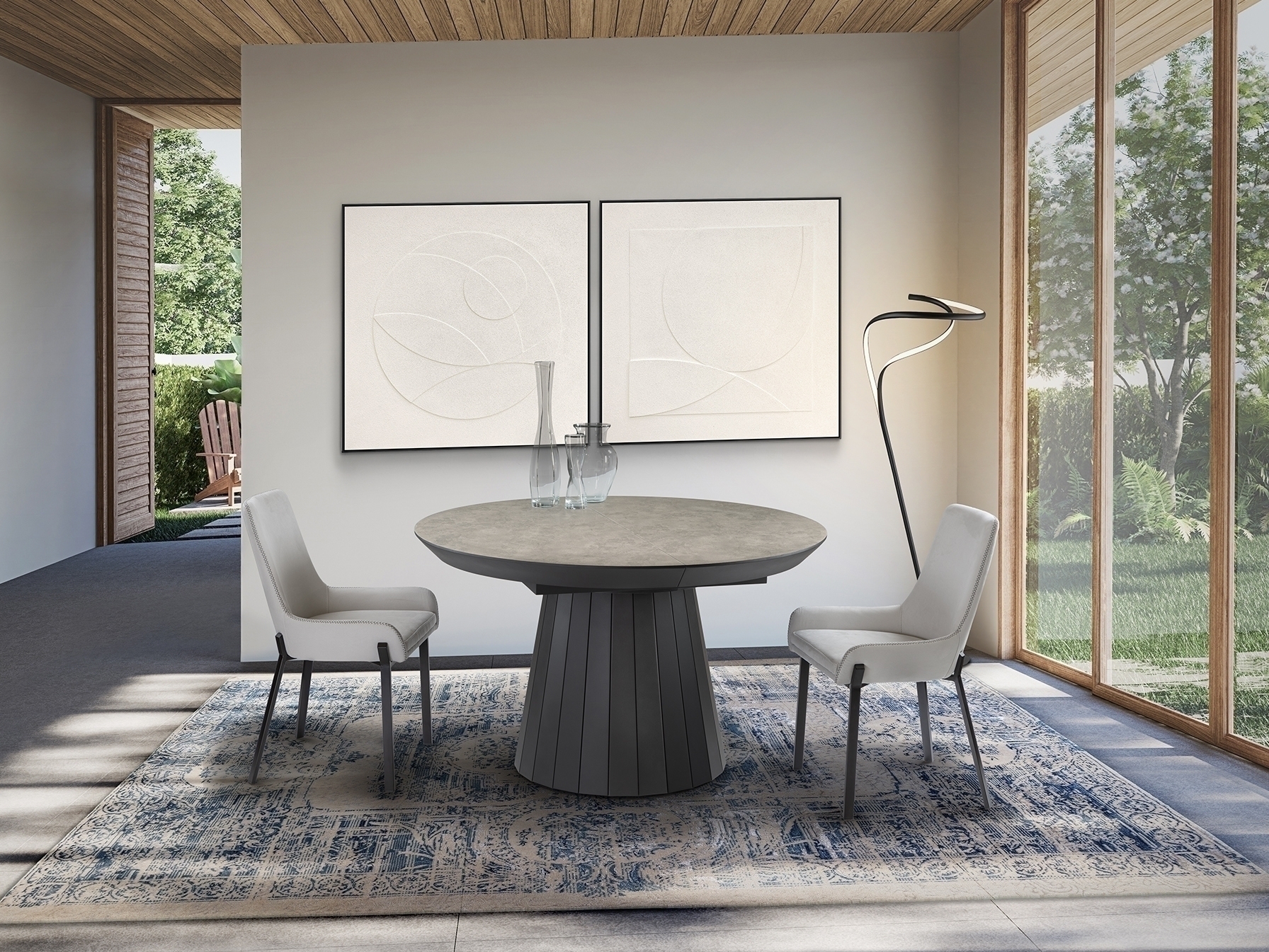 Обеденный стол раздвижной, каркас из МДФ, отделка матово-черная. Столешница из МДФ с высокопрочной меламиновой поверхностью, отделка матовый камень, с матово-черными краями. Раздвижной до 230 см.