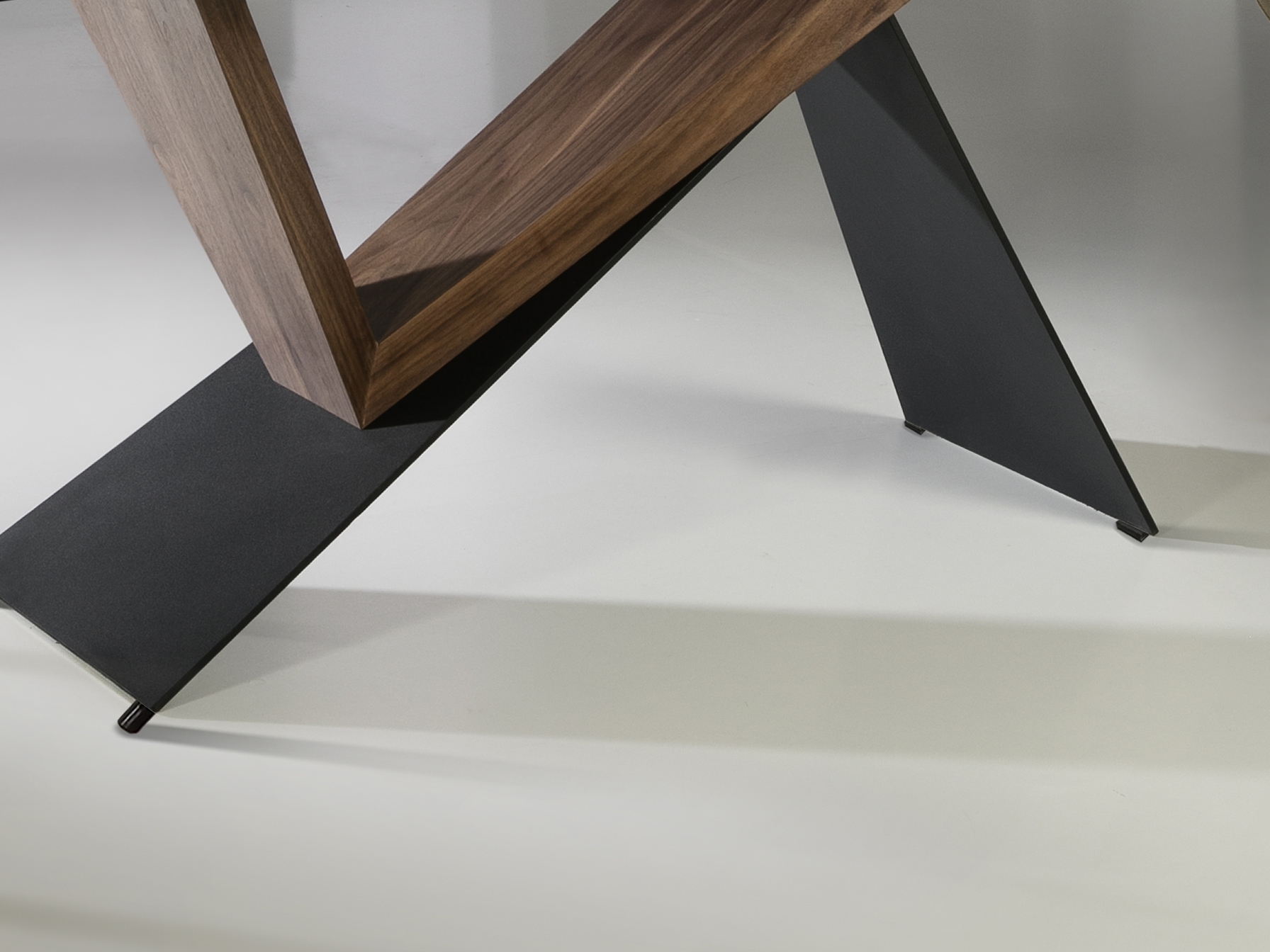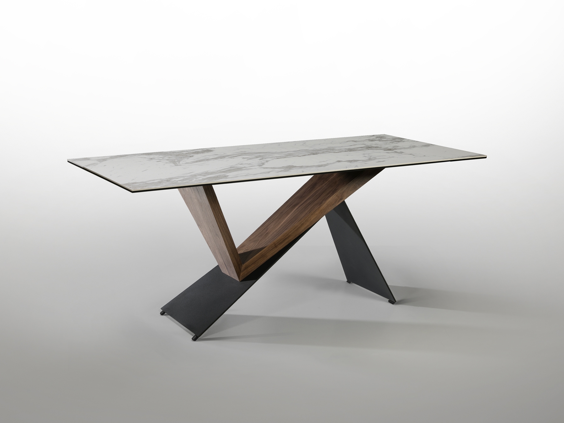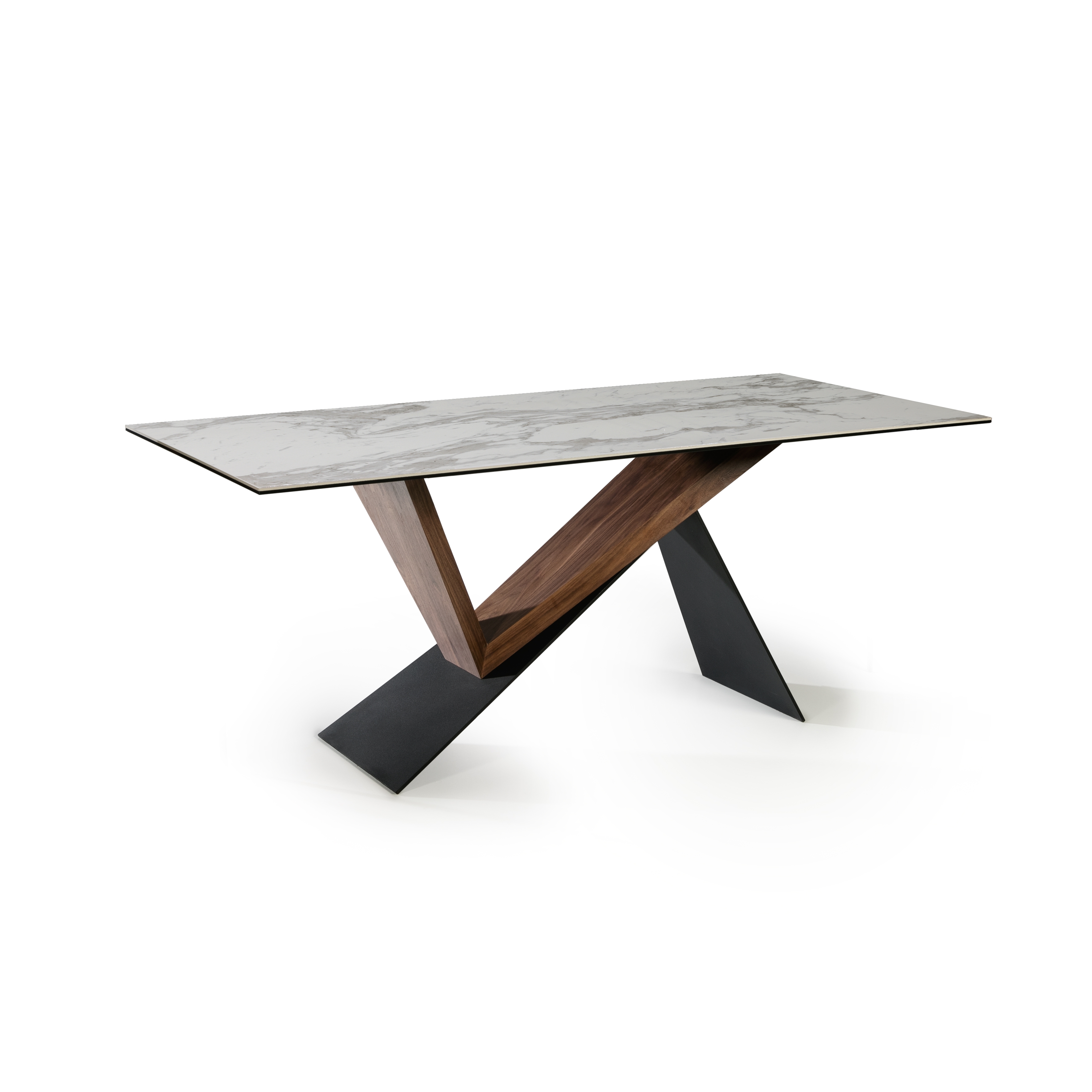 Стол обеденный из металла с матовым чёрным покрытием и дерева ореха. Столешница из керамики и стекла с рисунком "белый мрамор".