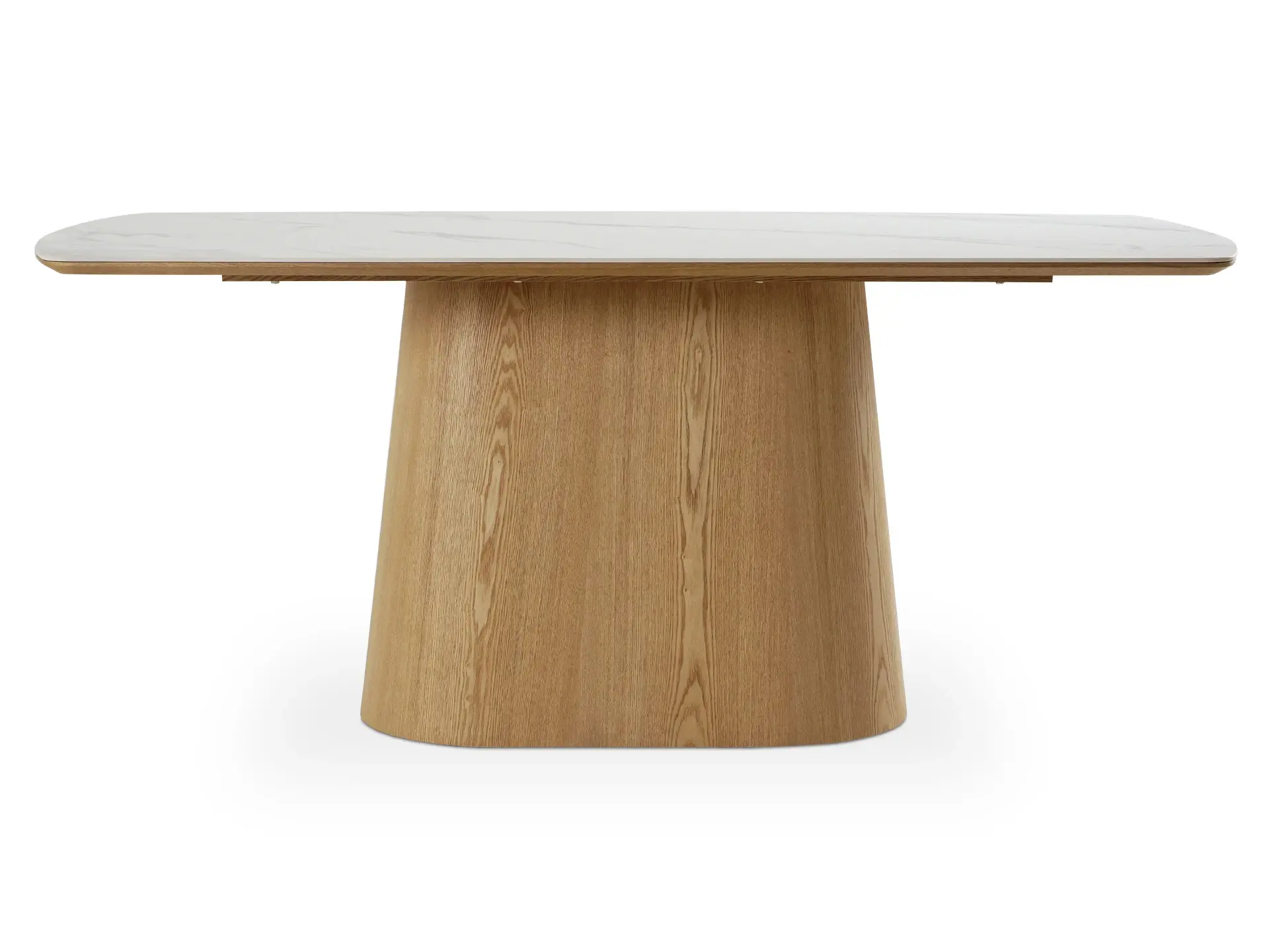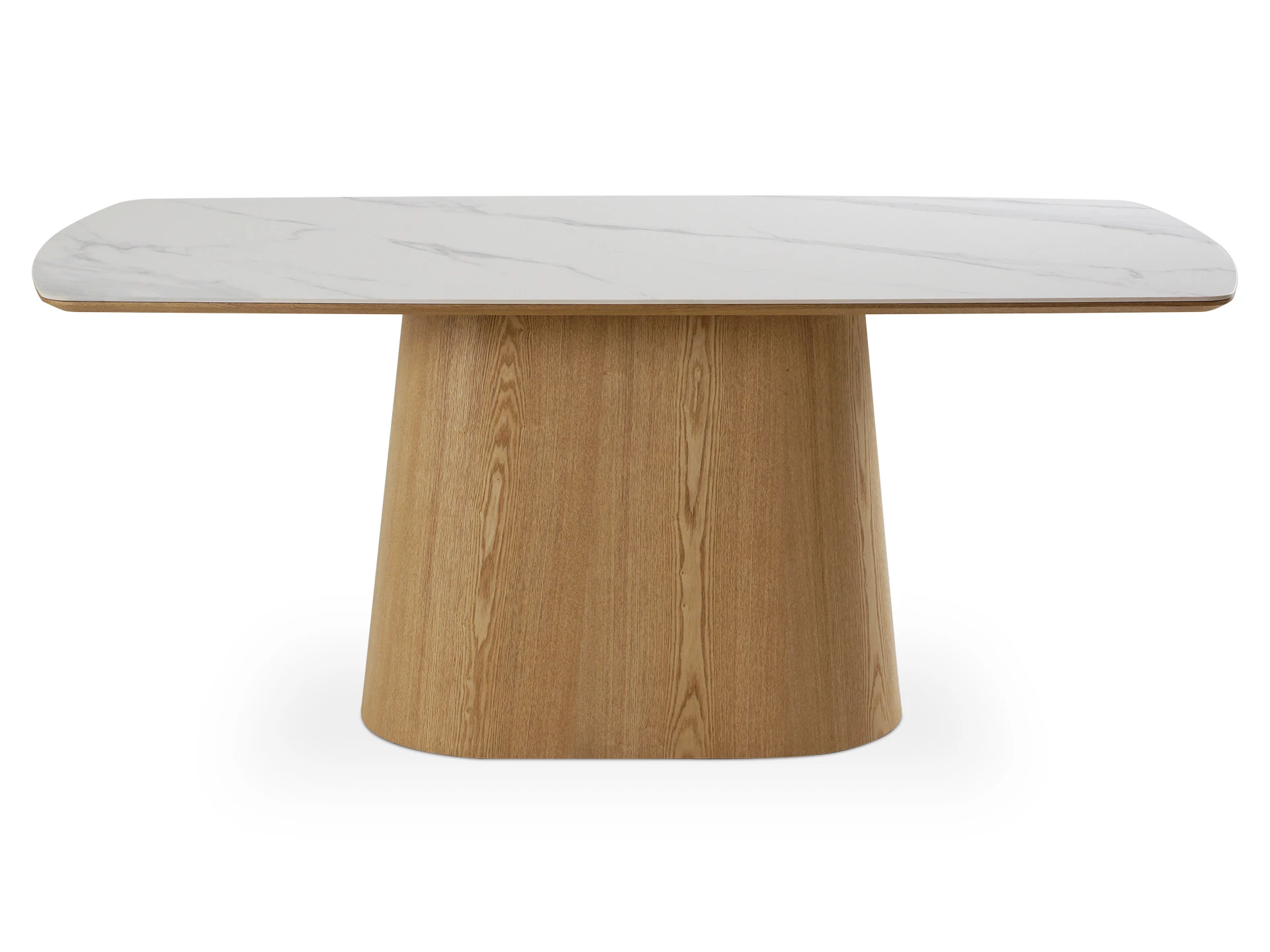 Обеденный стол с лаконичным характером для актуальных интерьеров. Трапециевидное внушительное основание поддерживает прямоугольную столешницу из белой матовой керамики на основе МДФ с отделкой натуральным шпоном дуба. Который отличается прочностью, долговечностью и привлекательной текстурой.
