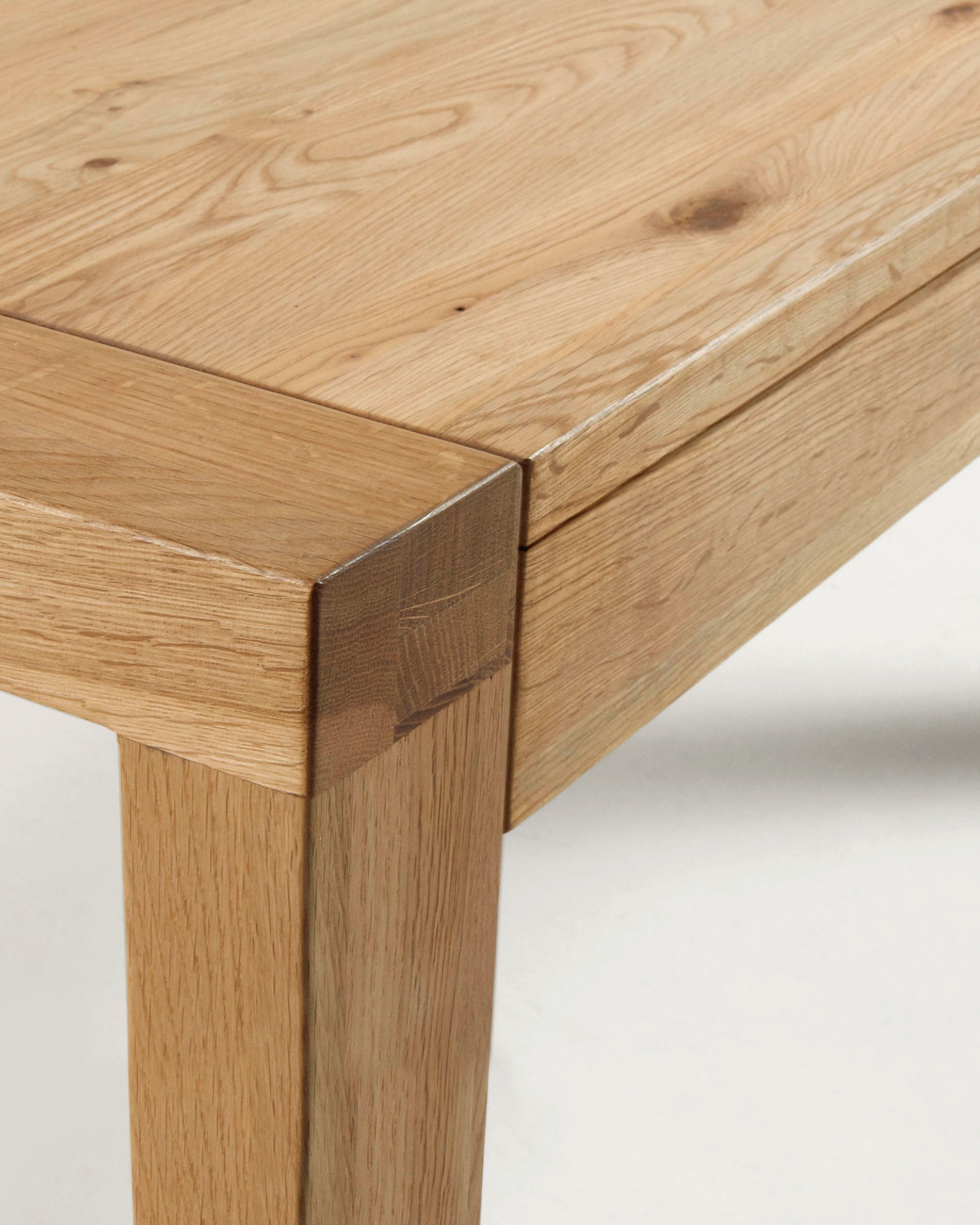 Стол прямоугольной формы, полностью сделан из дерева. Поверхность столешницы покрыта лаком для защиты от влаги и загрязнений. Ее цвет зависит от выбранной модели (натуральный светлый или темный дуб, состаренный дуб).
