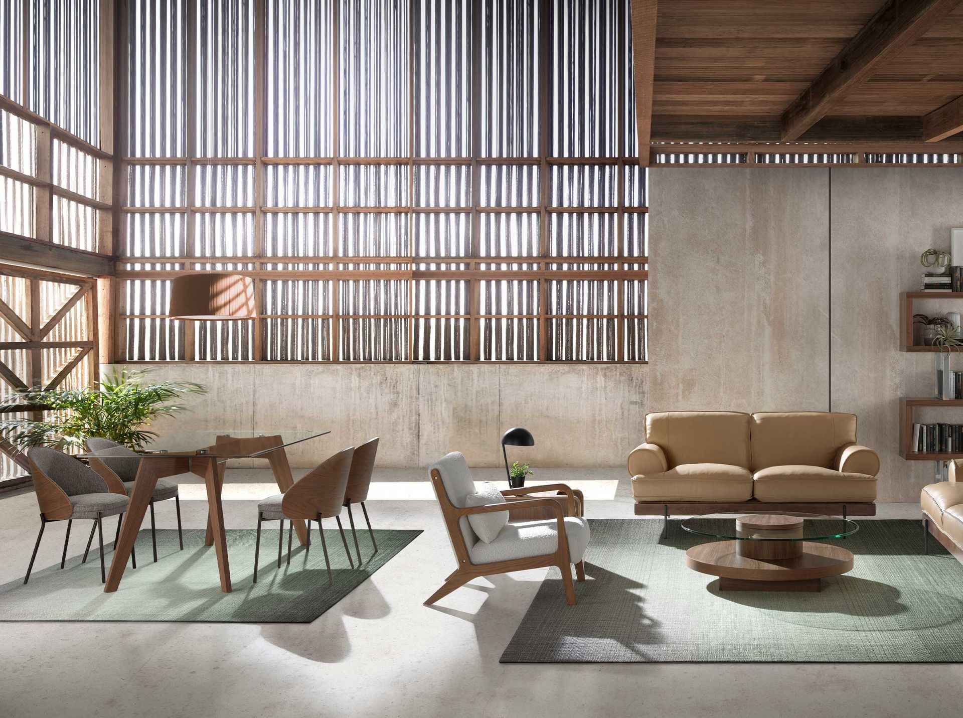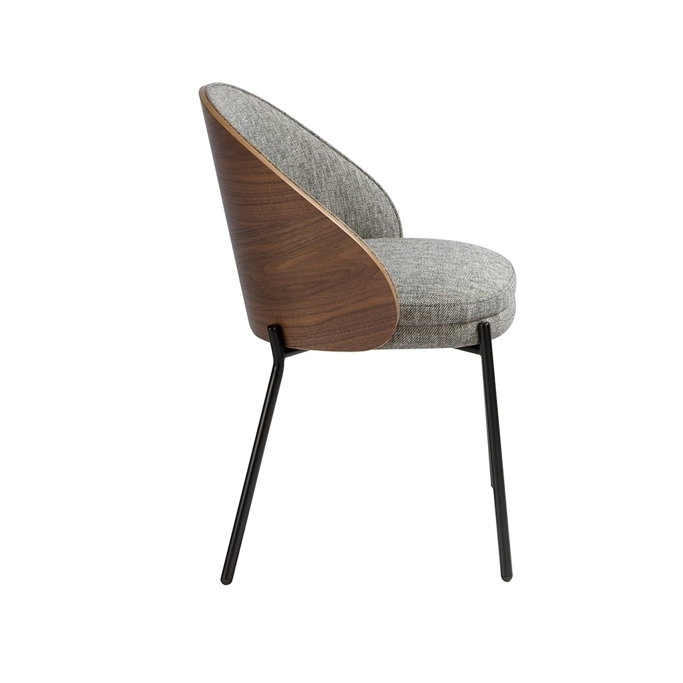 Обеденный стул с обивкой из ткани со спинкой из шпона орехового дерева. Каркас ножек из черной нержавеющей стали.