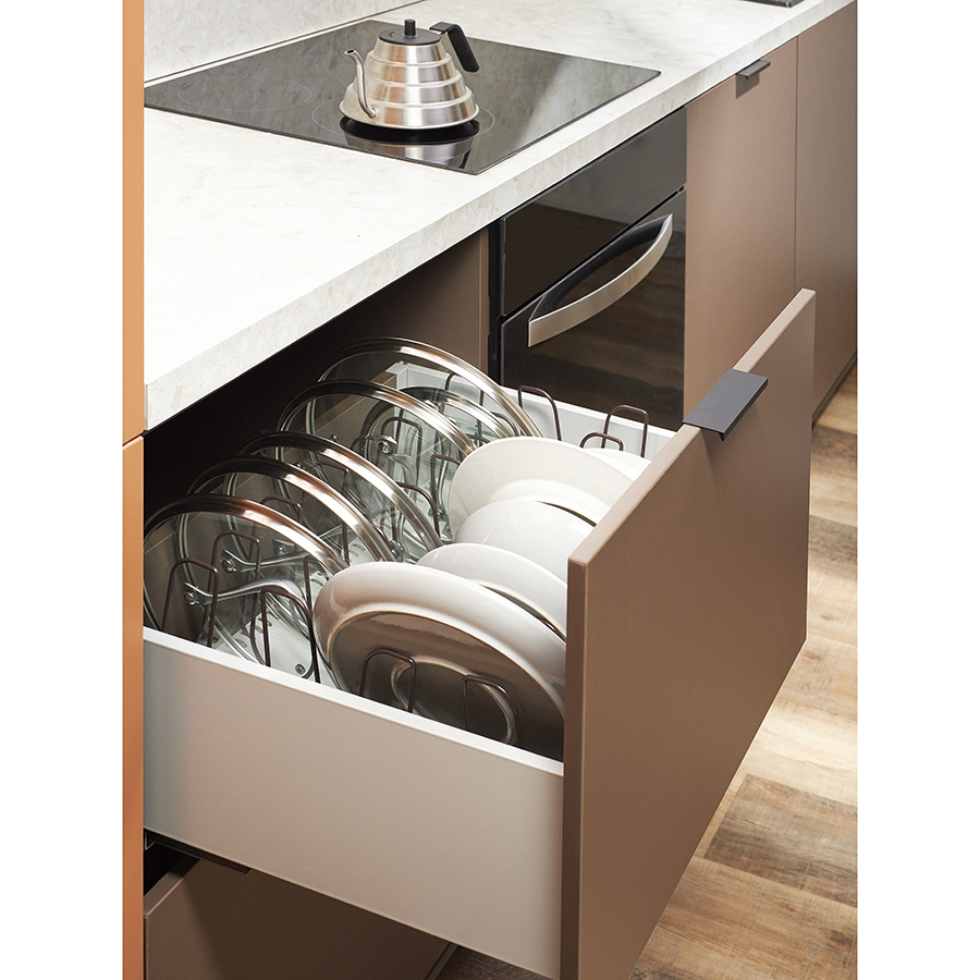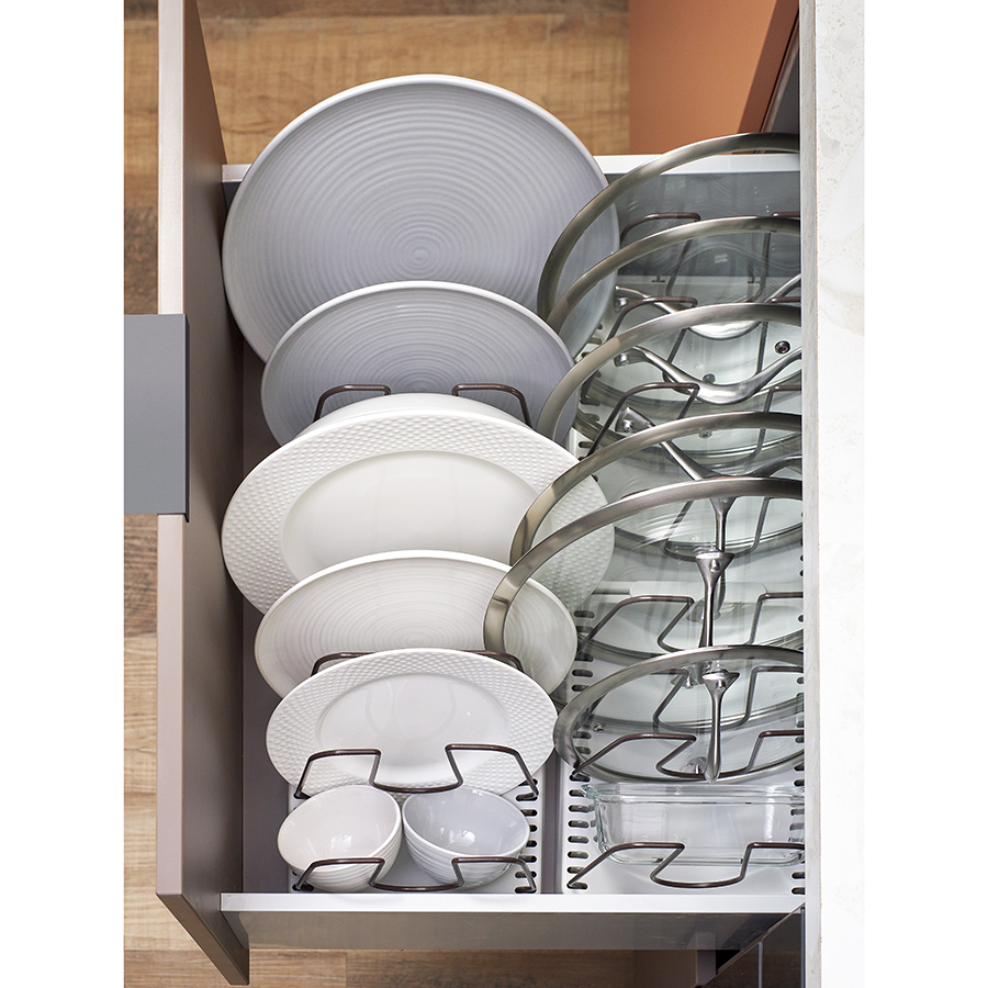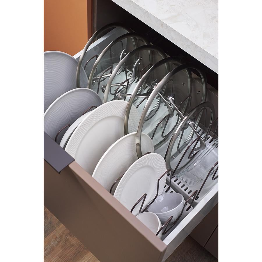 Органайзер Ronja имеет четыре регулируемых разделителя, что обеспечивает удобное размещение посуды и различных кухонных аксессуаров – тарелок, разделочных досок, кастрюль, сковородок и других предметов.