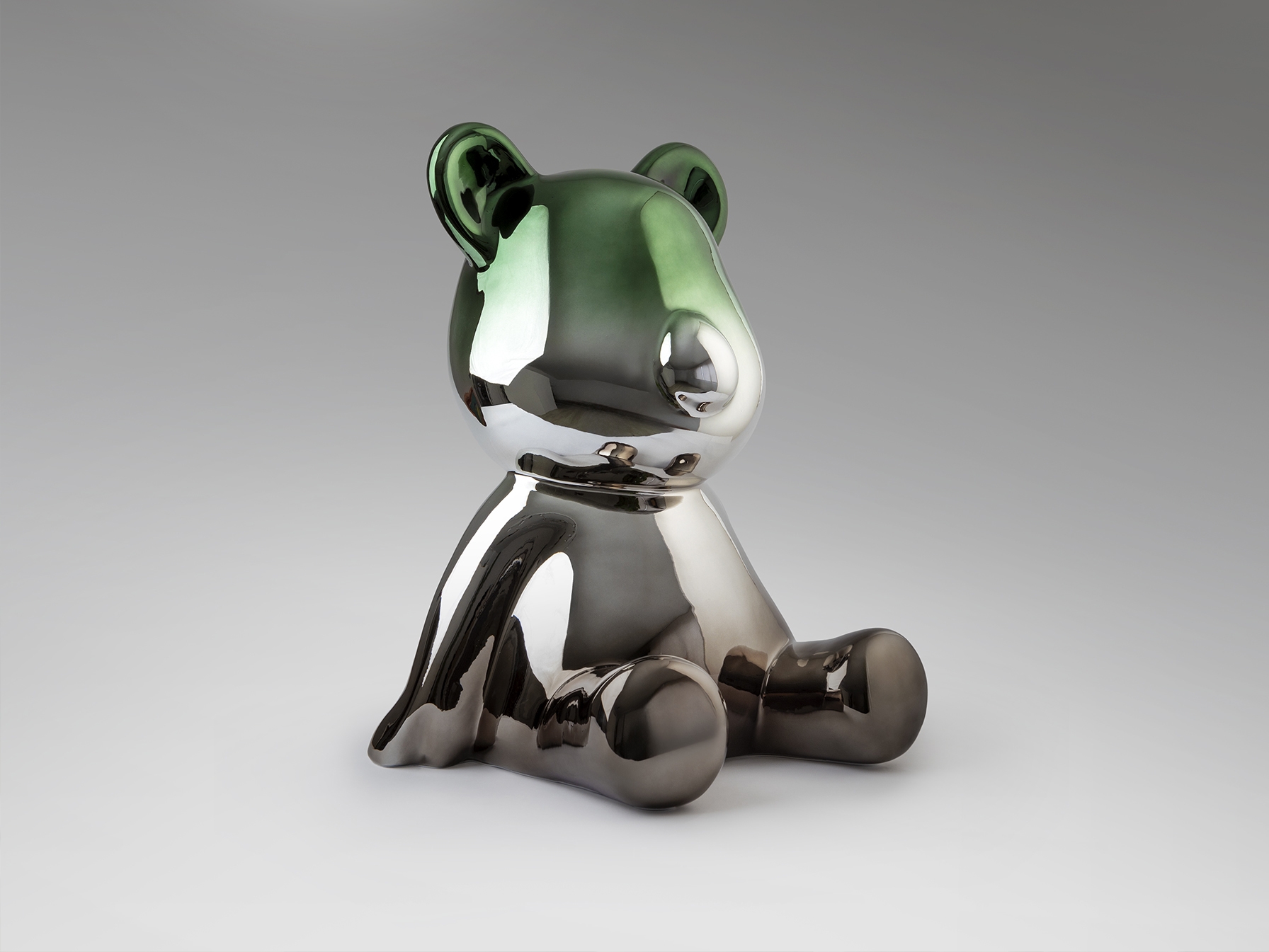 Круглая фигурка медведя, среднего размера. Изготовлена из смолы, металлизированная, с градиентным покрытием от свинцово-серого до зелёного цвета.