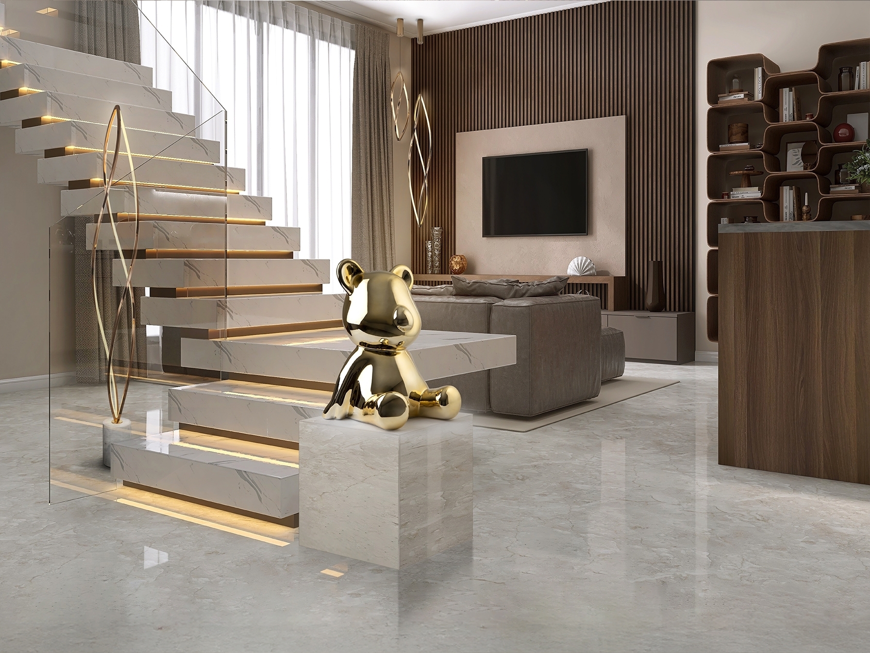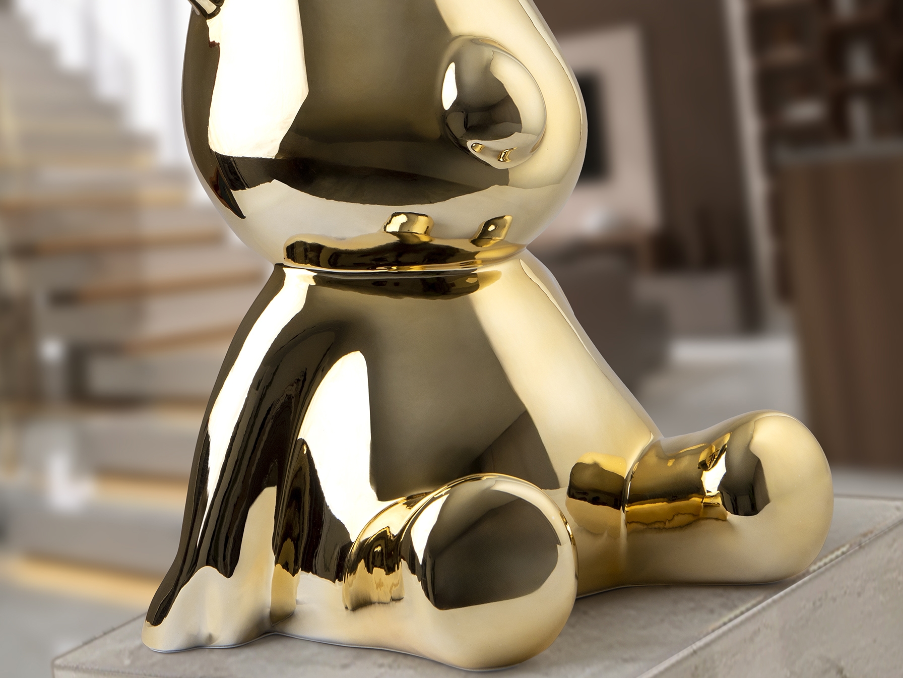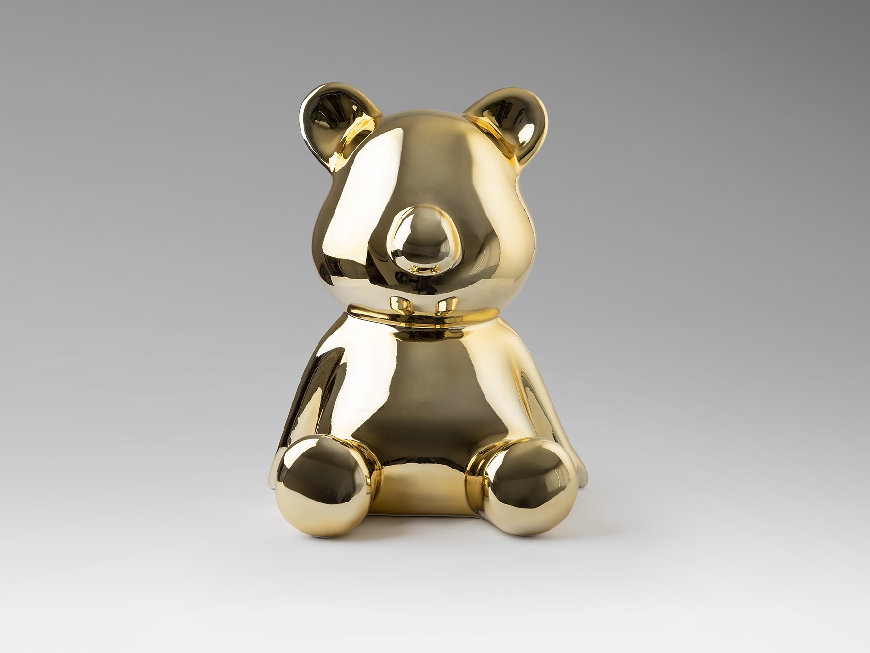 Круглая фигурка медведя среднего размера. Изготовлена из смолы, покрыта металлическим золотом.