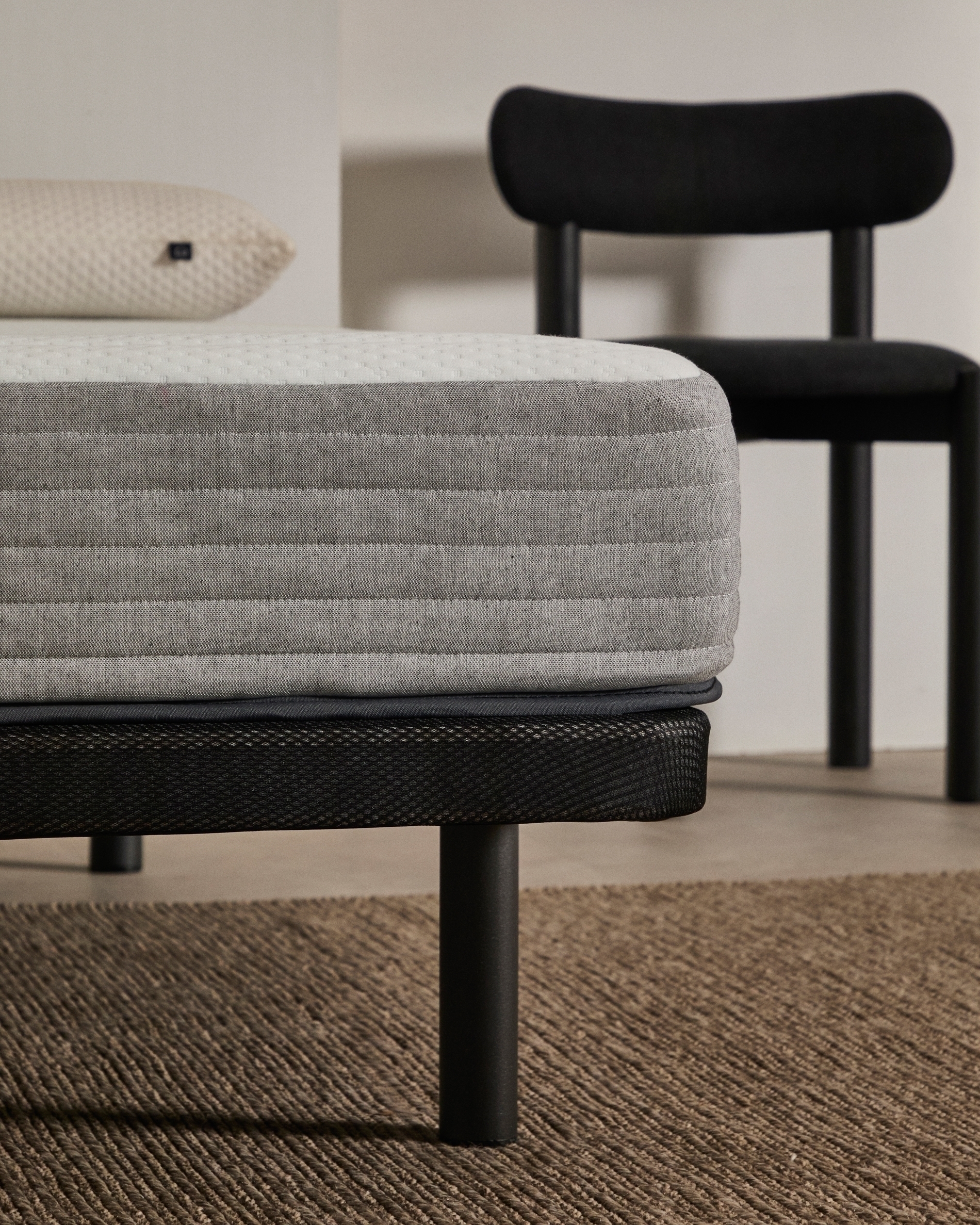 Основание кровати с металлической основой, обитой воздухопроницаемой трехмерной нескользкой черной тканью. Включает соединительные пластины, совместимые с ножками X или S (не включены). Для матраса 135x190 см.