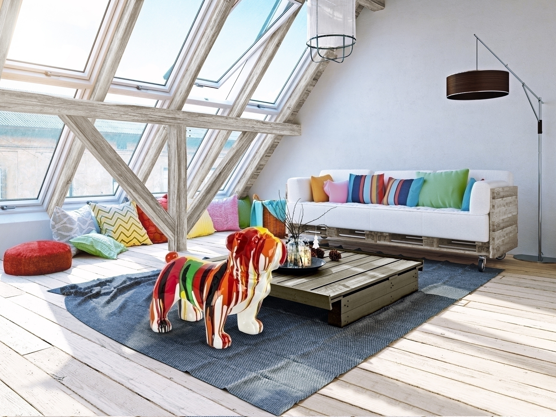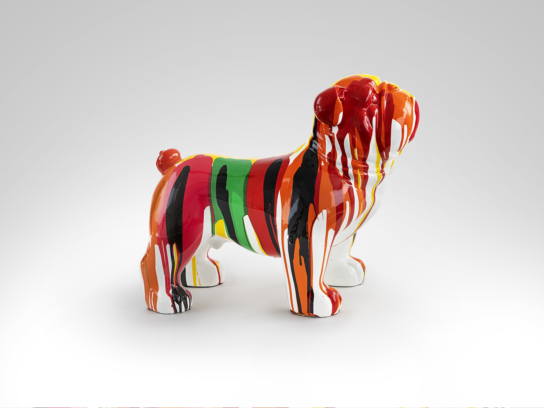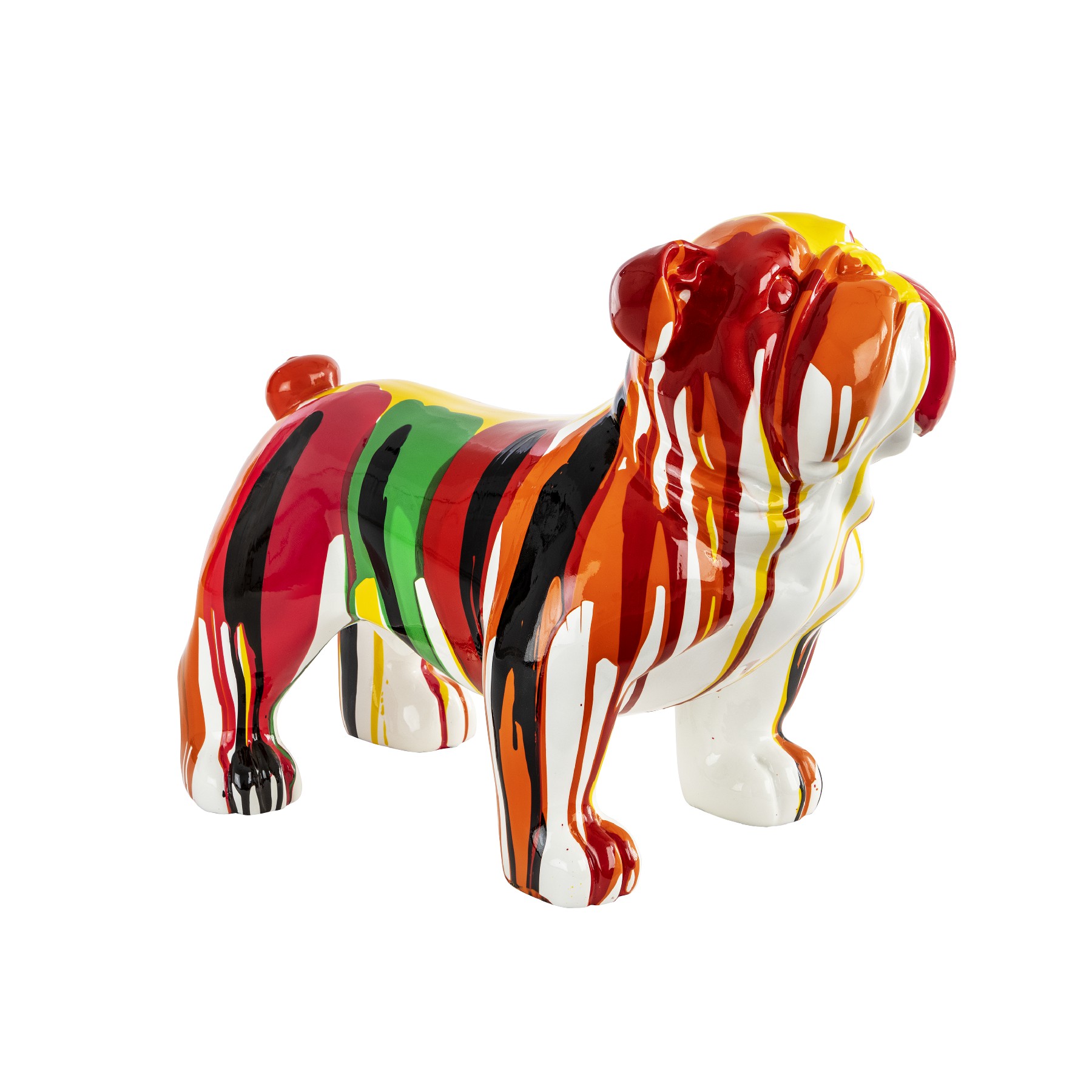 Фигурка бульдога среднего размера, изготовлена из смолы. Подходит для улицы. Оформление: глянцевая белая краска с цветными струями.