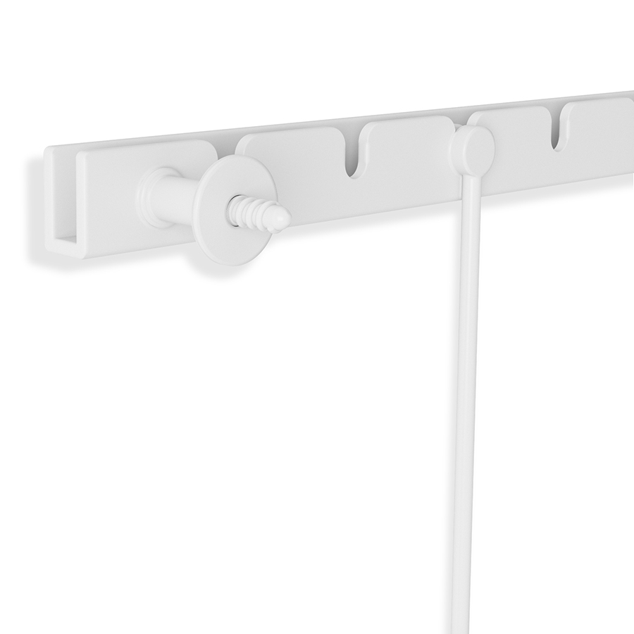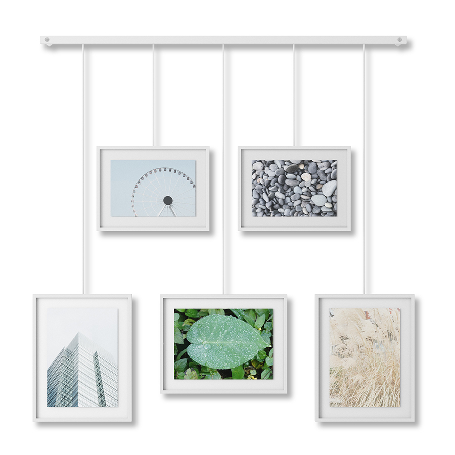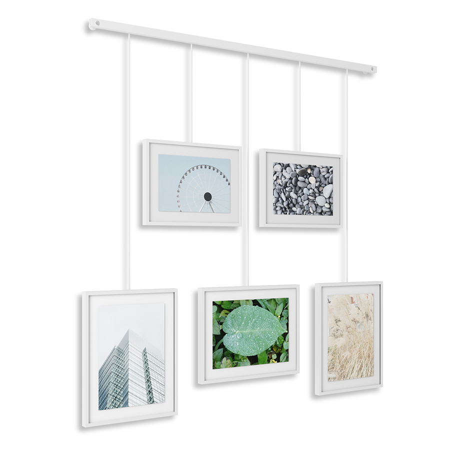 Дисплей состоит из 5 рамок, смонтированных по горизонтали под разным углом. Рамки выполнены из стали и покрыты черной порошковой краской. Каждый снимок или картинка прячется под стеклом. Все рамы зафиксированы на единой планке с помощью зажимов. Основание крепится к стене на шурупы и дюбели, которые входят в комплект.
