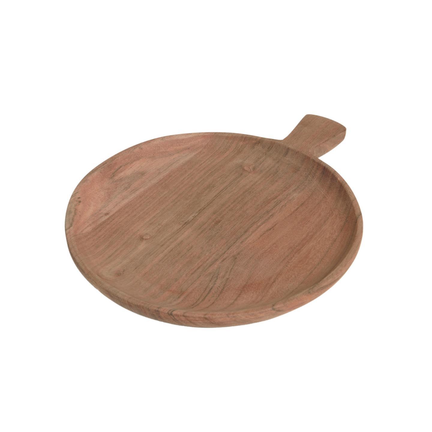 Поднос полностью сделан из массива акации в натуральной отделке. Он имеет круглую форму с загнутыми вверх краями.