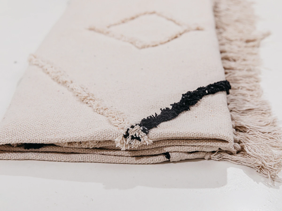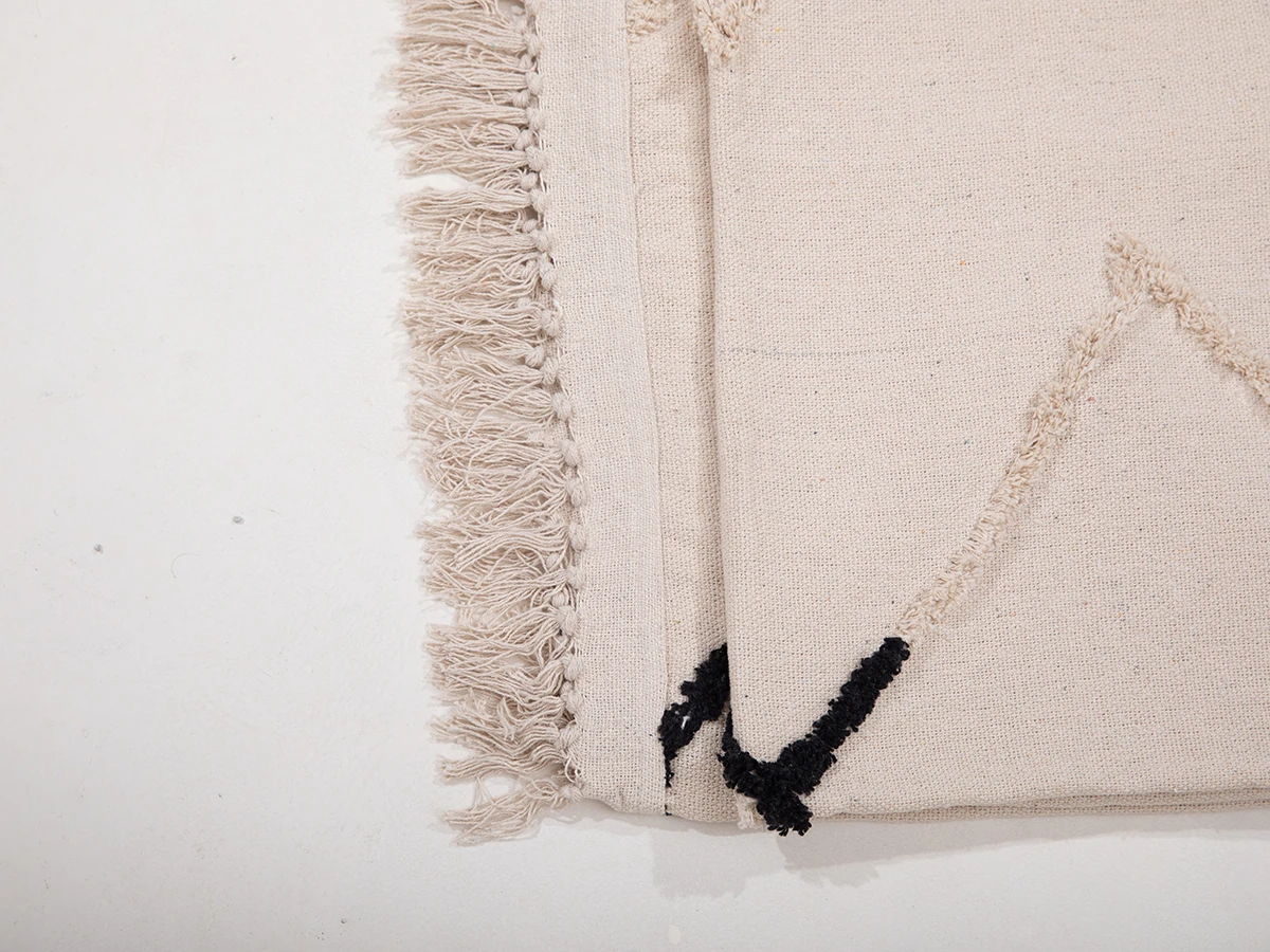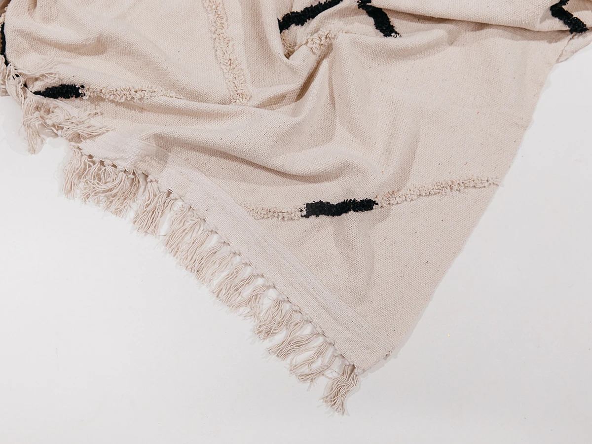 Бежевый плед из хлопка с бахромой и черными акцентами. Плед гармонично впишется в любой актуальный интерьер. Его универсальность сочетается с современными тенденциями дизайна и подойдет как для спокойных, безмятежных аранжировок, так и для эффектных обстановок с экспрессией.