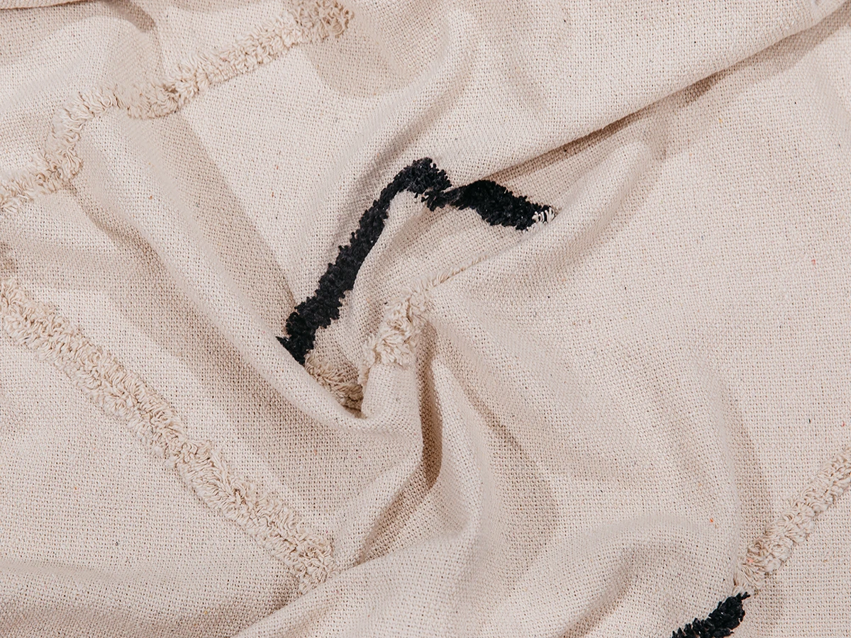 Безупречно будет смотреться в спальне, гостиной, детской. Разместите его рядом с диванной зоной, чтобы вы или ваши гости в любой момент могли ощутить его мягкость и тепло. Хлопок — натуральный, гипоаллергенный материал, который дарит приятные тактильные ощущения, и при этом прочный и долговечный. Фактурная геометрия, черные контрастные элементы дадут пространству глубины и объёма.
