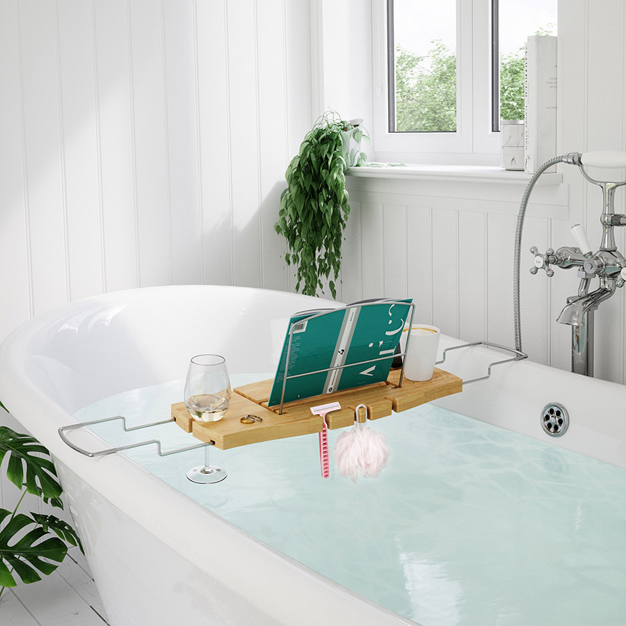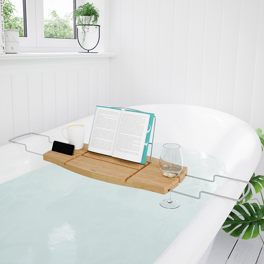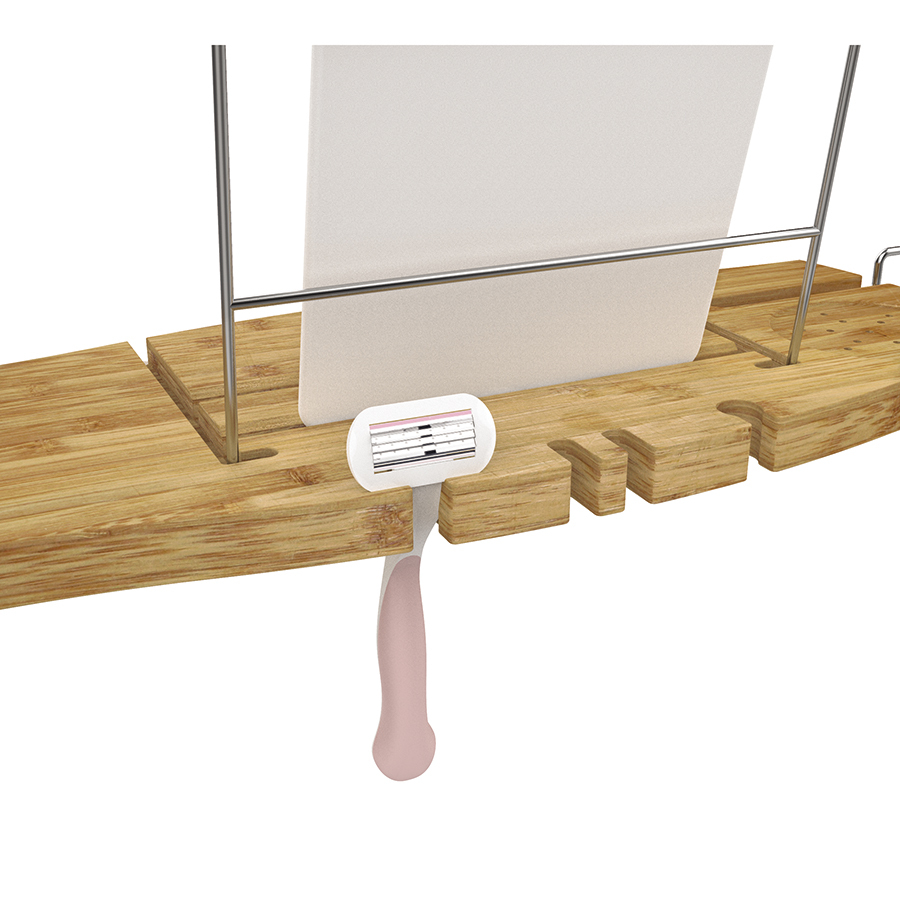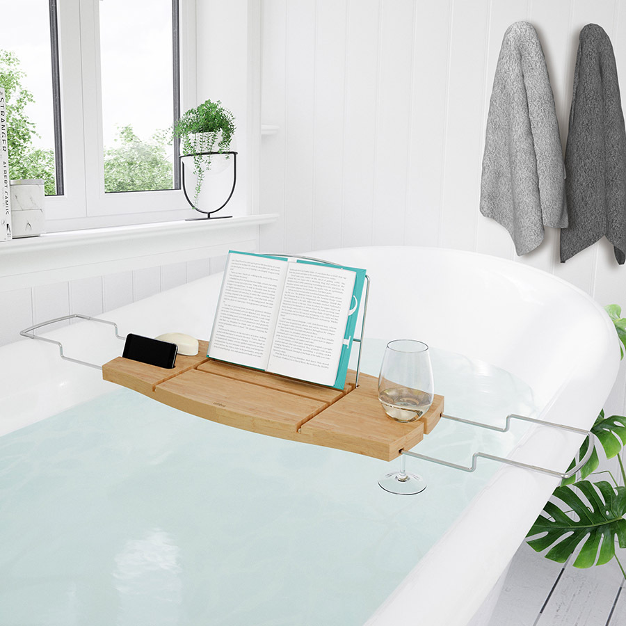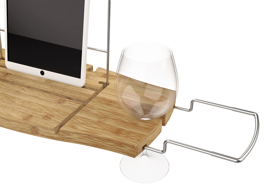 Полка оснащена встроенной мыльницей, прорезью для бокала с вином, подставкой для книги или iPad, отверстием для телефона и держателем для бритвенного станка. Аксессуар выполнен из экологически чистого бамбука, который отличается стойкостью к повышенной влажности. Благодаря выдвижным хромированным кронштейнам полку можно устанавливать на любую ванную шириной до 94 см.