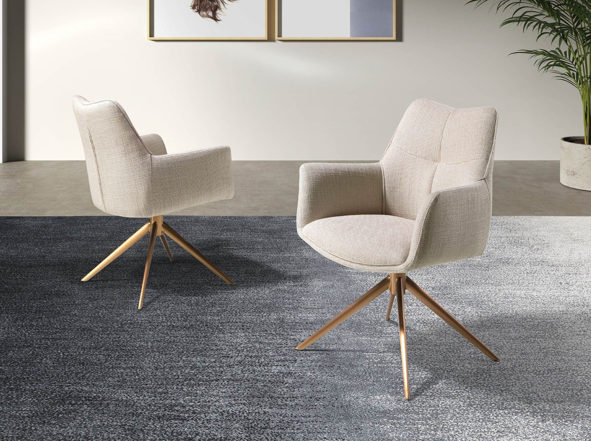 Современный поворотный стул с подлокотниками, сиденьем и спинкой, обитыми кремовой тканью. Ножки из нержавеющей стали бронзового цвета, сочетающие в себе авангардный и вневременной стиль, делают его незаменимым элементом вашей кухни или столовой. Этот стул Angel Cerdá сочетает в себе уникальный и индивидуальный стиль бренда с максимальным комфортом и устойчивостью благодаря высокому качеству обивки и оригинальной конструкции ножек.