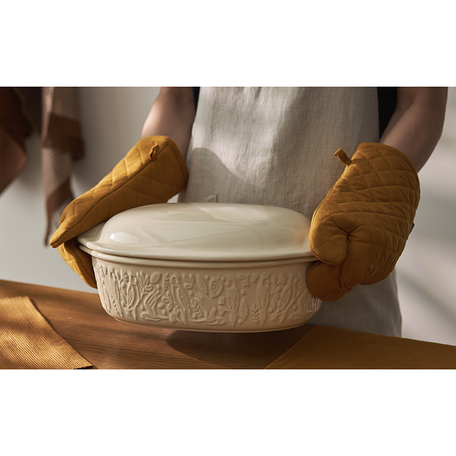 Прихватка-варежка цвета карри из коллекции Essential – универсальный кухонный аксессуар, который непременно пригодится во время приготовления пищи. Внешняя и внутренняя поверхности изделия выполнены из прочного, гипоаллергенного 100% хлопка. В качестве наполнителя используется плотный полиэстер. Благодаря такому сочетанию материалов прихватка не нагревается даже при длительном контакте с горячими поверхностями. Предусмотрена специальная петелька для подвешивания.