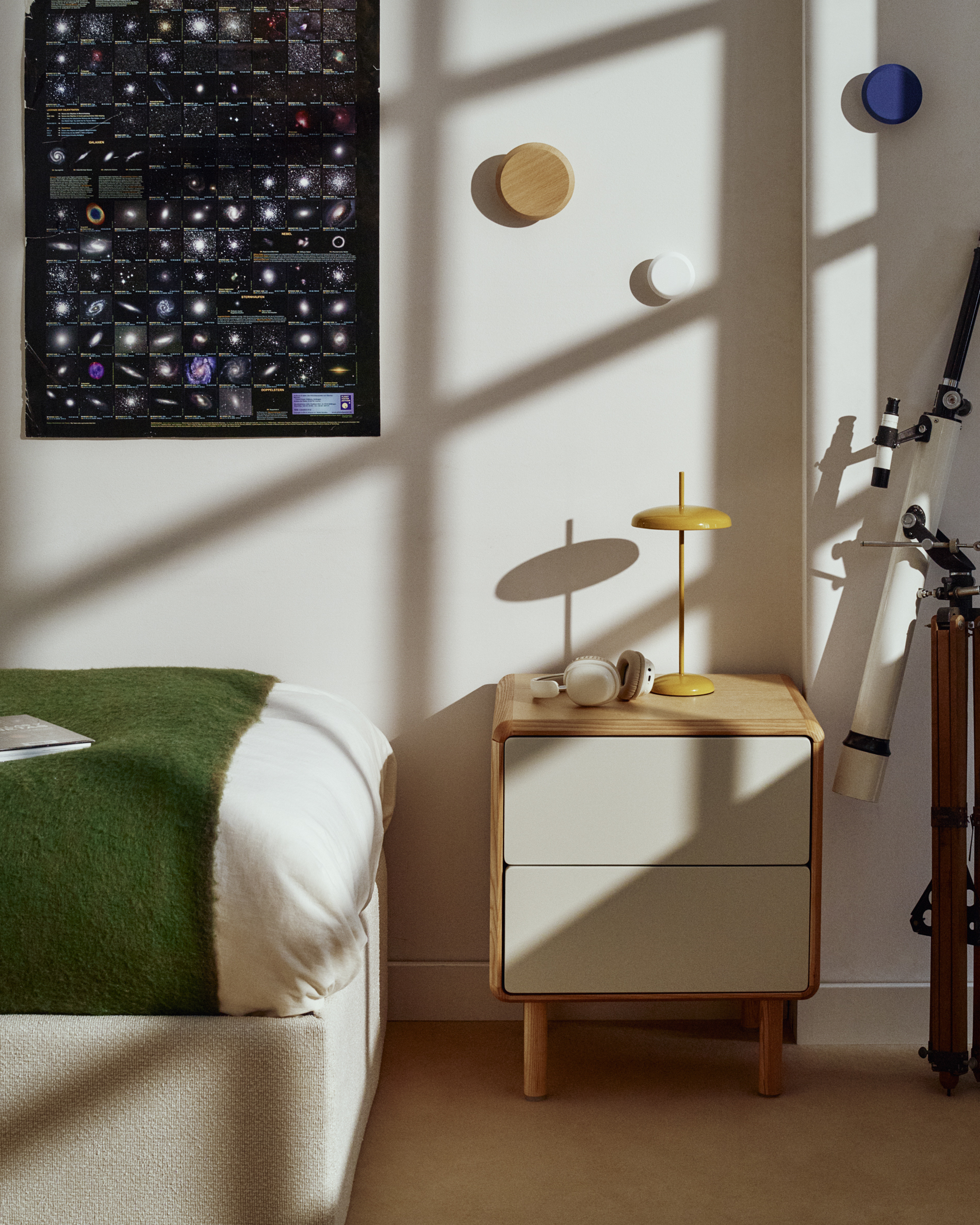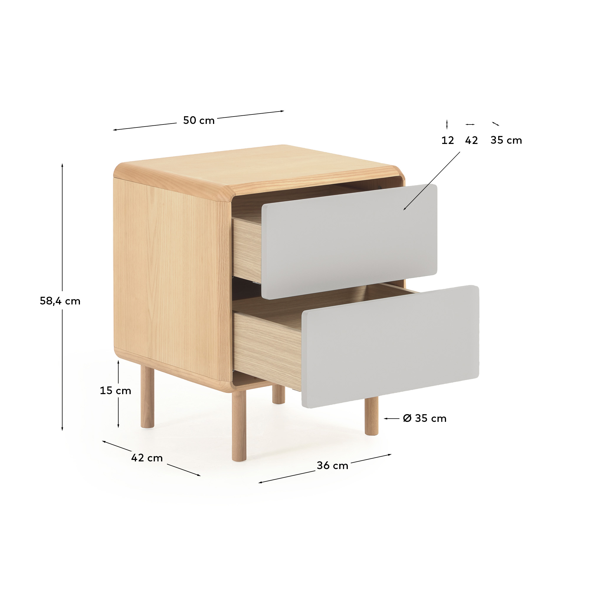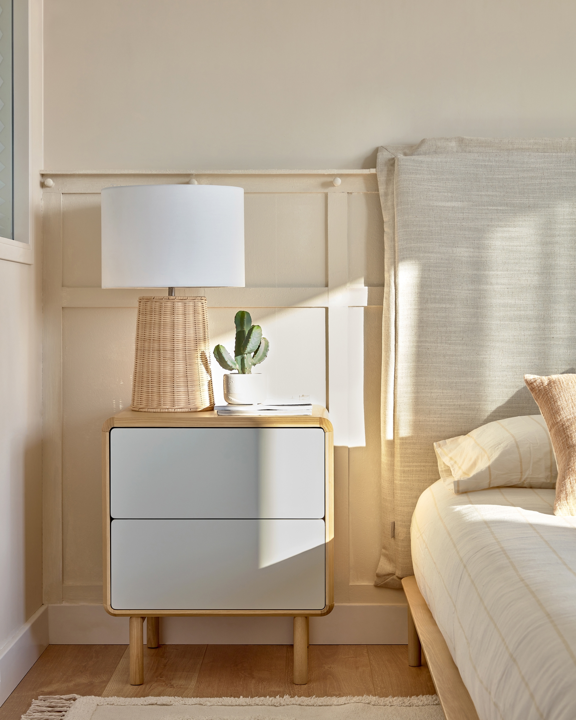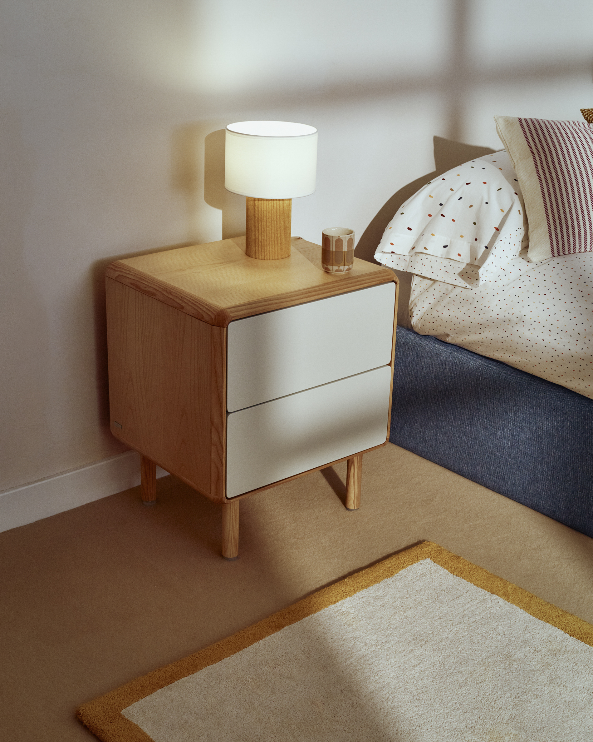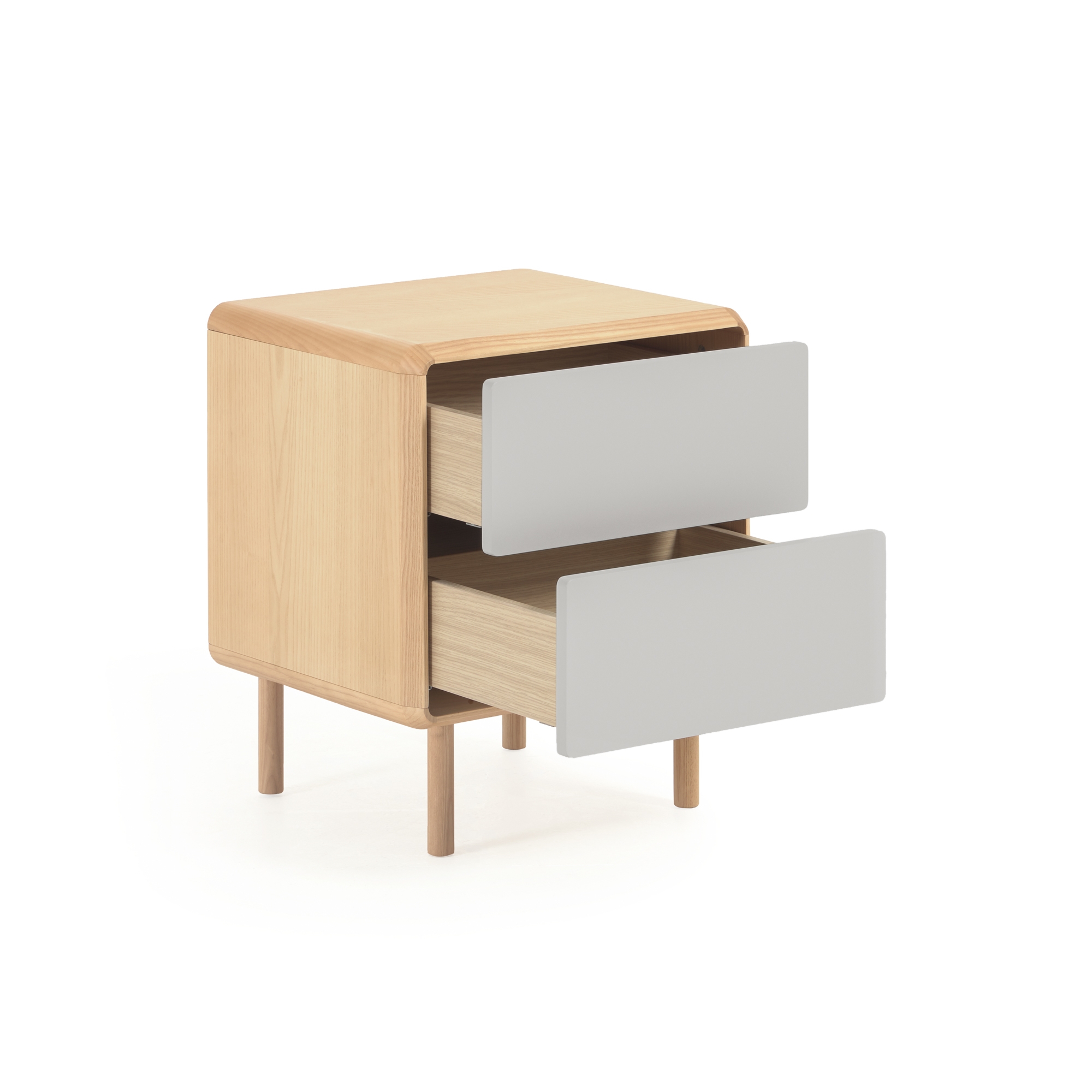 Прикроватная тумба из шпона ясеня с ножками и каркасом из массива ясеня. Ящики с плавным закрыванием, механизмом открывания push-to-open и регулируемыми ножками. Фасад окрашен в серо-белый цвет.