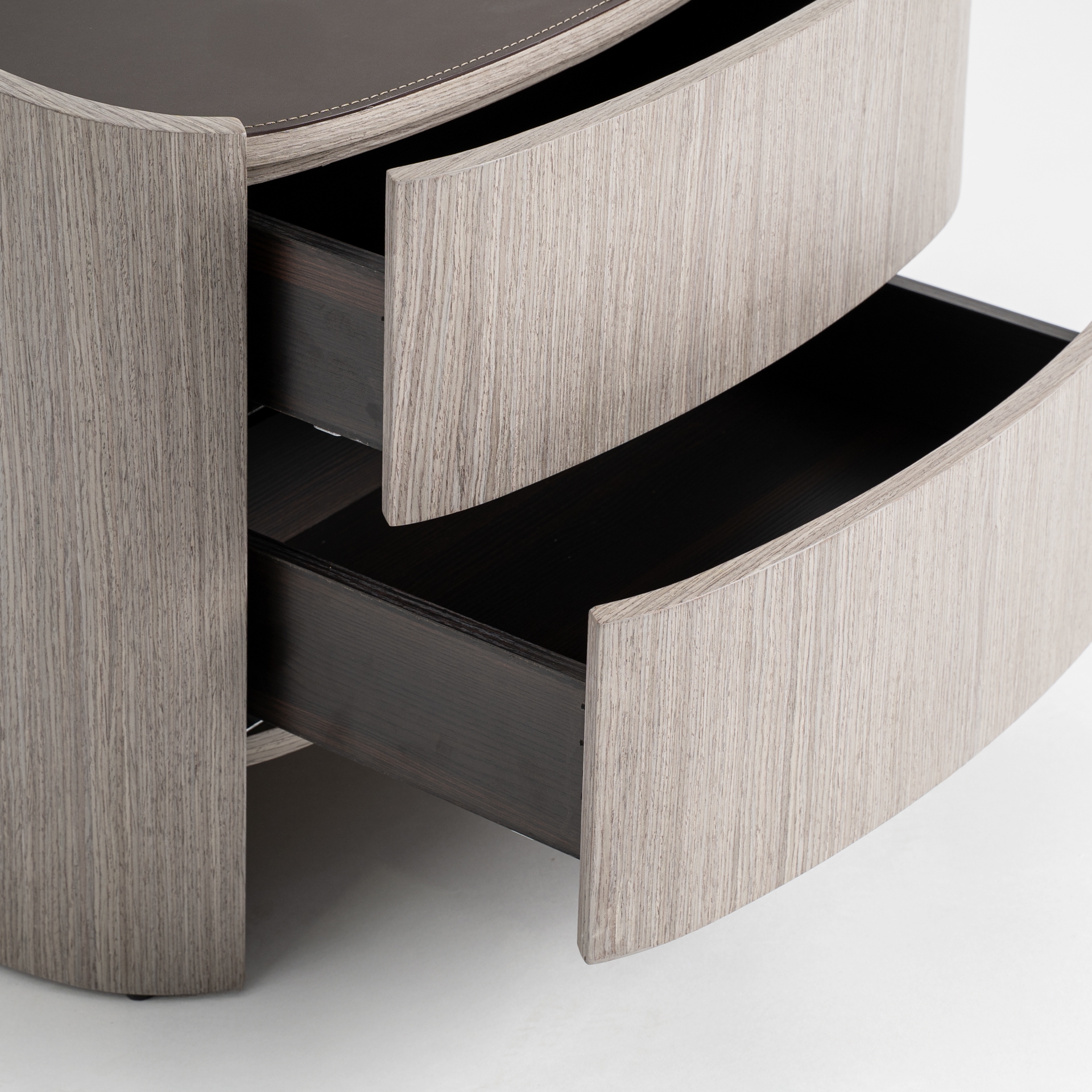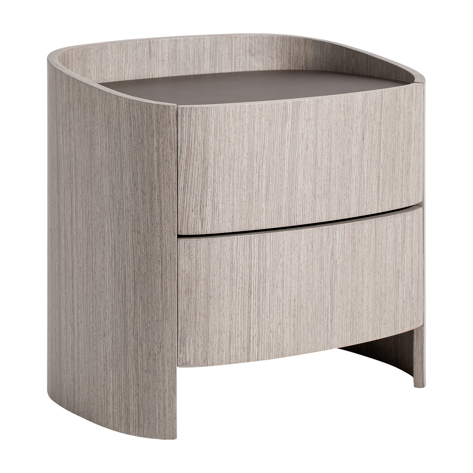 Прикроватная тумбочка в современном стиле Буркина-Фасо, изготовленная из серой фанеры в сочетании с серым дубовым шпоном и серой кожей.
