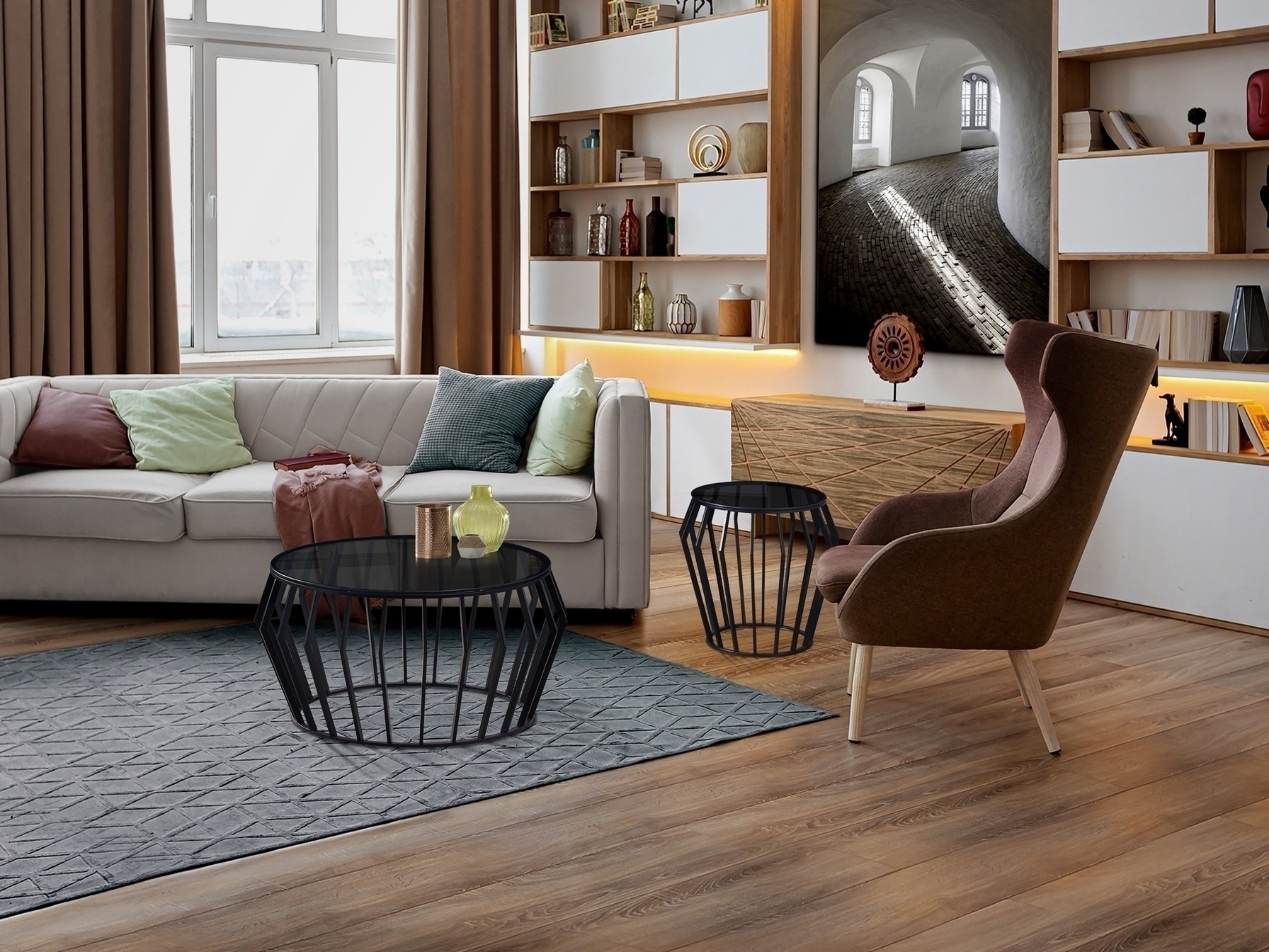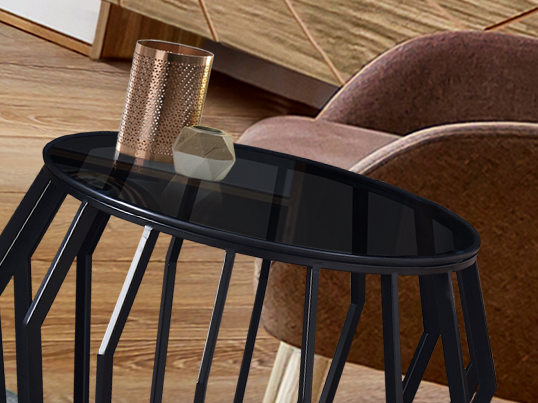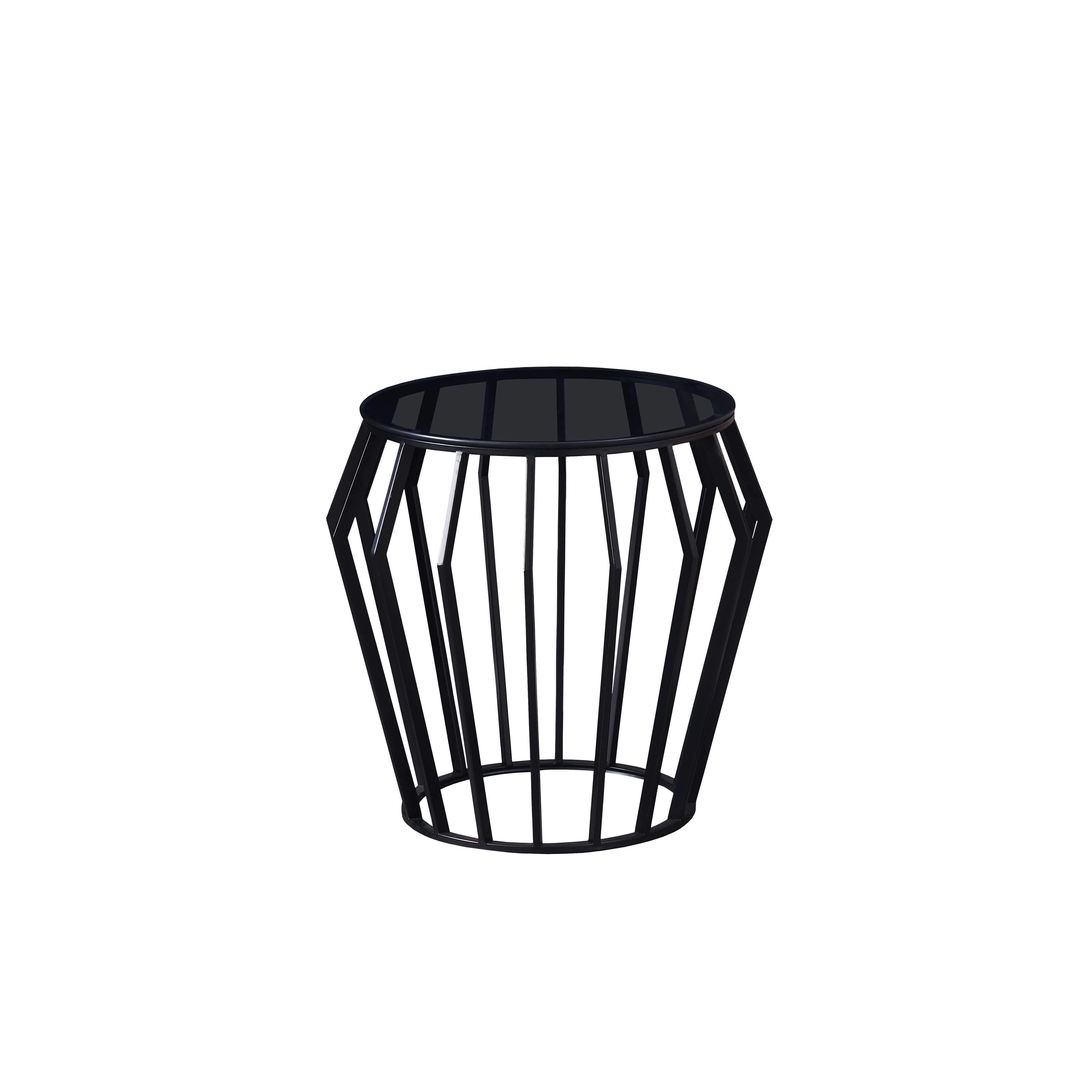 Стол-подставка из металла, черная матовая отделка. Верхняя часть из дымчатого стекла толщиной 8 мм.