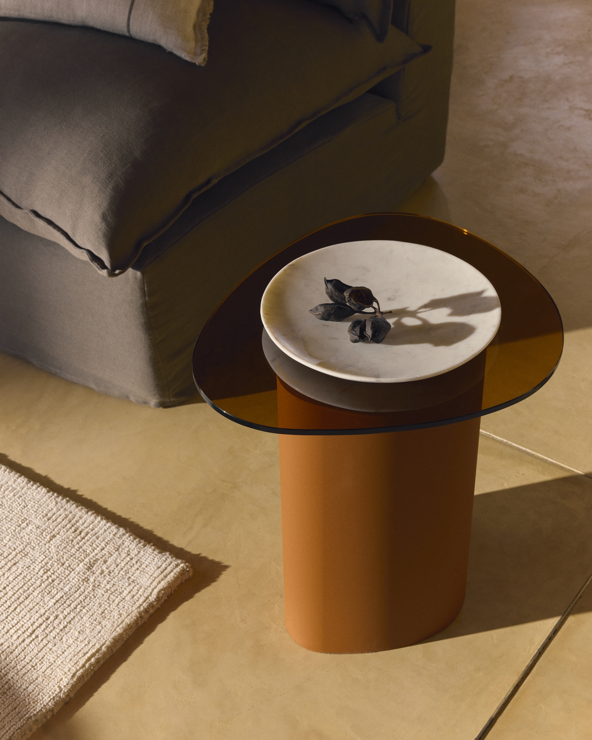 Стол Olir сочетает в себе стальное основание с глянцевой отделкой и столешницу из тонированного закаленного стекла, создавая изделие с органичными линиями. Скульптурная форма основания придает изделию характер и устойчивость, а стекло смягчает общий вид и пропускает свет, создавая ощущение легкости. Стальное основание покрыто порошковой краской, которая защищает поверхность от ударов, царапин и износа. Столешница из тонированного закаленного стекла обеспечивает равномерное распределение цвета и однородную отделку.