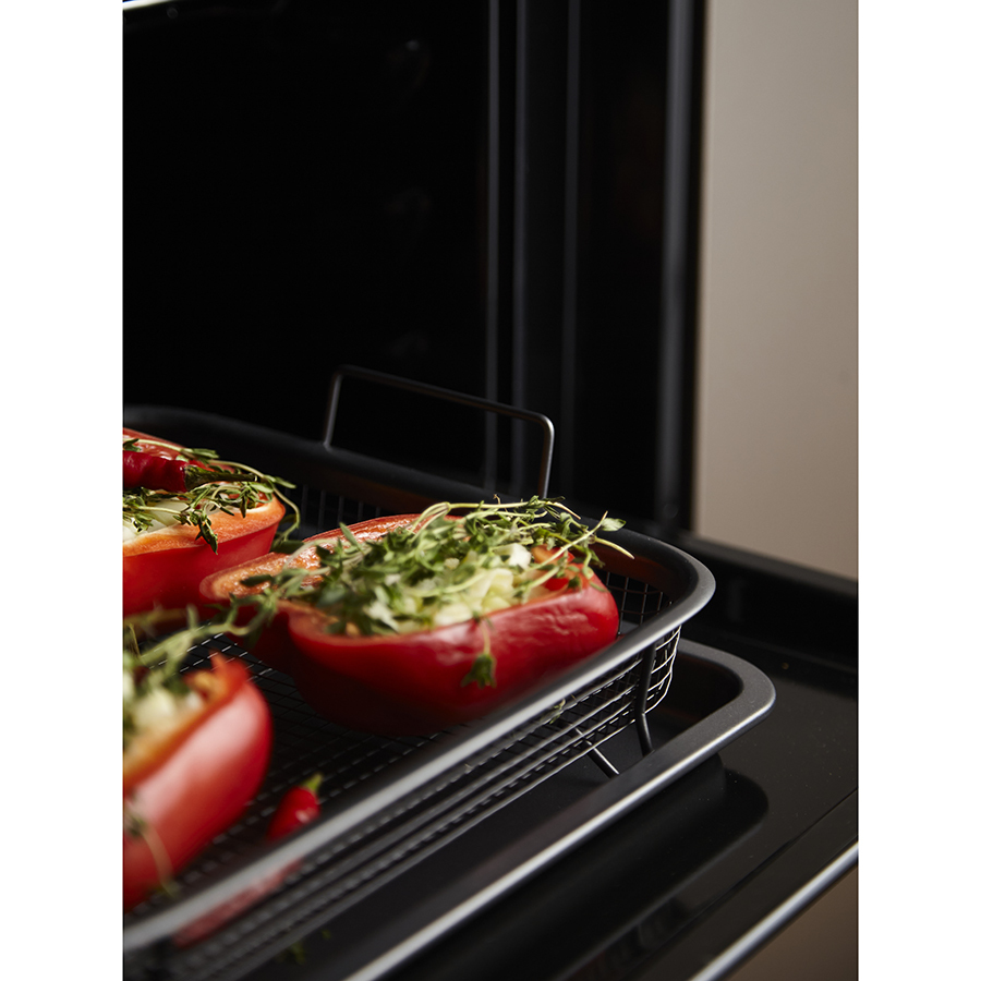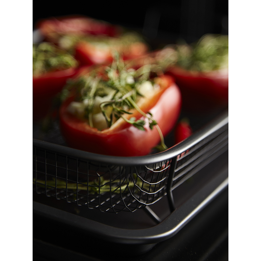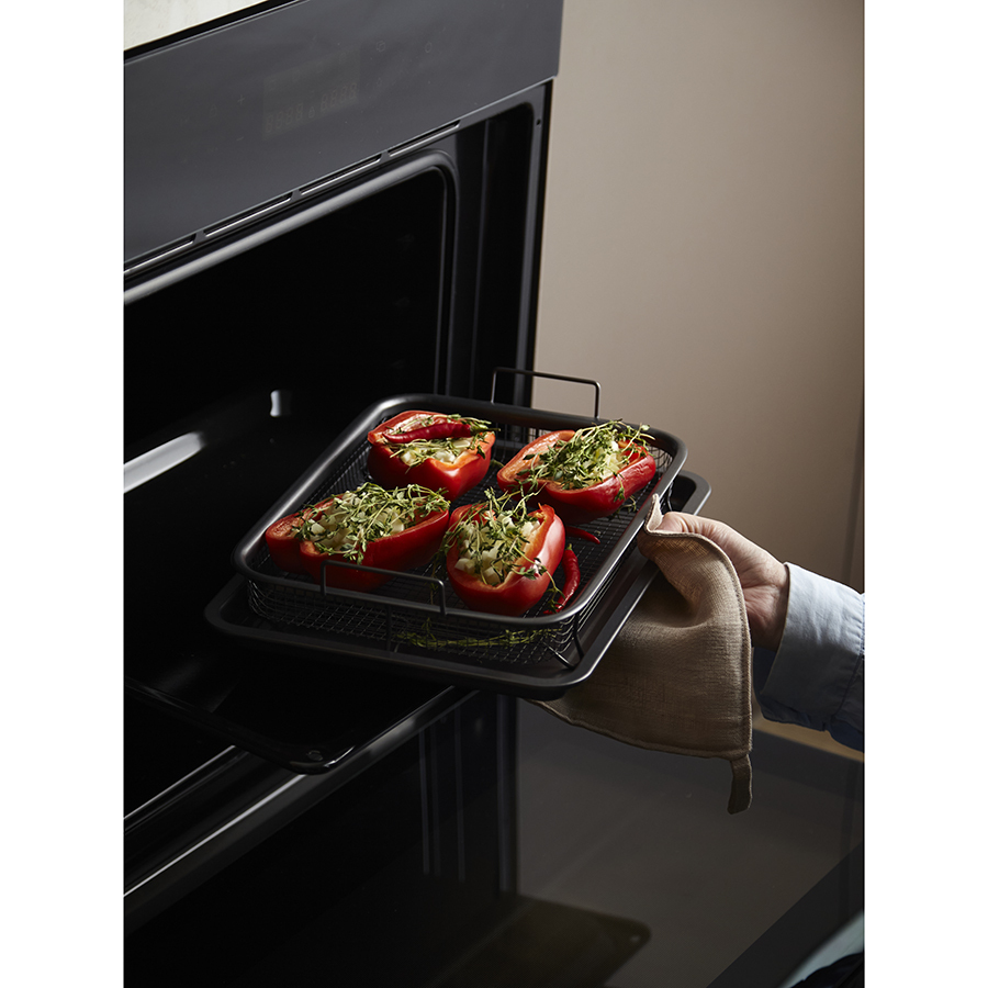 - Решетка на ножках обеспечивает циркуляцию жара 360°, что позволяет продуктам запекаться со всех сторон. Для получения хрустящей корочки рекомендуем использовать режим конвекции.