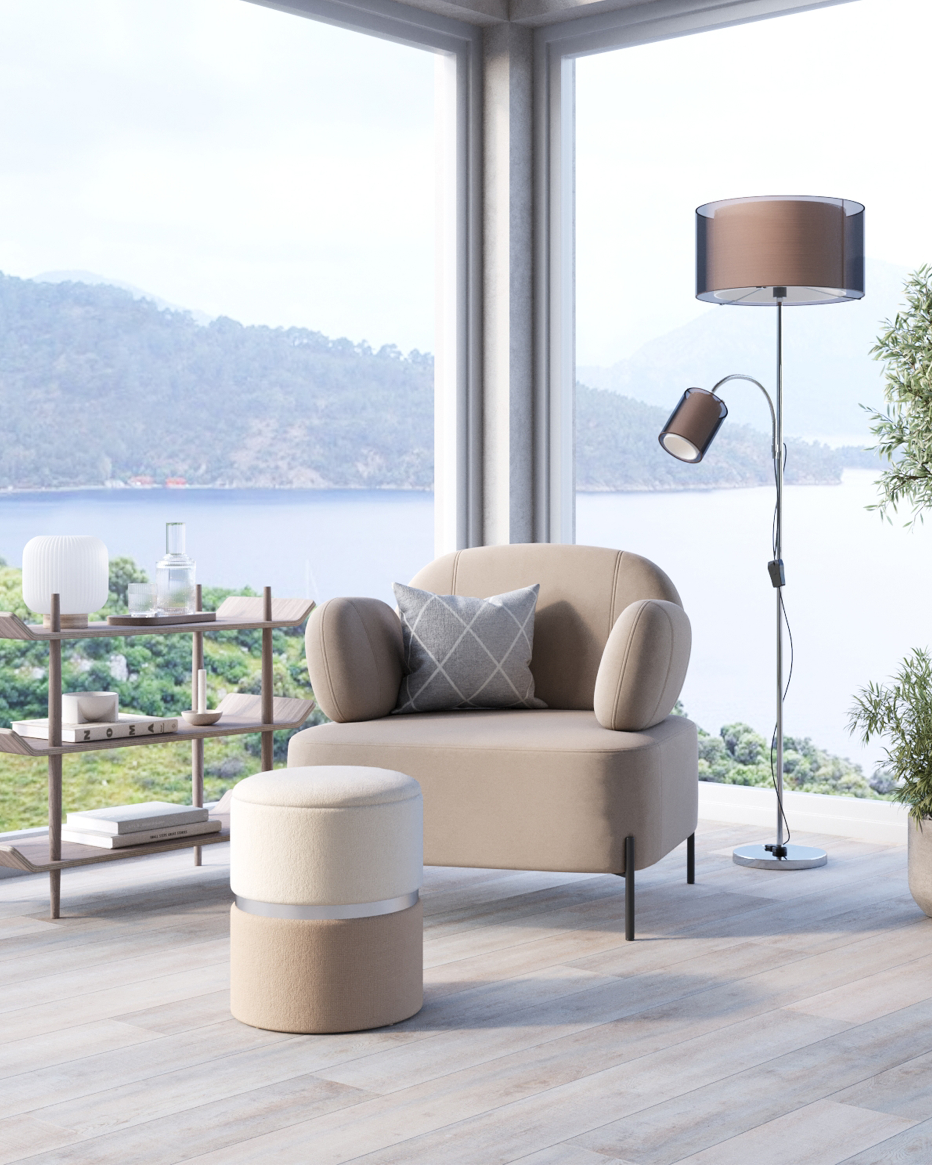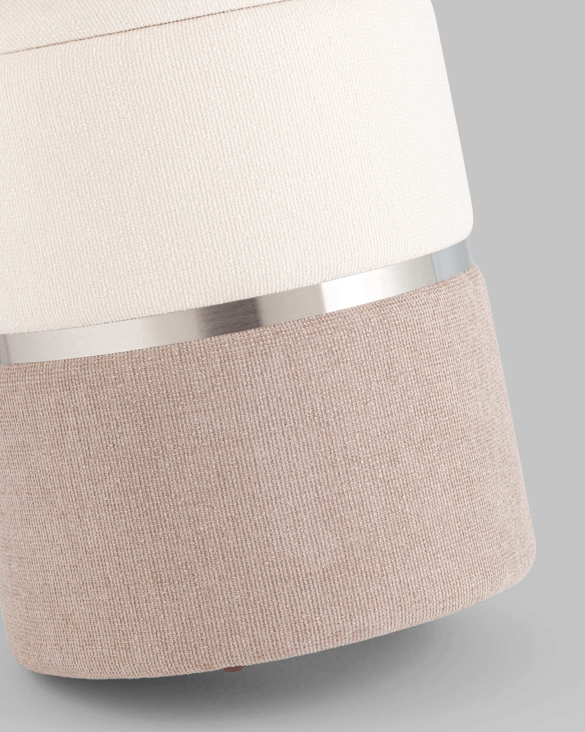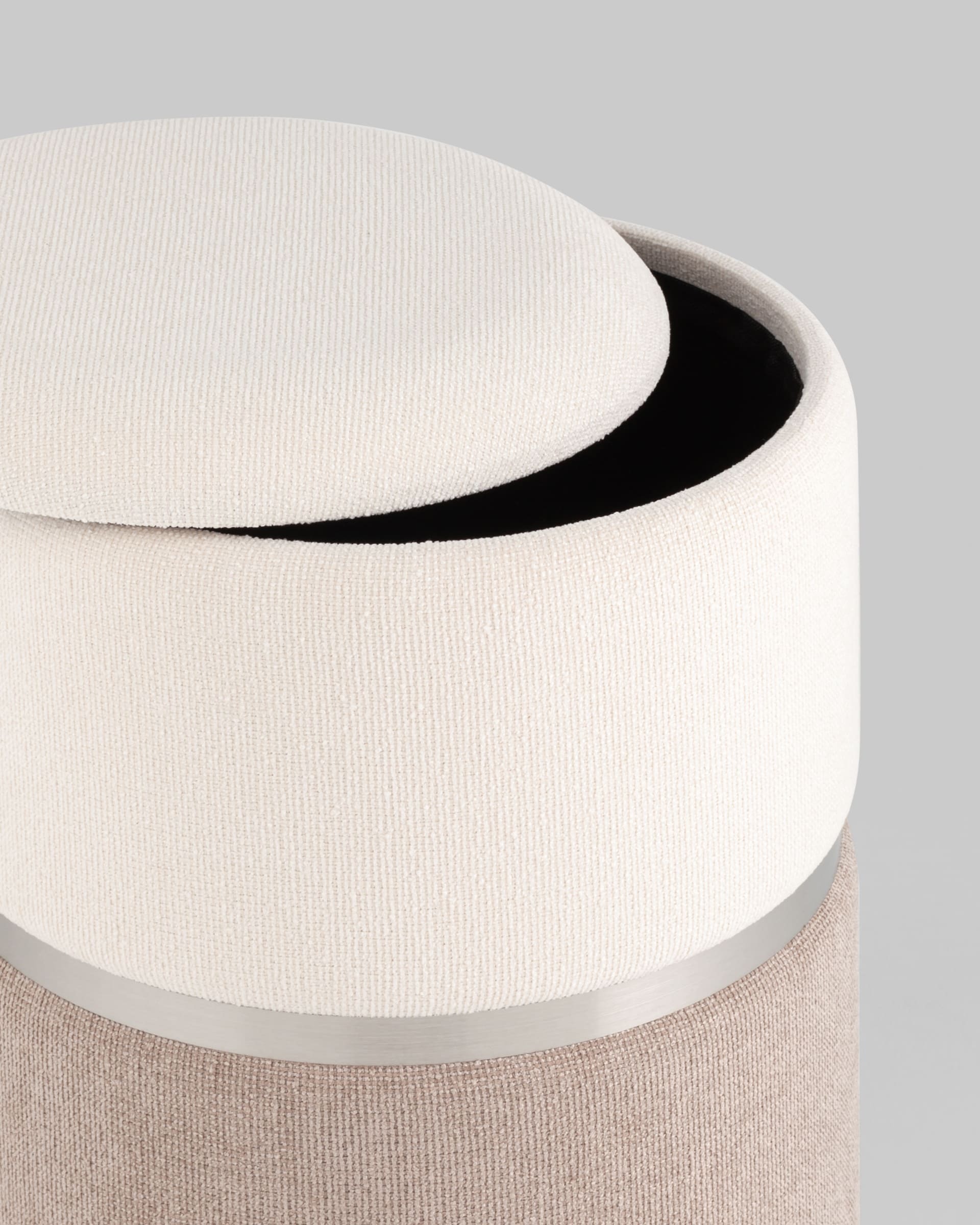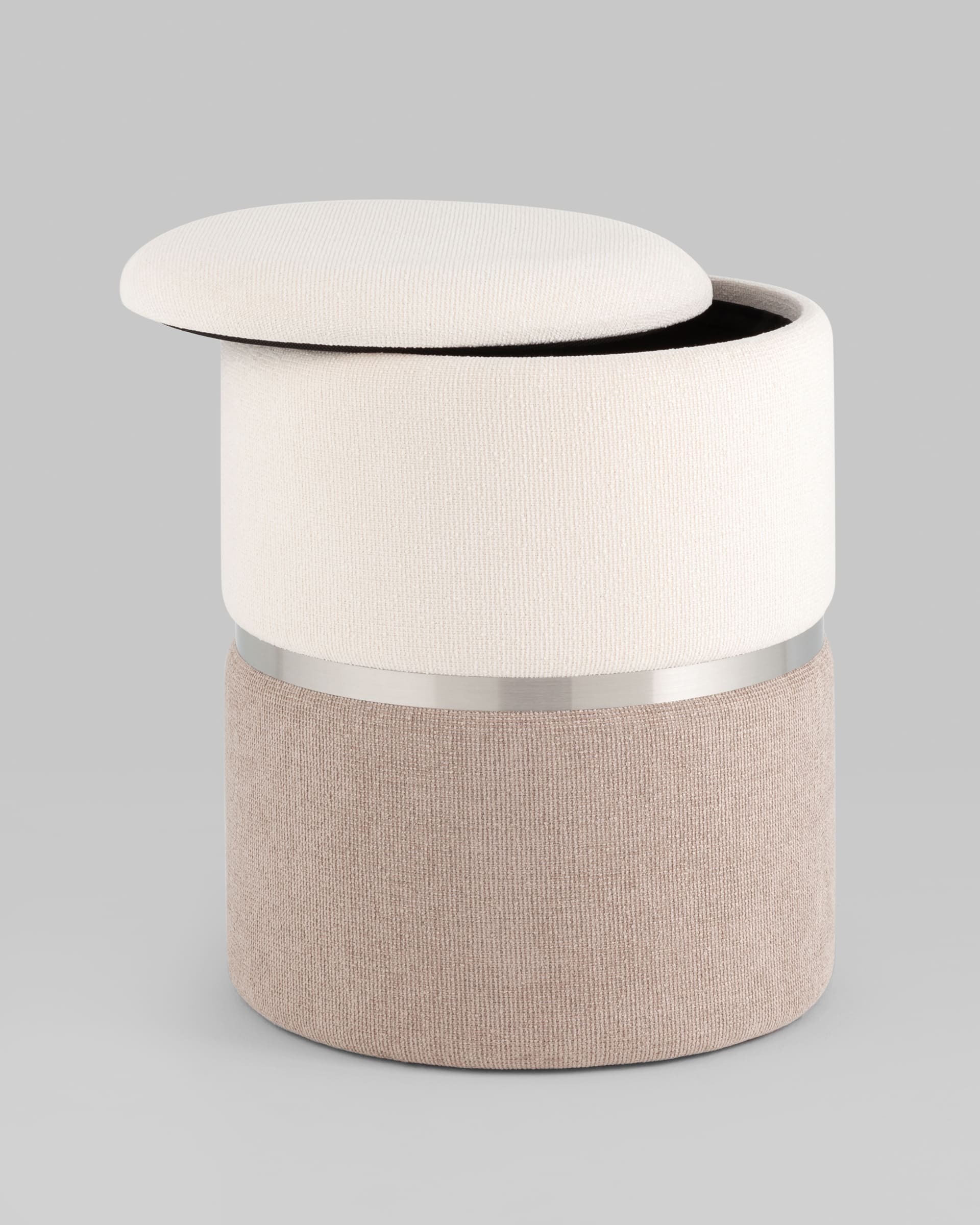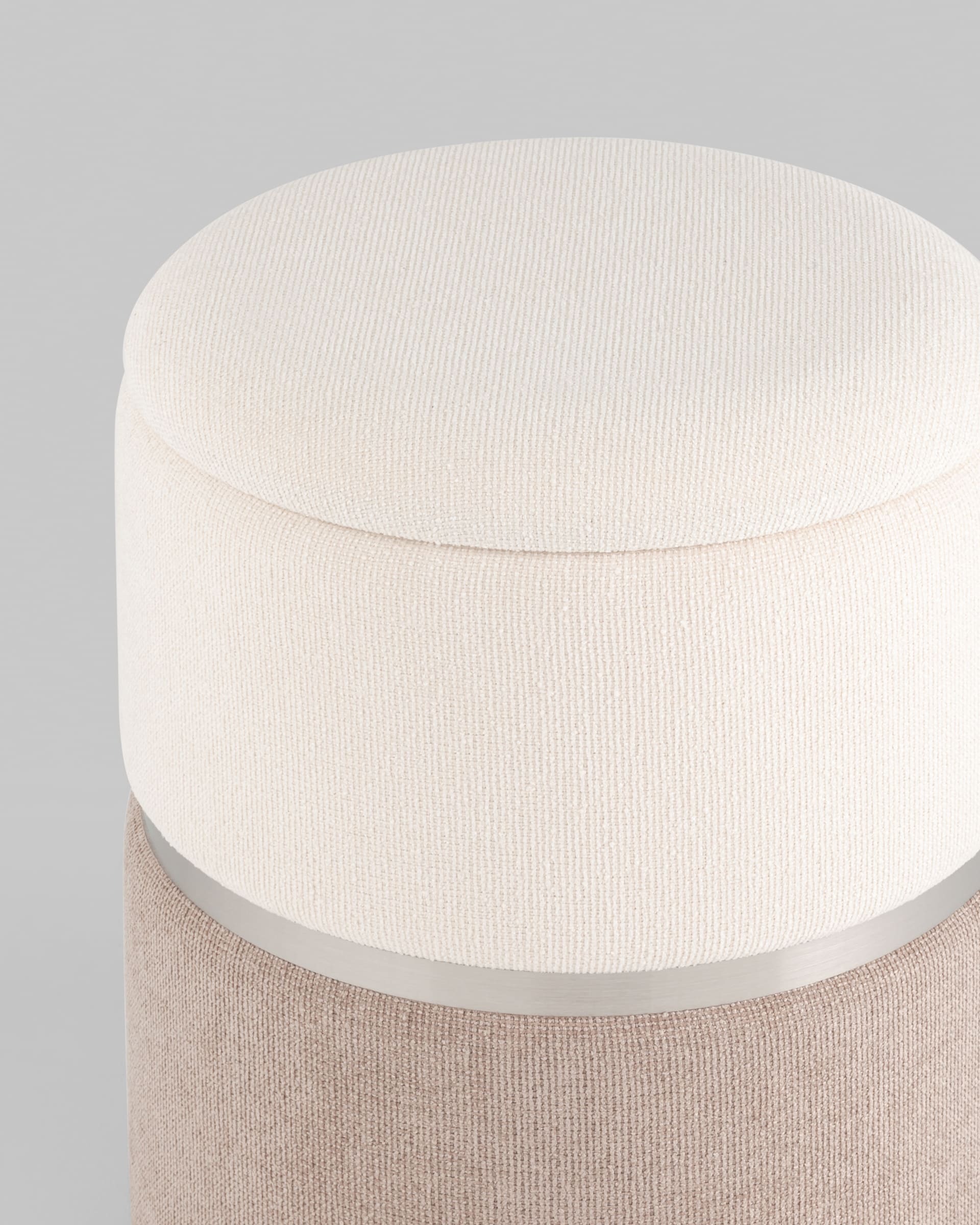 Пуф Кэрри с ящиком шенилл серо-бежевый с декоративным серебристым ободком