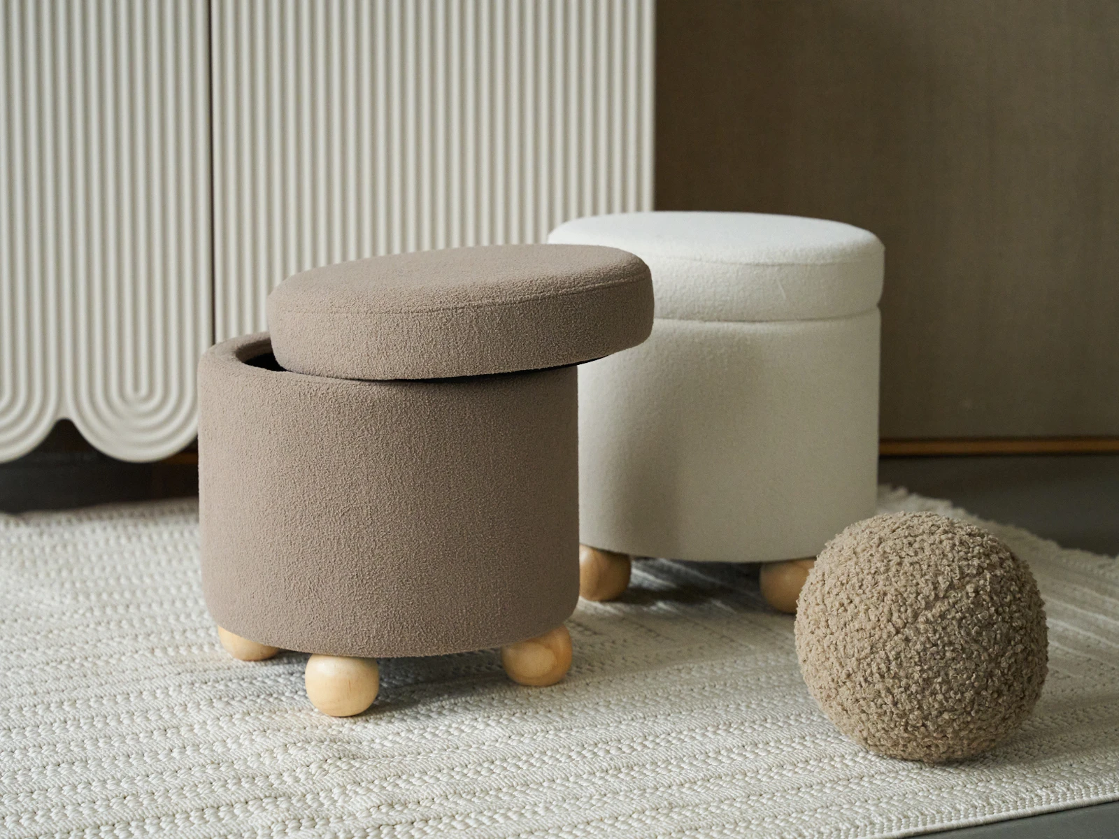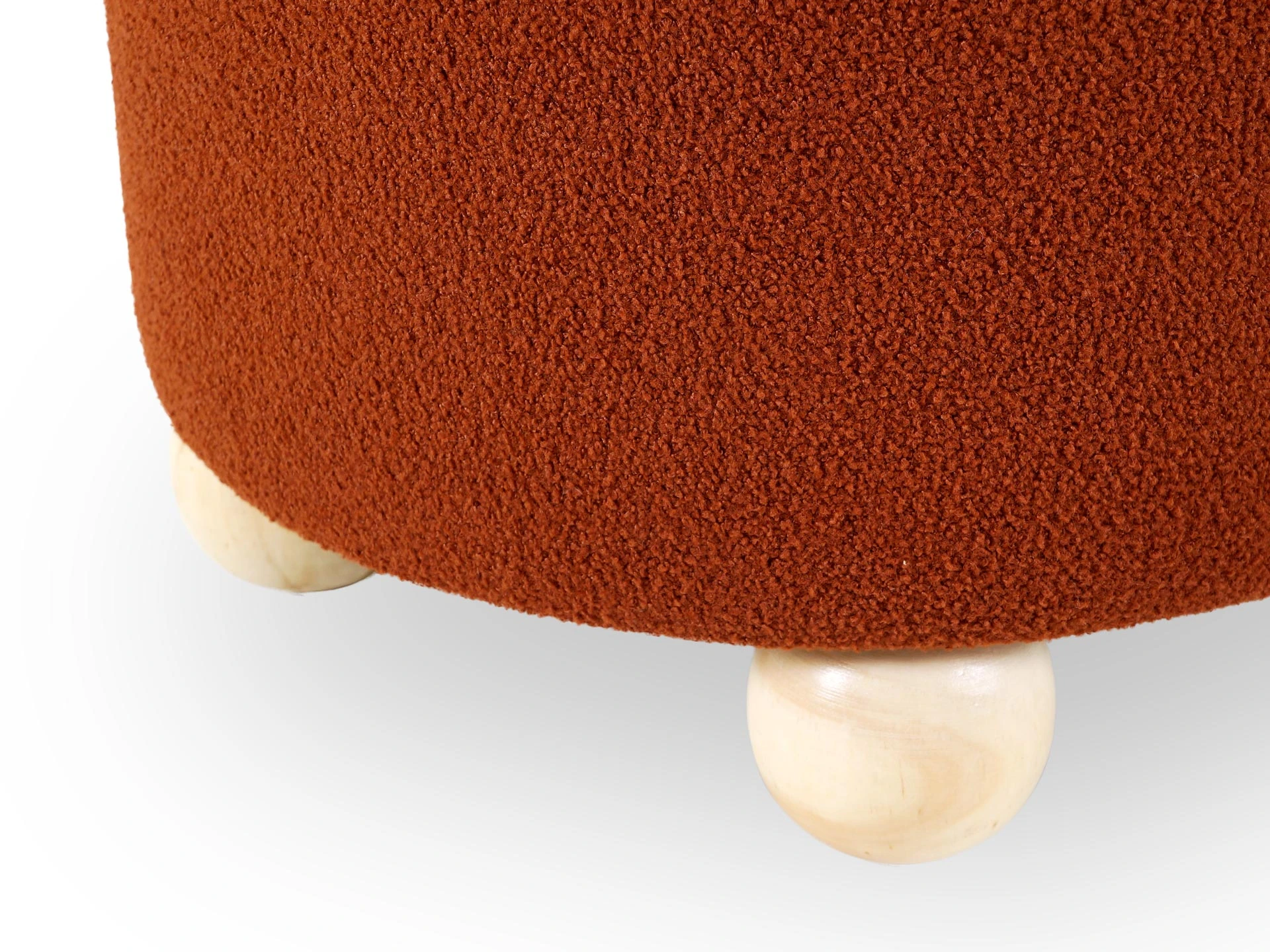 Материал обивки - искусственный мех, материал каркаса - массив дерева, материал опор - массив гевеи. Наличие подпятников, предохраняющие от появления царапин на полу.