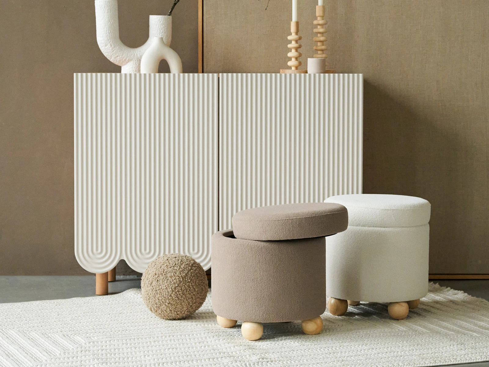 Материал обивки - искусственный мех, материал каркаса - массив дерева, материал опор - массив гевеи. Наличие подпятников, предохраняющие от появления царапин на полу.