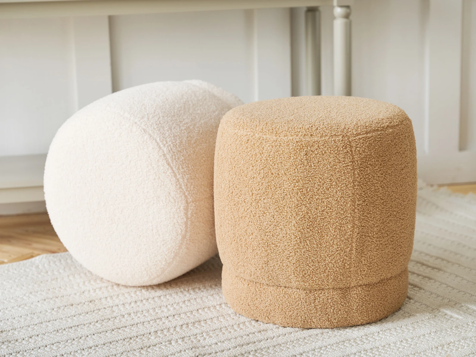 Материал обивки - искусственный мех, материал каркаса - массив дерева. Наличие подпятников, предохраняющие от появления царапин на полу.