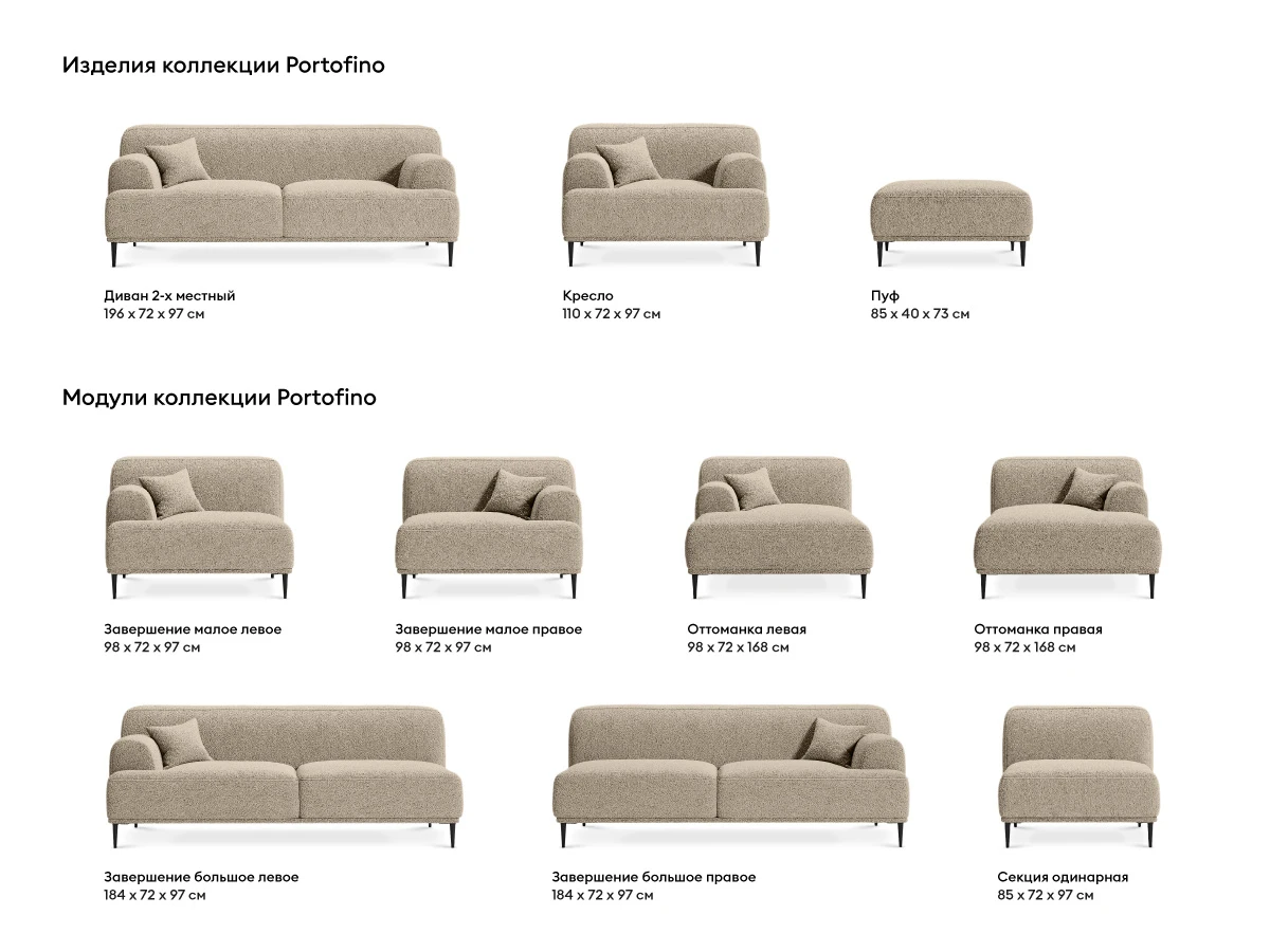 Модельный ряд Portofino поможет воплотить мечту о просторной гостиной или домашнем кинотеатре. Благодаря использованию поролона марки Memory Foam, модель отличается непревзойденной мягкостью. В основании изделий – металлические опоры с пластиковыми подпятниками. Это позволяет легко производить влажную уборку, не перемещая мебель. Каркас изделий состоит из деревянных брусков хвойных пород.