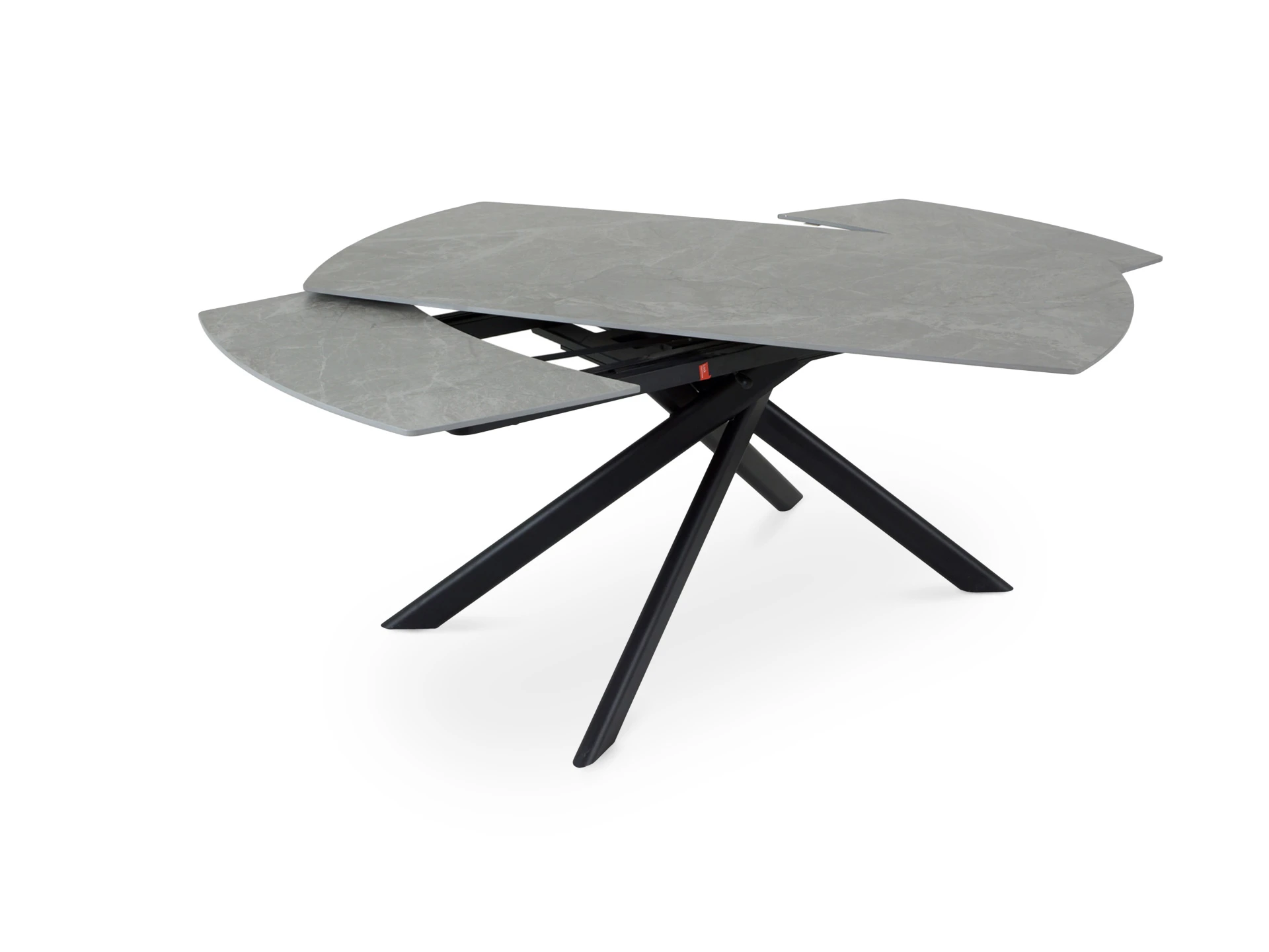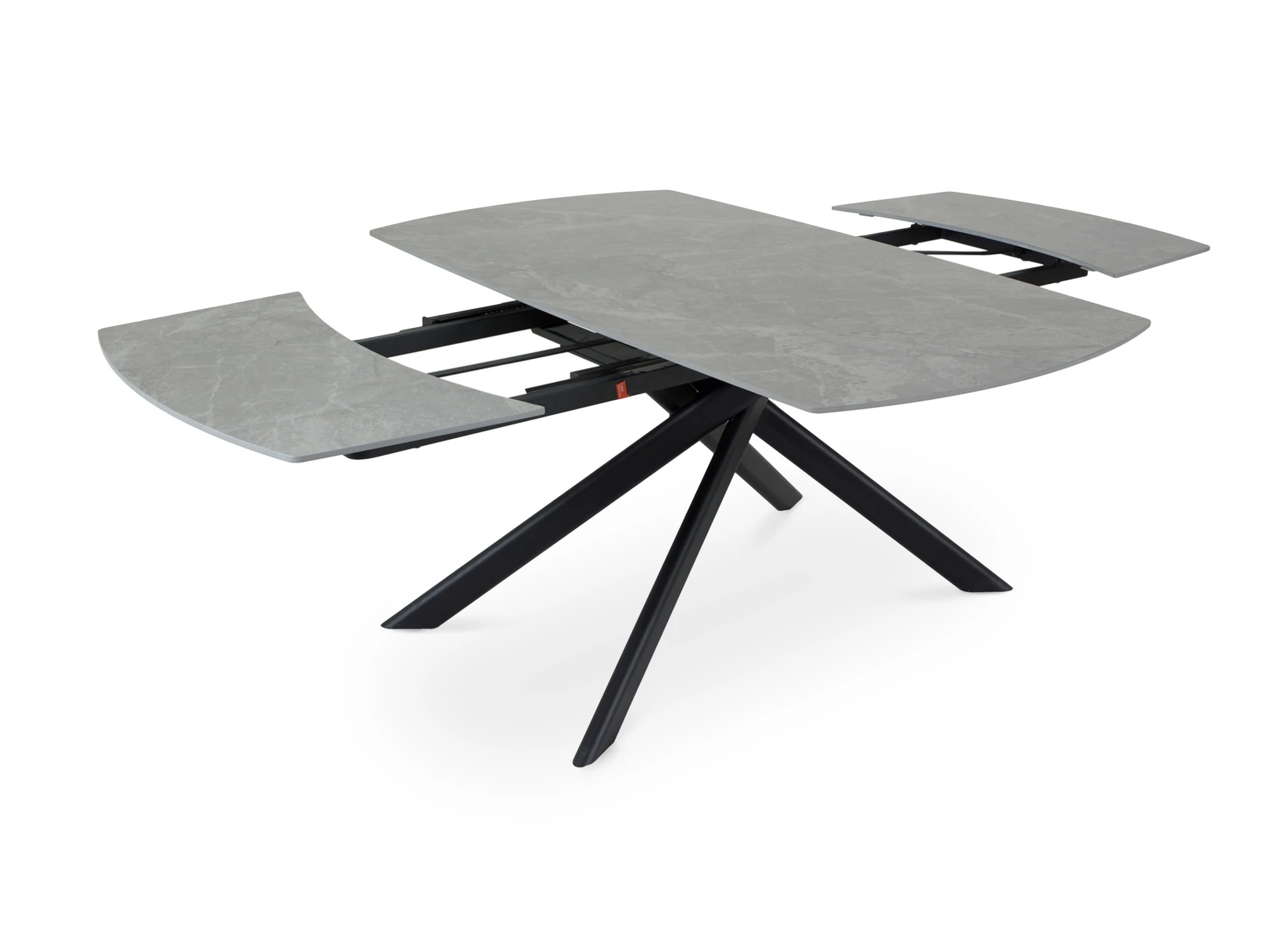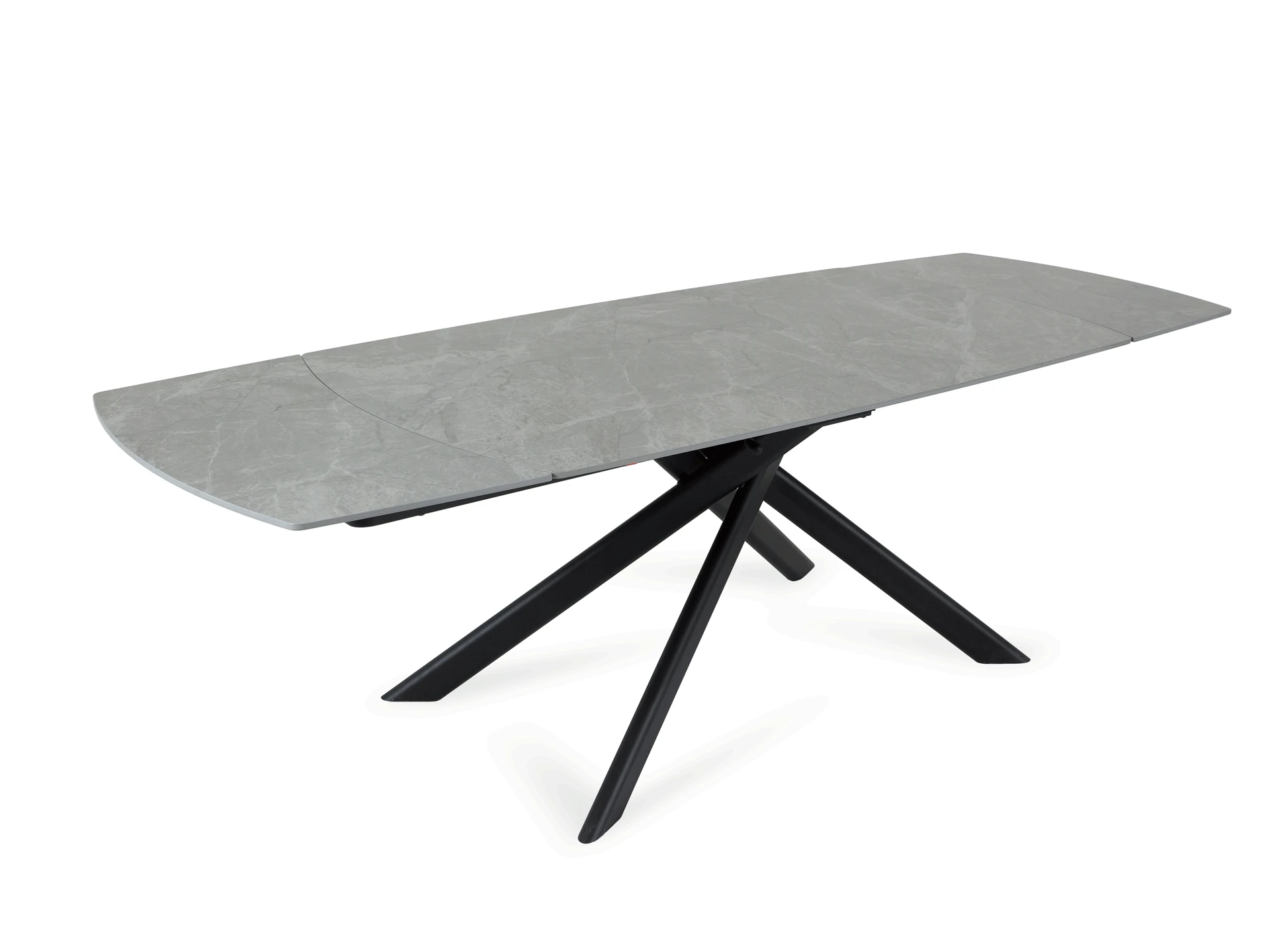 Обеденный раскладной стол с лаконичным характером для стильных интерьеров. Броский внешний вид смягчается плавными линиями и сбалансированными пропорциями. Четыре стальные опоры поддерживают столешницу арочной формы из керамики. Которая отличается прочностью, долговечностью и привлекательной текстурой, напоминающей натуральный камень. Минималистичная геометрия позволяет грамотно вписать предмет практически в любое пространство. Стол гармонично будет смотреться и в квартире, и в загородном доме.