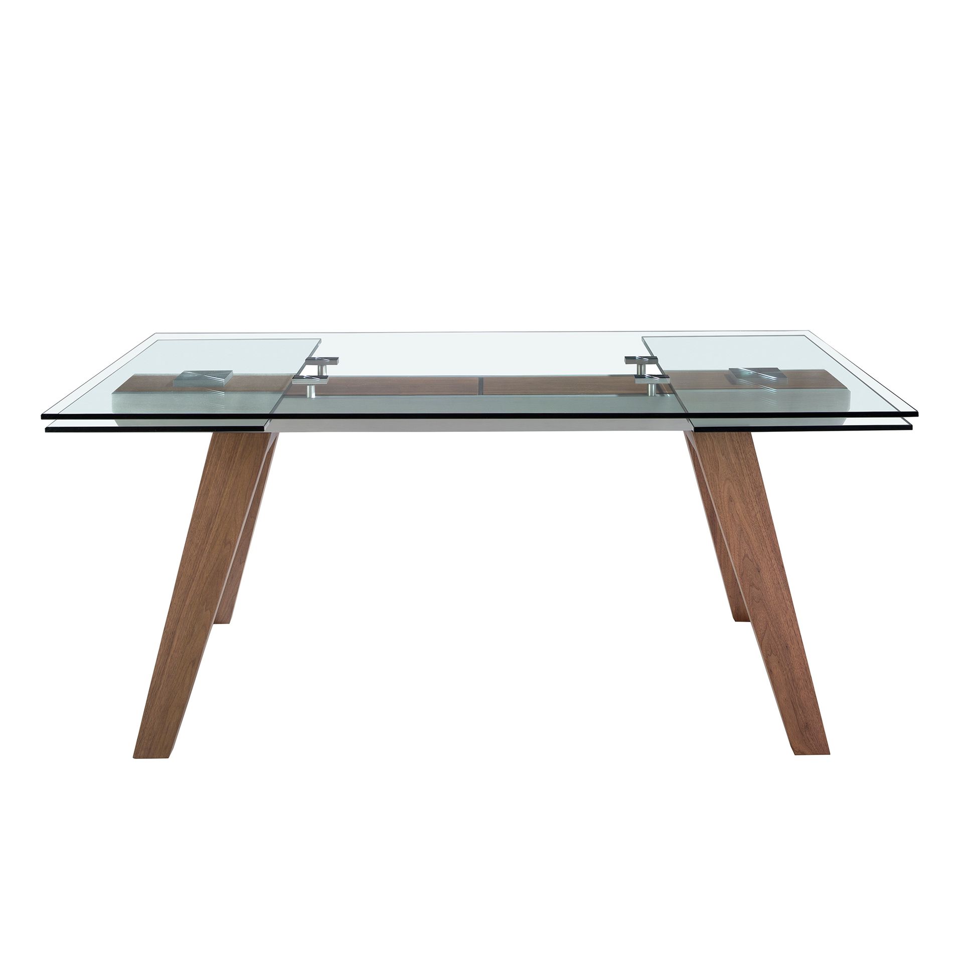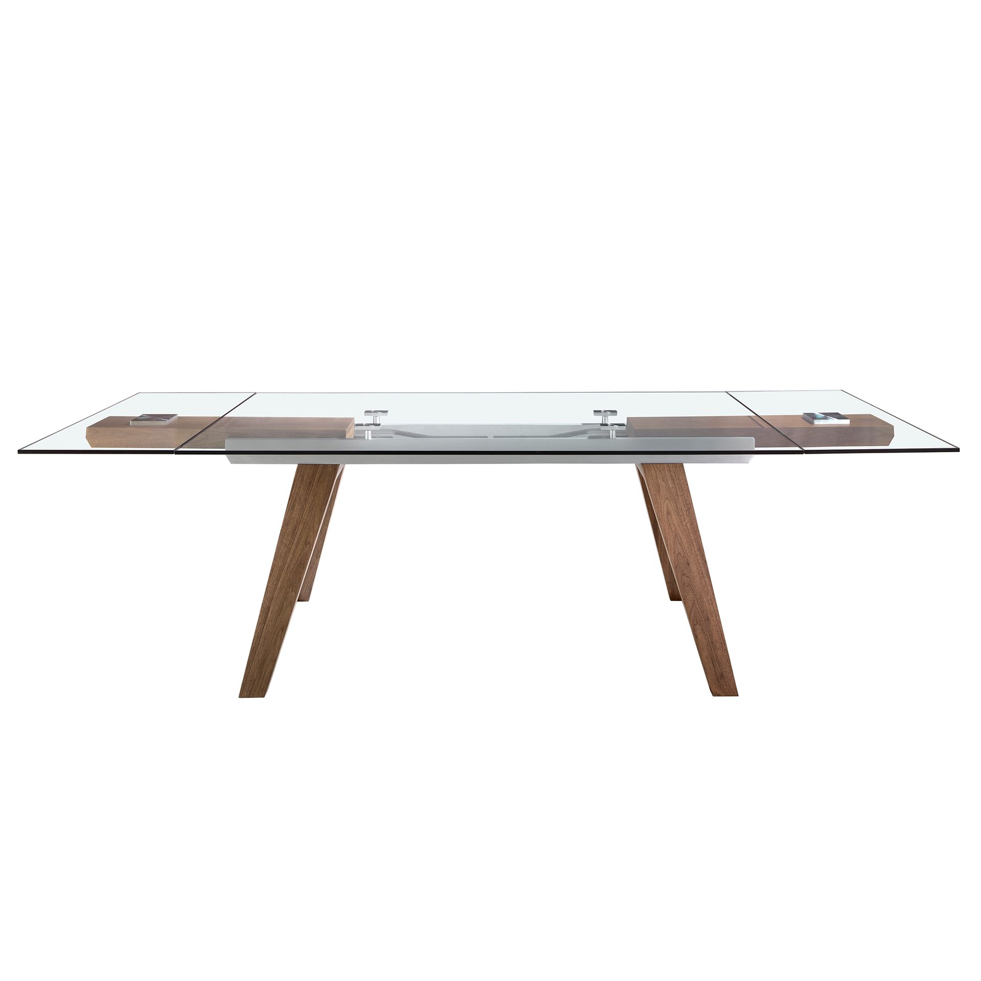 Чтобы увеличить площадь столешницы, необходимо из-под центрального стекла с одной или обеих сторон (по необходимости) выдвинуть дополнительные секции. Они плотно удерживаются на опоре снизу, обеспечивая равномерное распределение нагрузки.