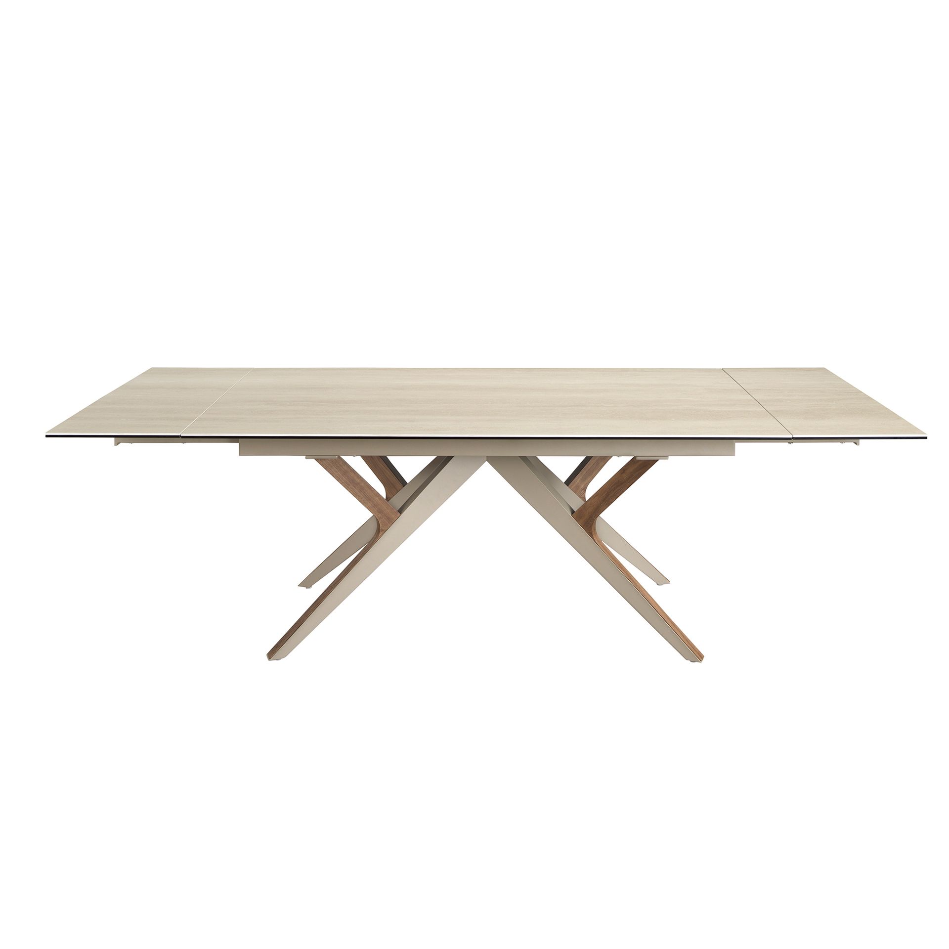 Прямоугольный раздвижной обеденный стол современного дизайна со столешницей из керамогранита песочного цвета с матовой отделкой. Ножки из нержавеющей стали, окрашенные в песочный цвет с металлическим эффектом, и натуральный шпон ореха толщиной 0,5 мм, а также возможность адаптации делают его полностью функциональным и универсальным предметом мебели для повседневного использования.