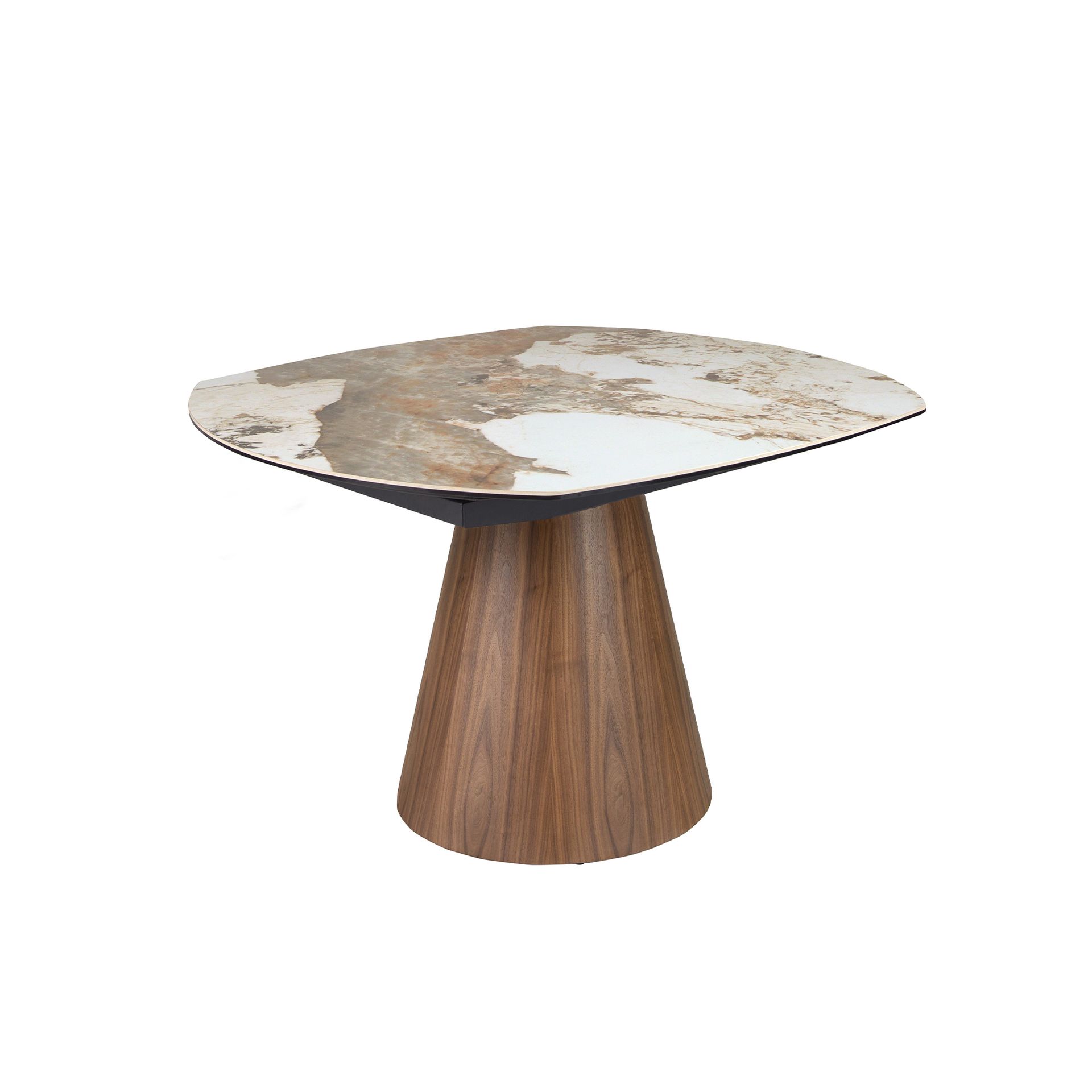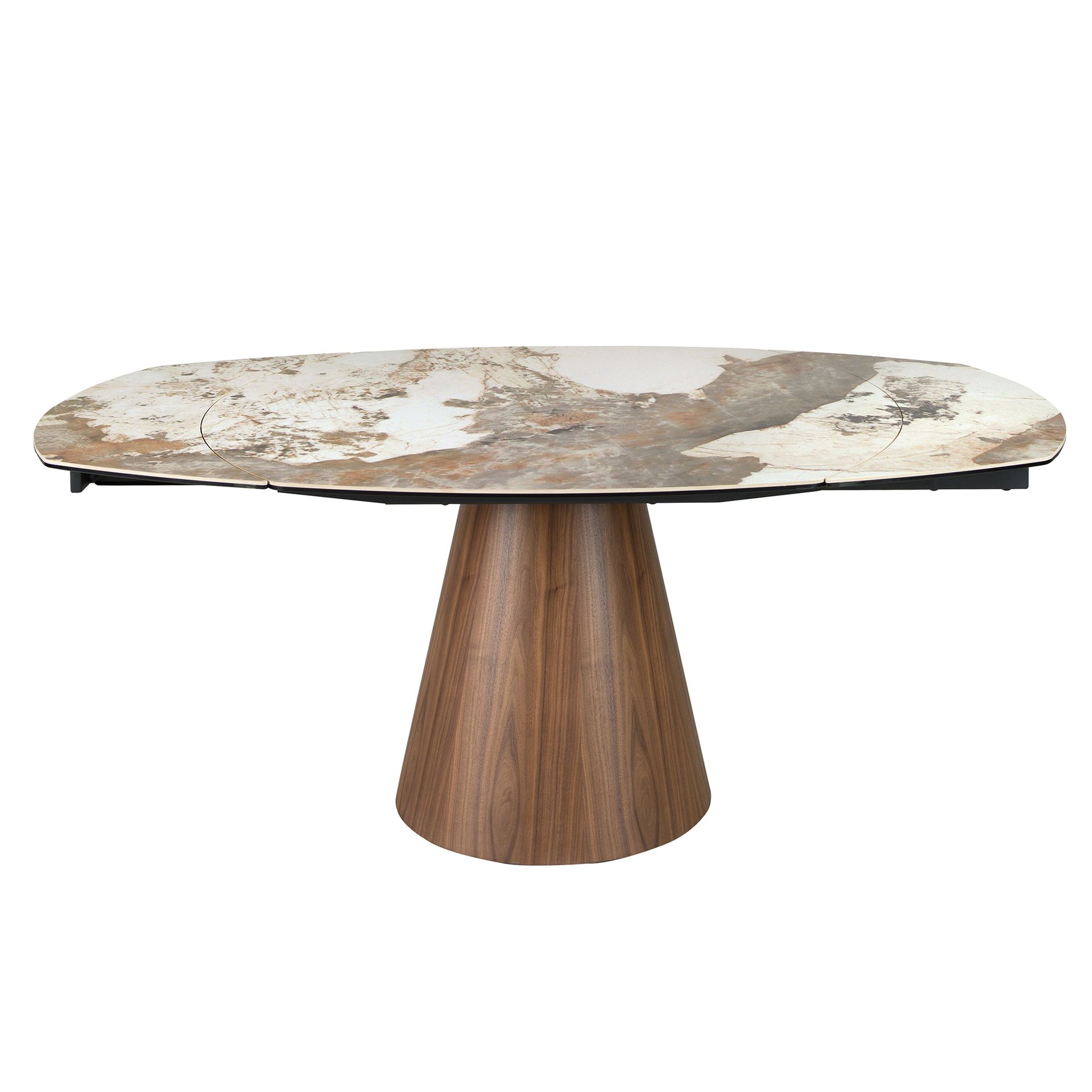 Современный овальный раздвижной обеденный стол бочкообразной формы с белой столешницей из фарфорового мрамора с прожилками земляных оттенков и глянцевой отделкой. Ножки из натурального орехового шпона, а также универсальность конструкции делают его полностью функциональным и подходящим для повседневного использования.