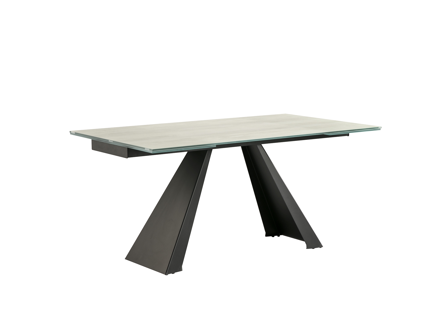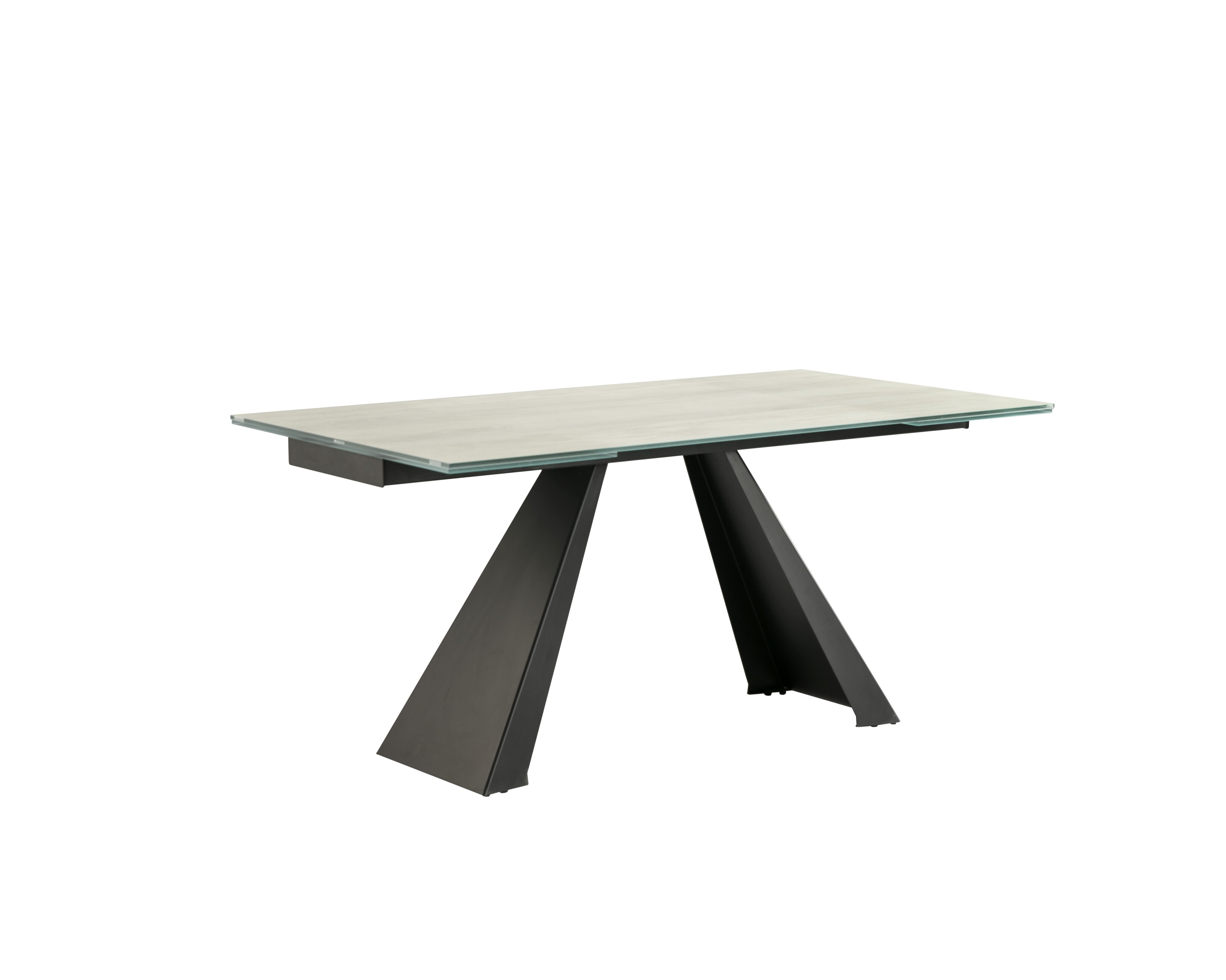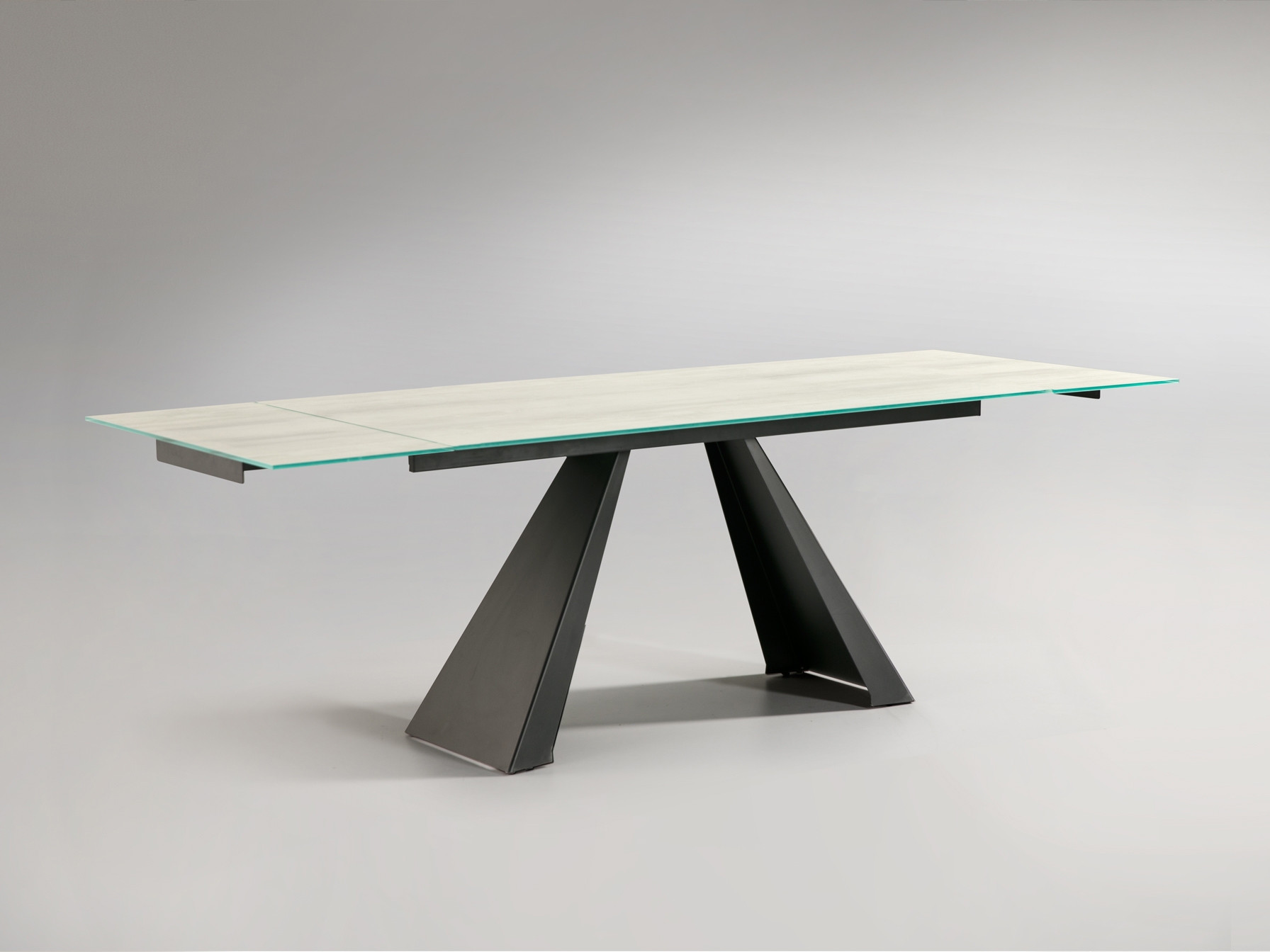 Раздвижной обеденный стол из металла с матовой черной отделкой и столешницей из закаленного стекла толщиной 10 мм с белыми прожилками и высокопрочным покрытием. Два выдвижных крыла на 40 см.
