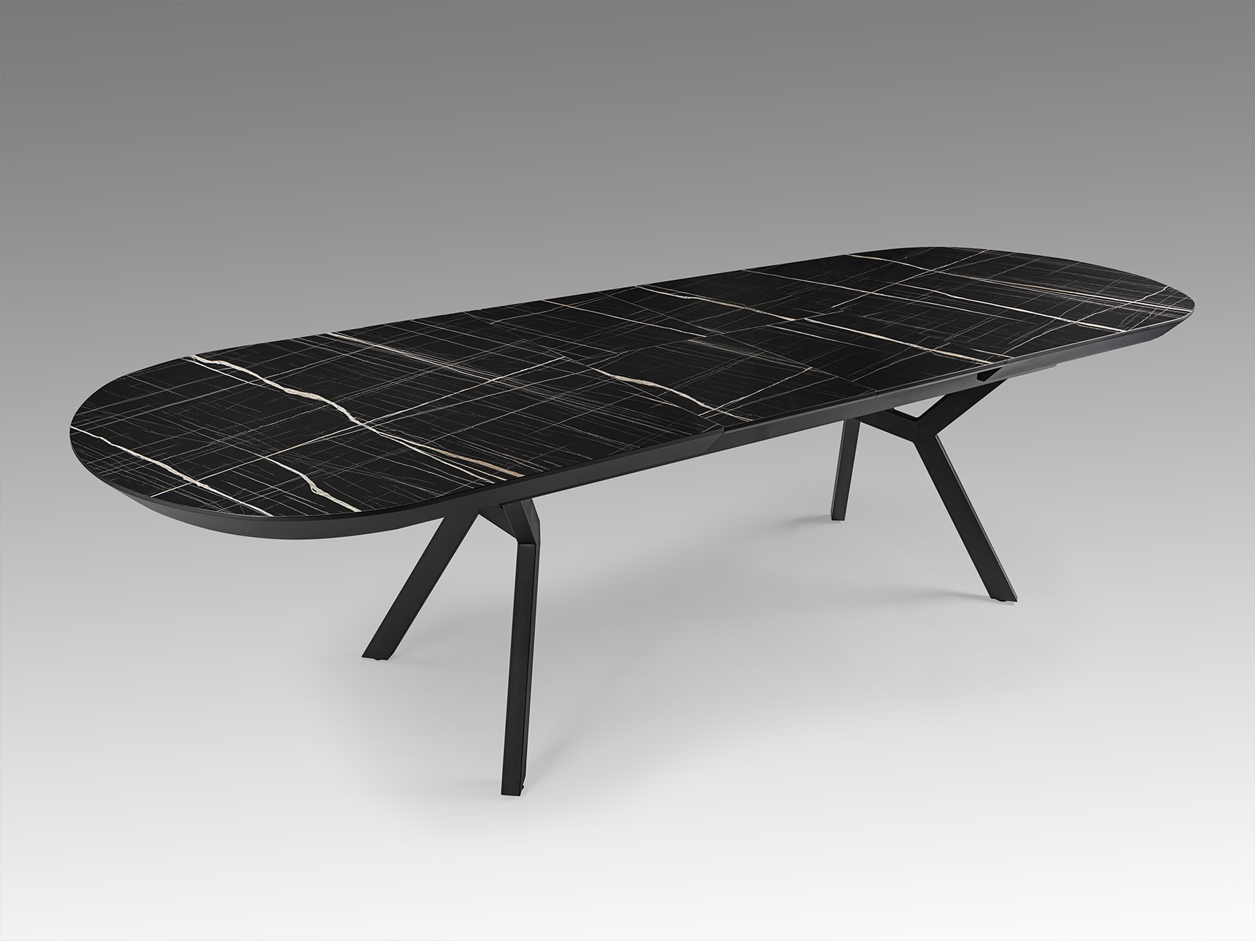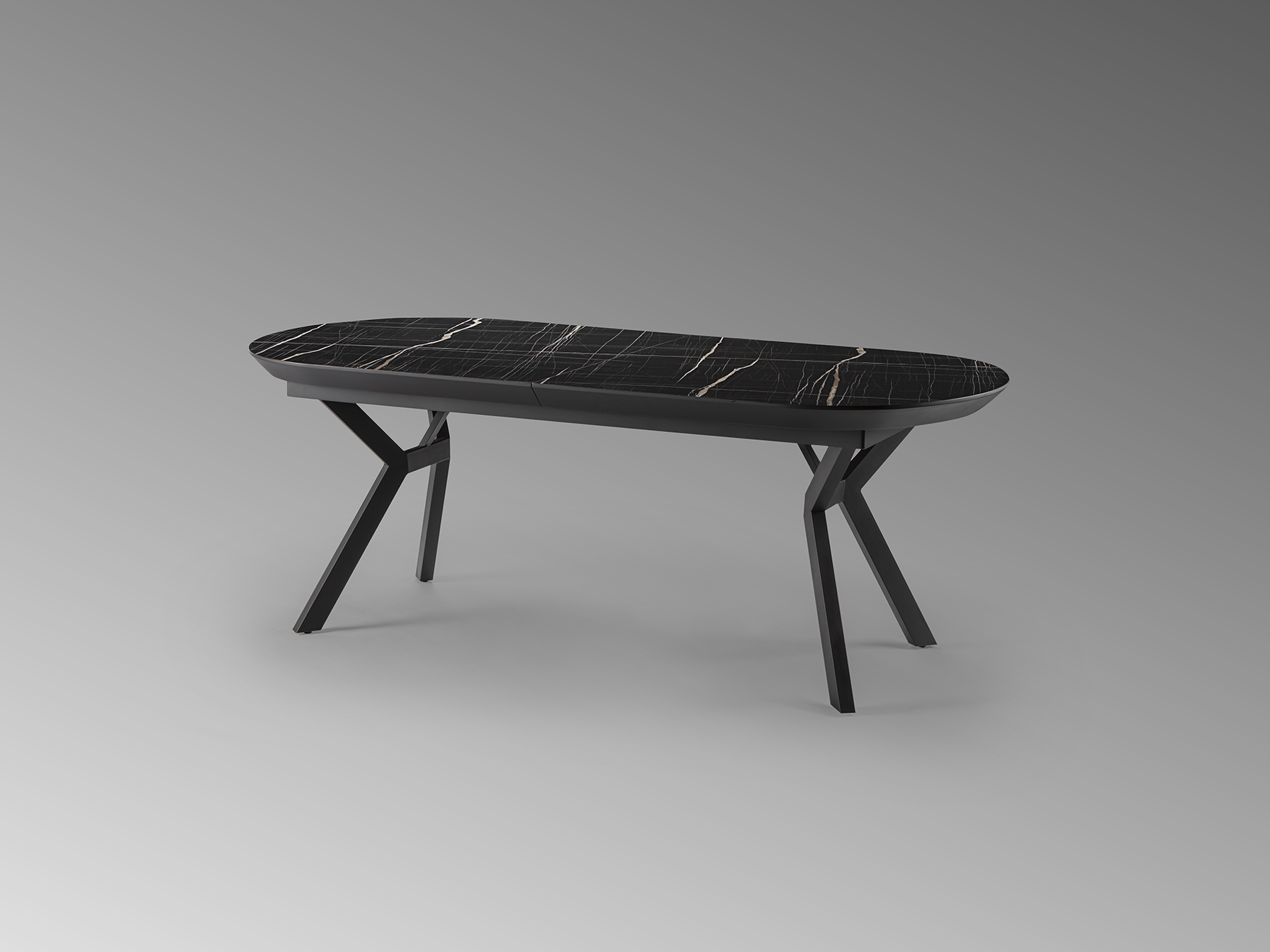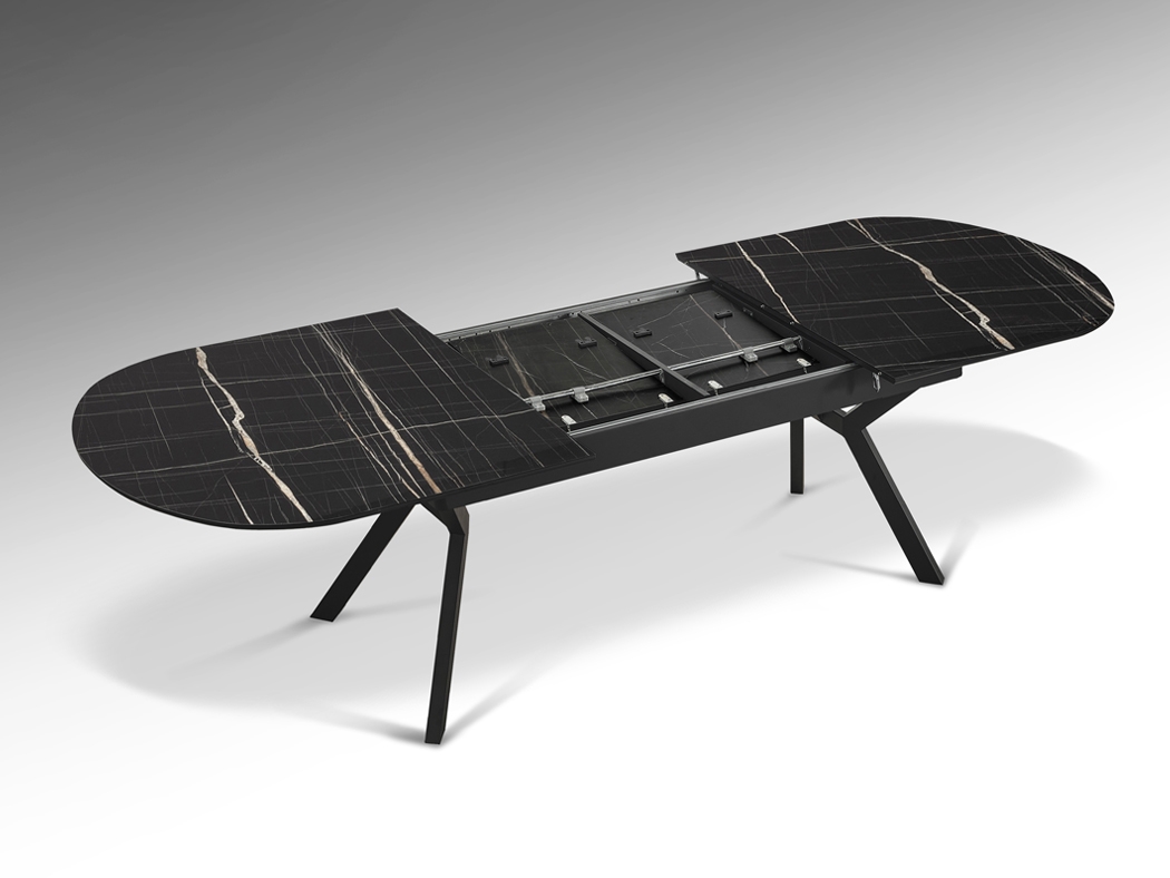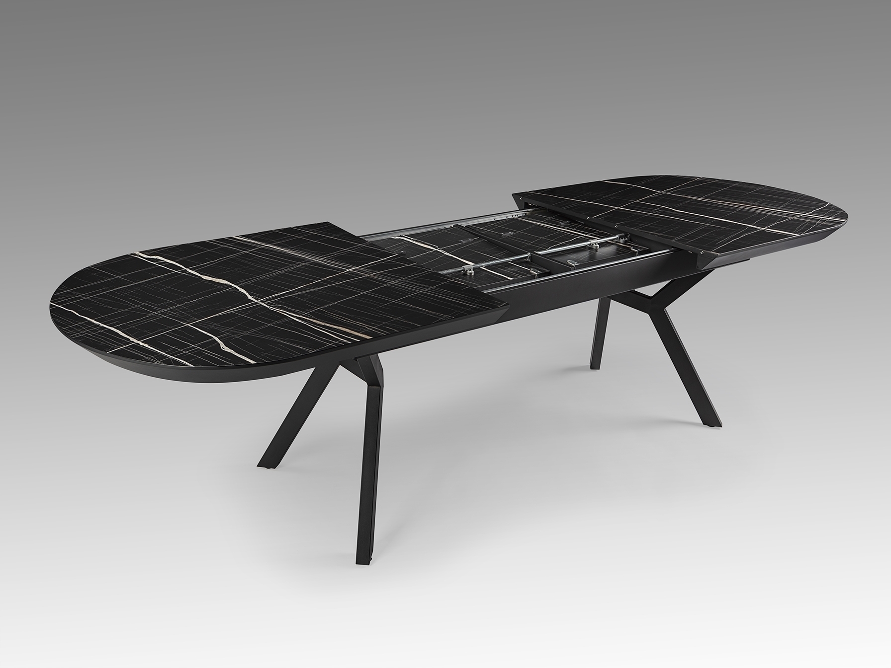 Раздвижной обеденный стол из металла с черной матовой отделкой и столешницей из МДФ с высокостойкой меламиновой поверхностью, отделкой из глянцевого черного мрамора, с черными матовыми краями. Расширяется до 2,85 метра.