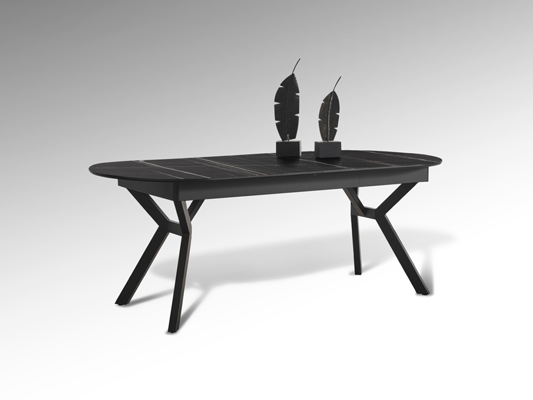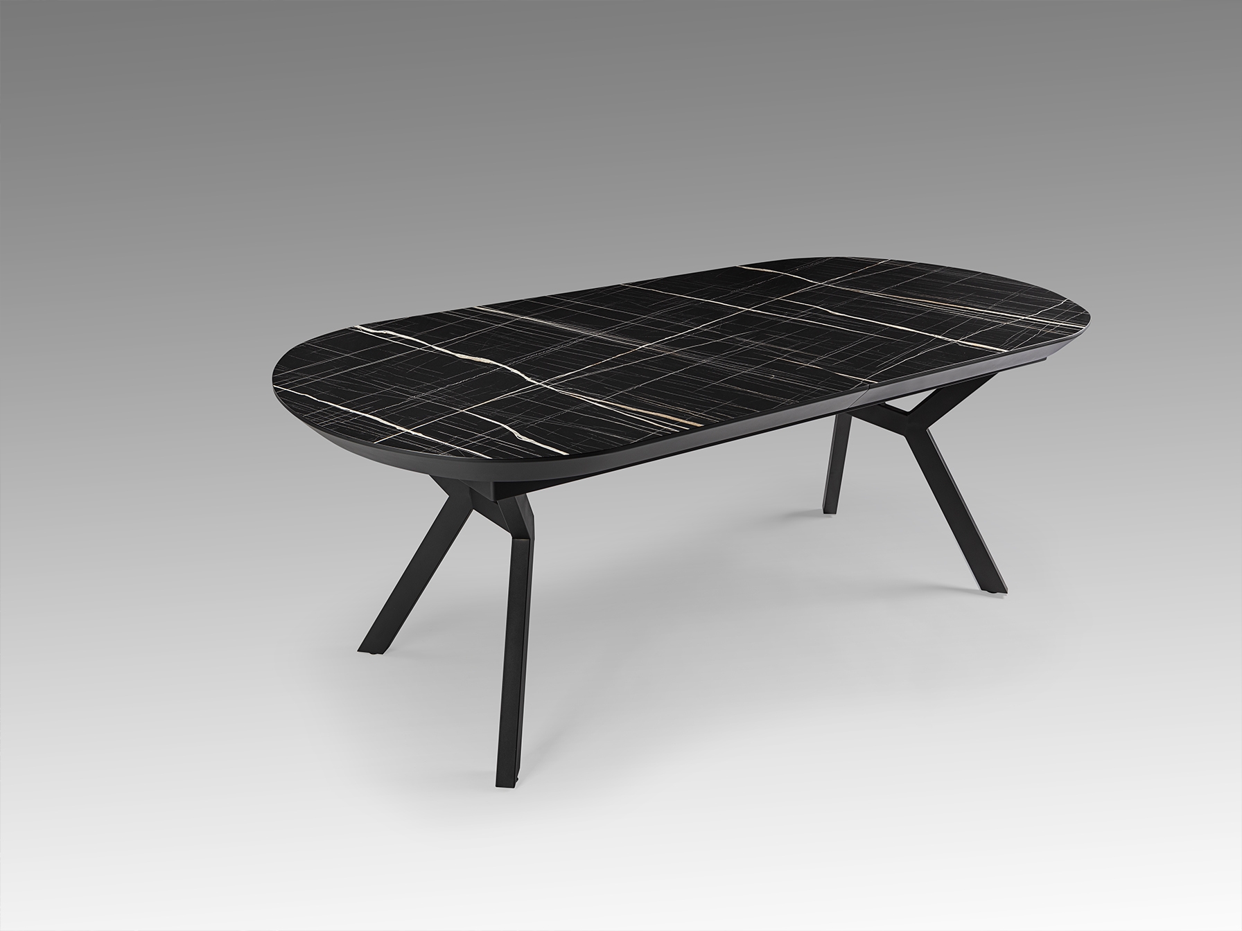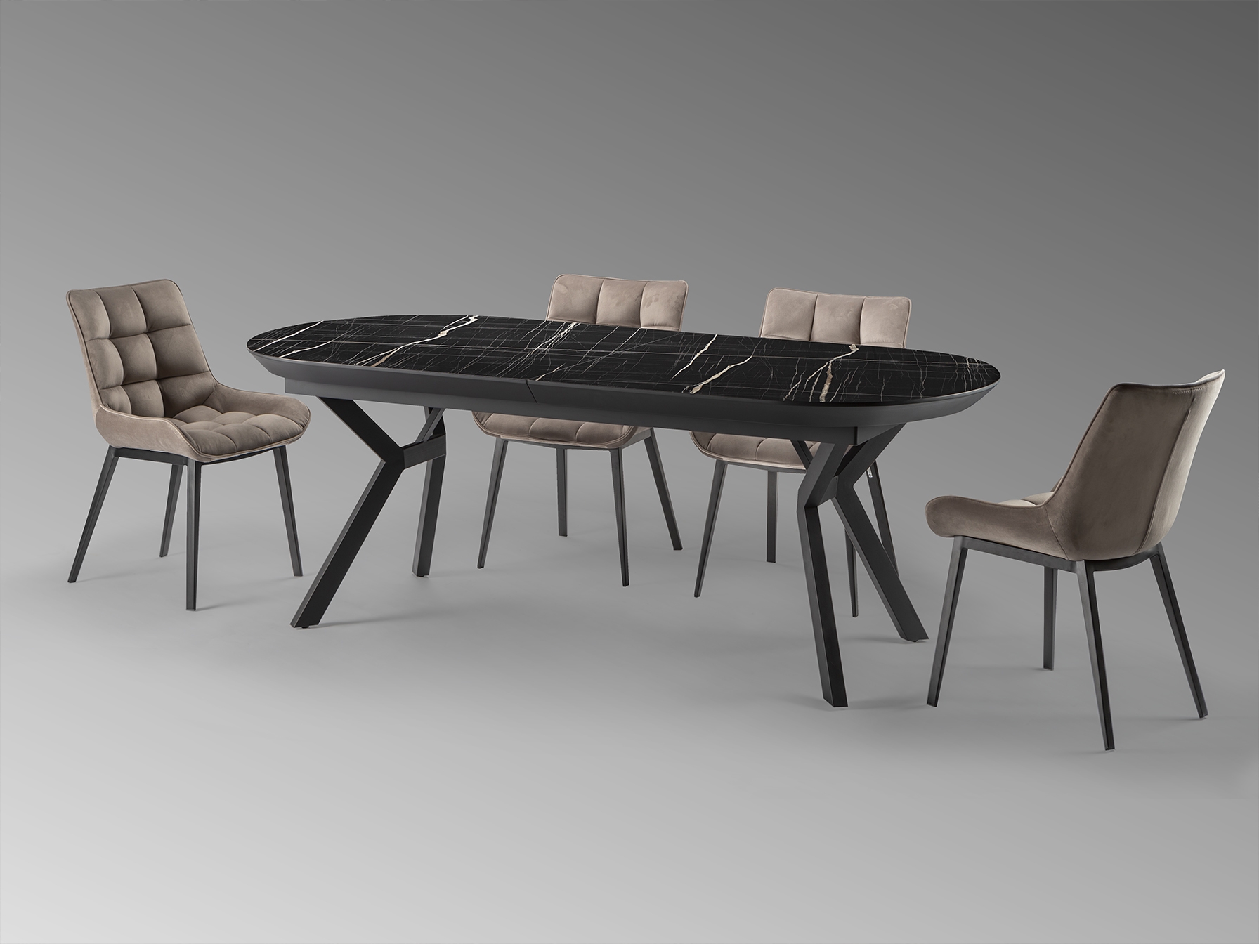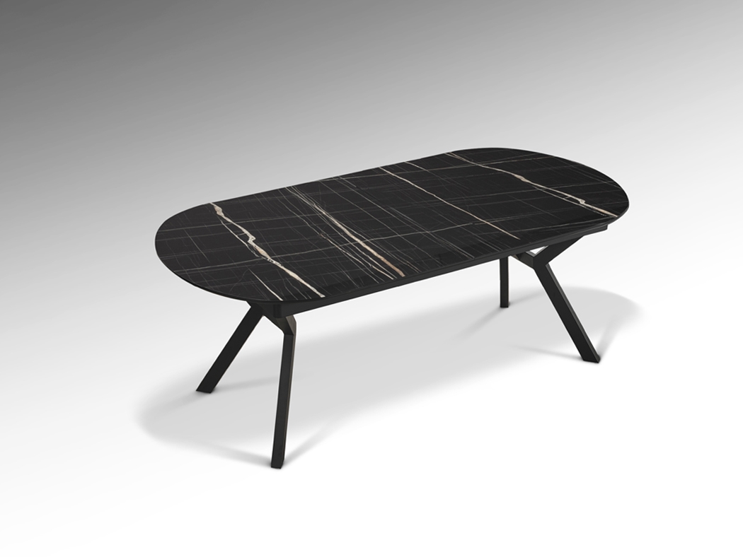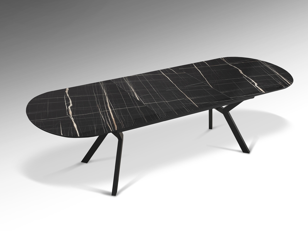 Раздвижной обеденный стол из металла с черной матовой отделкой и столешницей из МДФ с высокостойкой меламиновой поверхностью, отделкой из глянцевого черного мрамора, с черными матовыми краями. Расширяется до 2,85 метра.