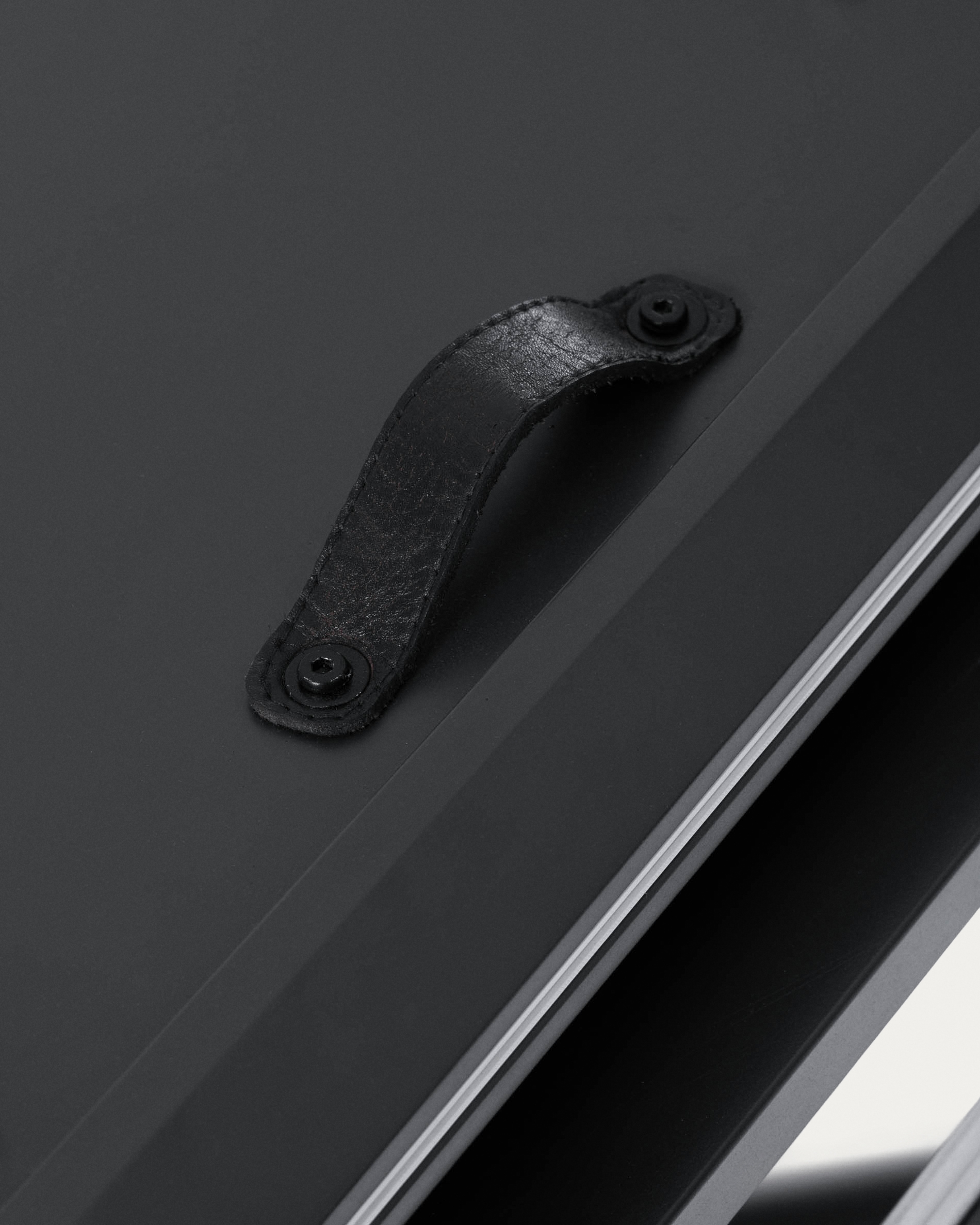 Стол прямоугольной формы. Столешница имеет покрытие из закаленного черного матового стекла. Оно ударопрочное, не оставляет отпечатков пальцев при эксплуатации, легко очищается от загрязнений.