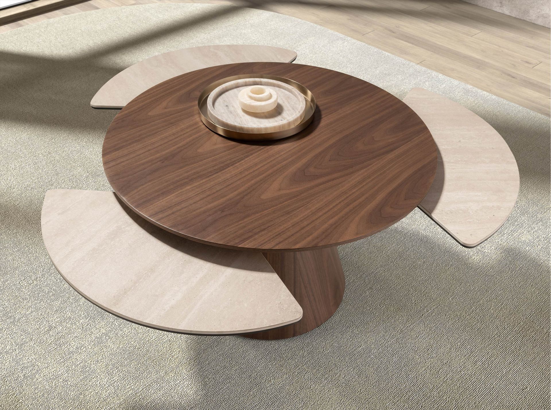 Круглый раздвижной журнальный столик в современном стиле со столешницей из натурального орехового шпона и песочного цвета из керамогранита с матовой отделкой, а также оригинальными ножками из натурального орехового шпона. Предмет мебели с простым, но оригинальным дизайном, который добавит неповторимый и индивидуальный штрих в ваш интерьер.