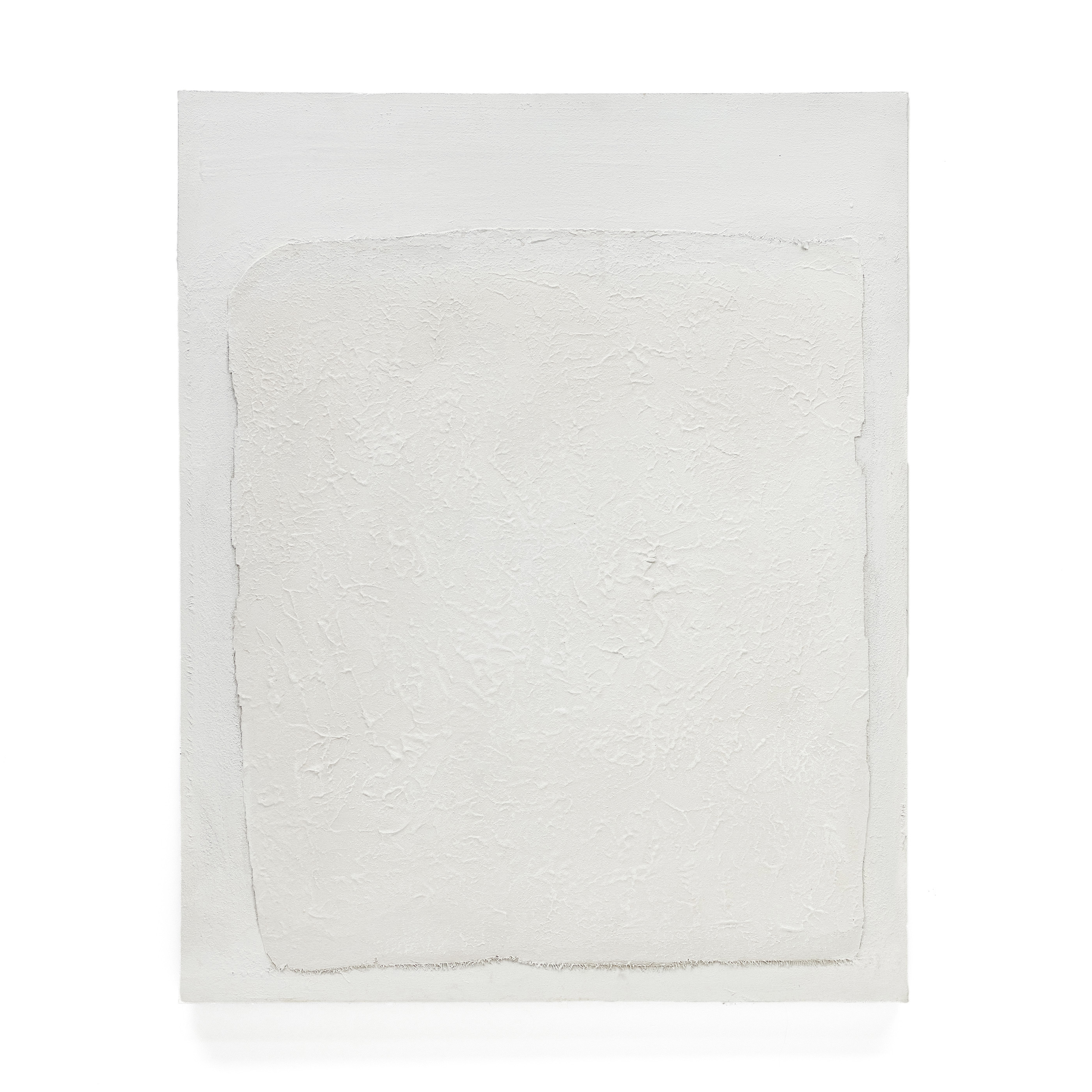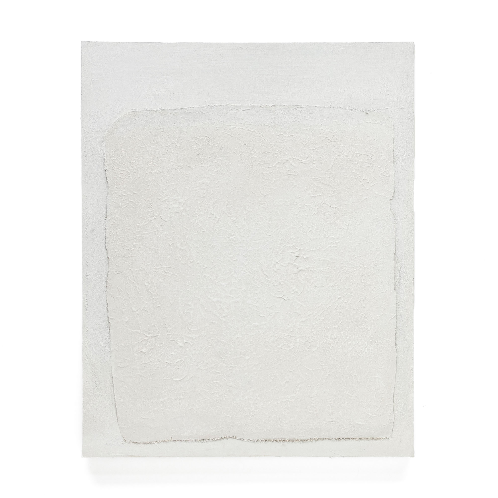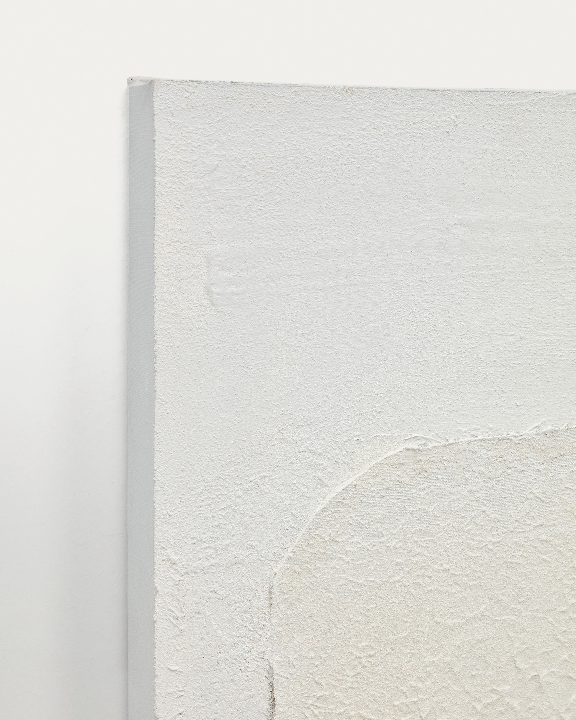 Панно прямоугольной формы. Оно сделано из холста, на котором белой фактурной краской изображена абстрактная фигура.