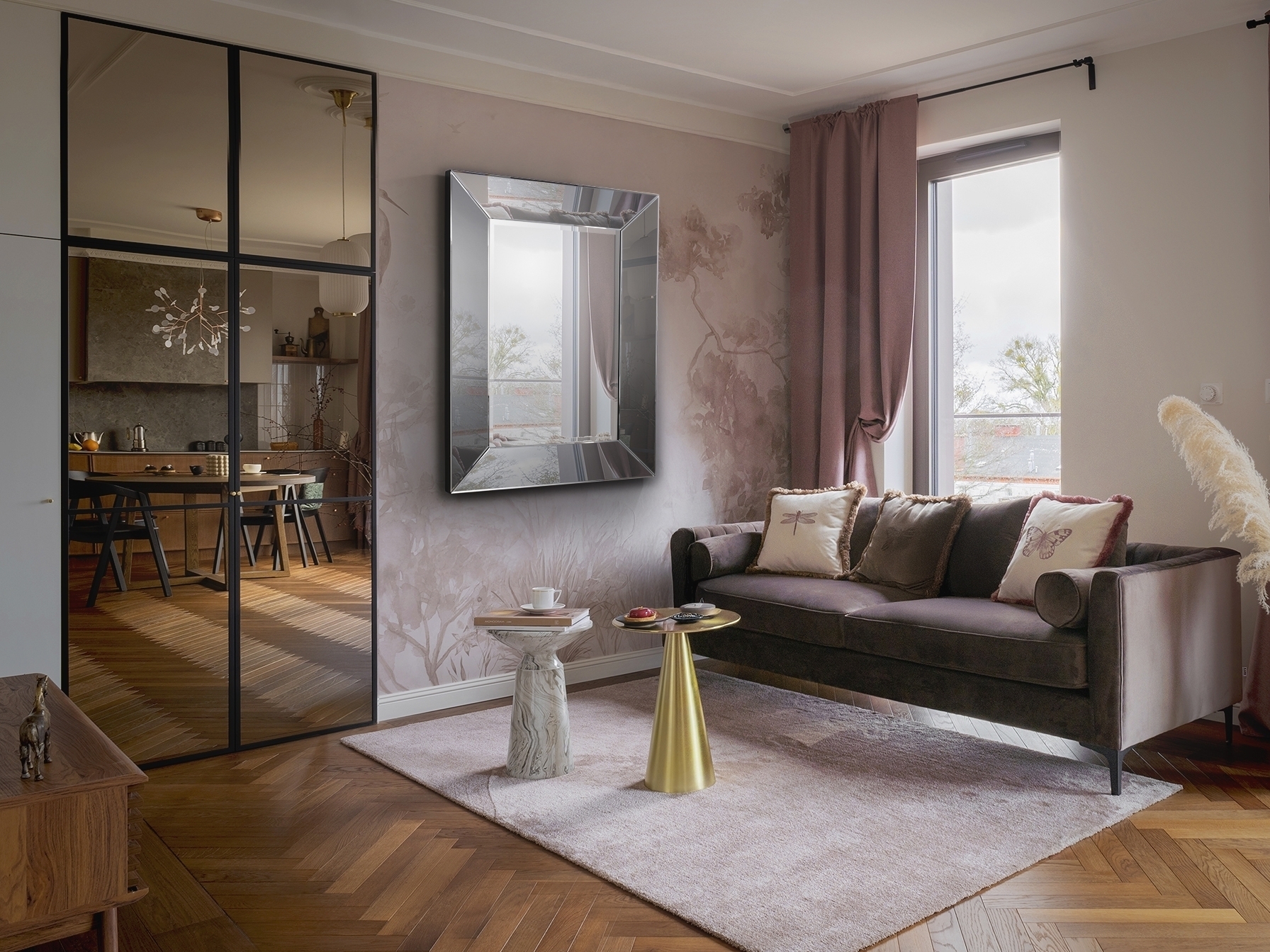 Рамка дымчатого цвета, ширина 15 см.