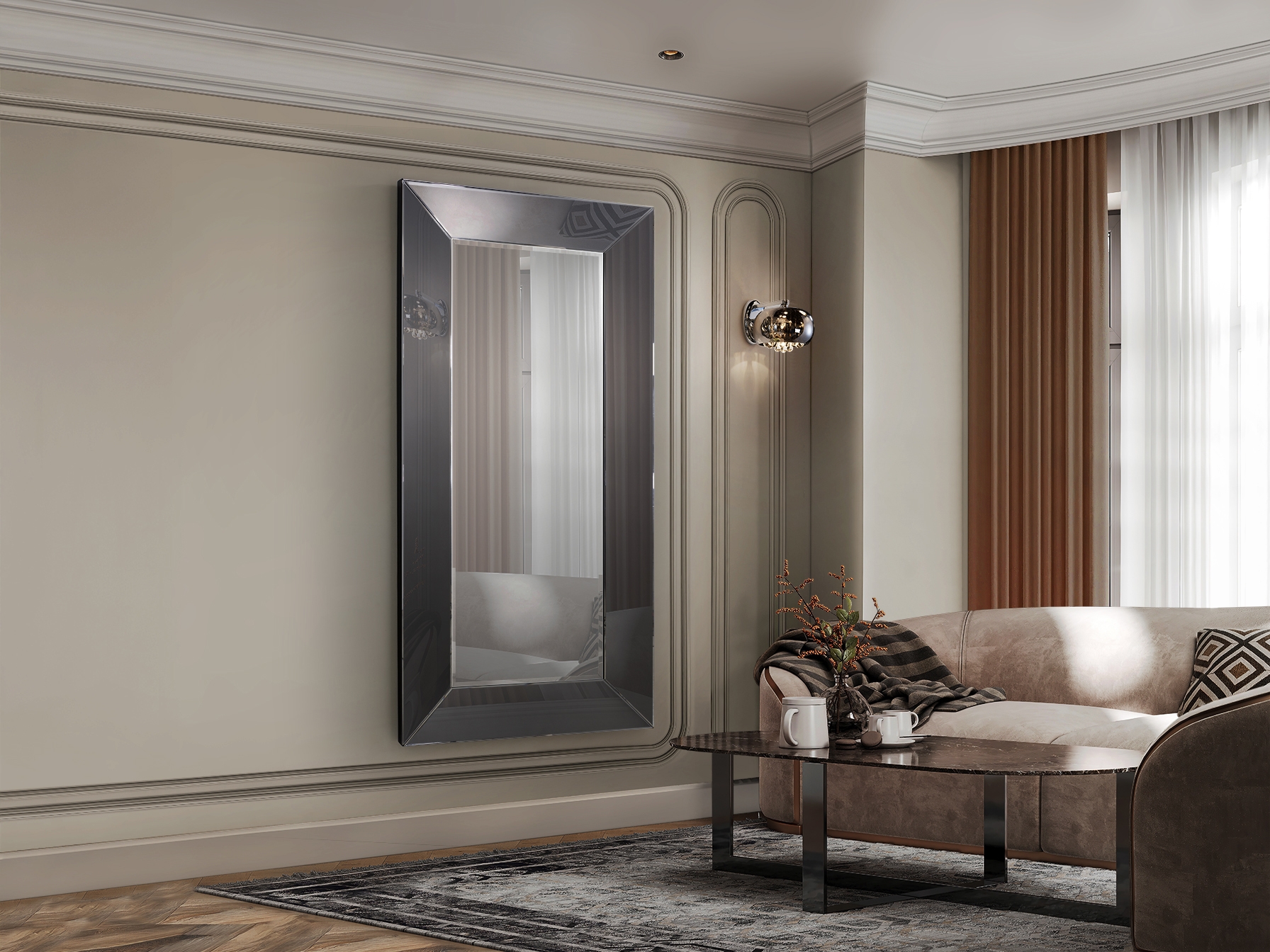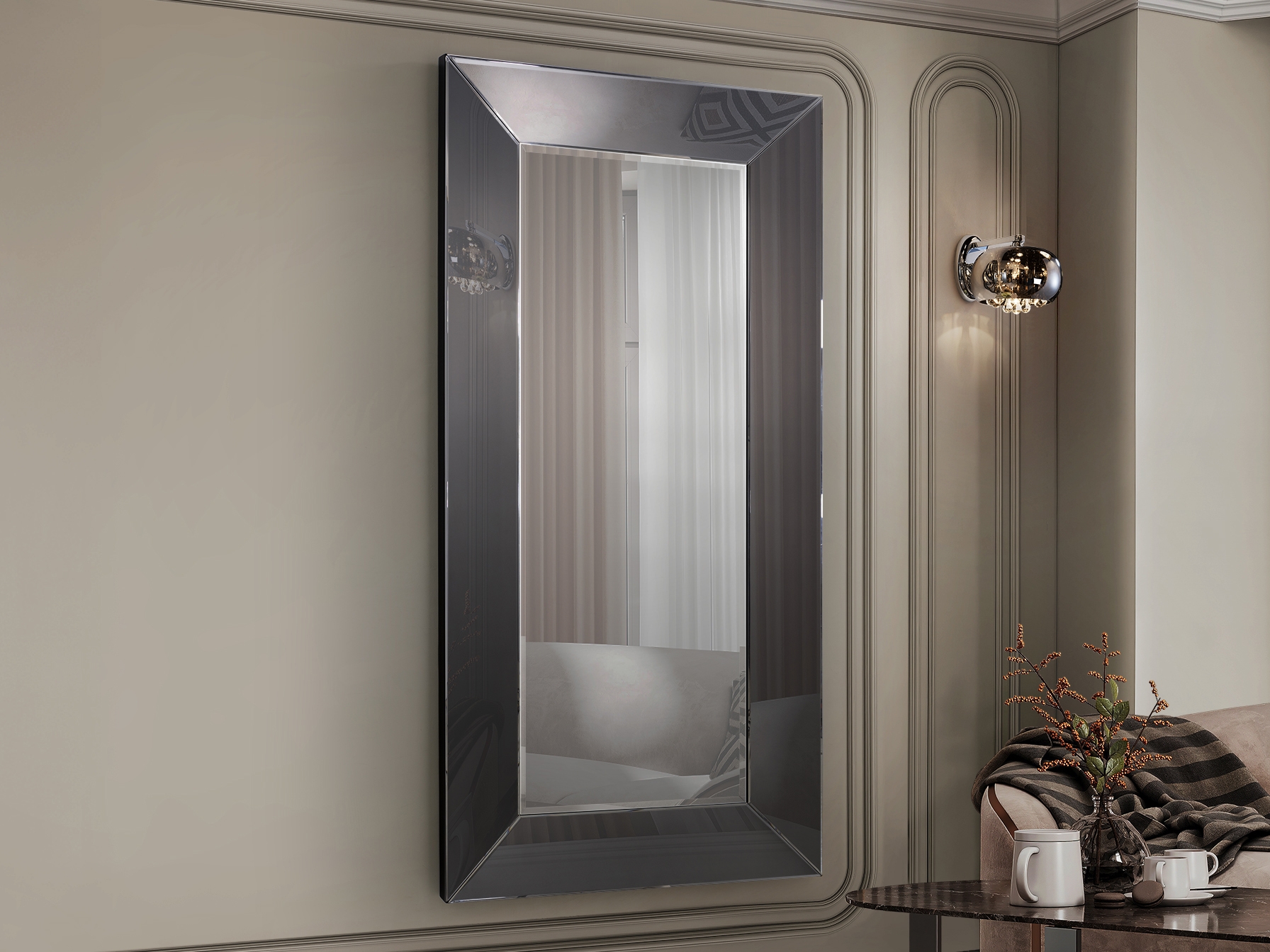 Декоративное зеркало изготовлено из скошенных зеркальных пластин. Рама дымчатого цвета. Задняя часть выполнена из МДФ чёрного цвета. Готово к установке в вертикальном или горизонтальном положении.