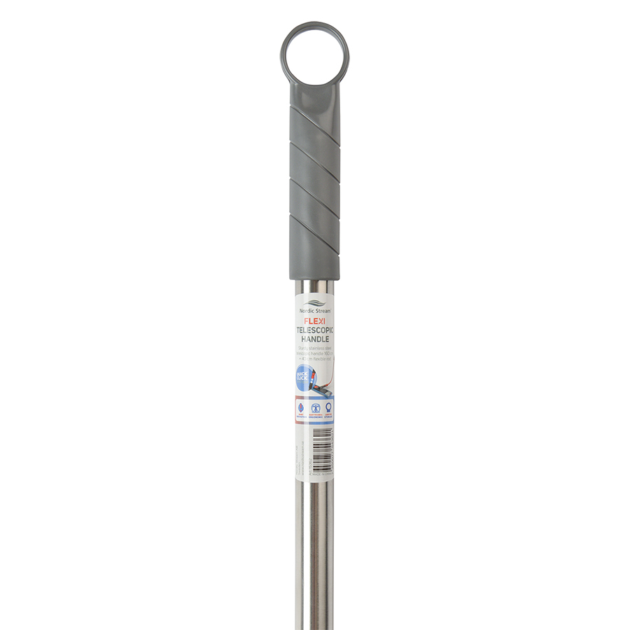 Раздвижная ручка для швабры в комплекте с гибкой штангой облегчат уборку в труднодоступных местах. Телескопическая система позволяет раздвинуть штангу до 160 см. Выполненная из прочной нержавеющей стали ручка устойчива к механическим воздействиям и коррозии. В комплекте с гибкой штангой 40 см ручка эффективно справится с любыми загрязнениями даже в труднодоступных местах. Аксессуар снабжен удобным механизмом, который фиксирует две его части в раздвижном положении, препятствуя самопроизвольному сложению. Также ручка дополнена пластиковым колпачком с кольцом для подвешивания.