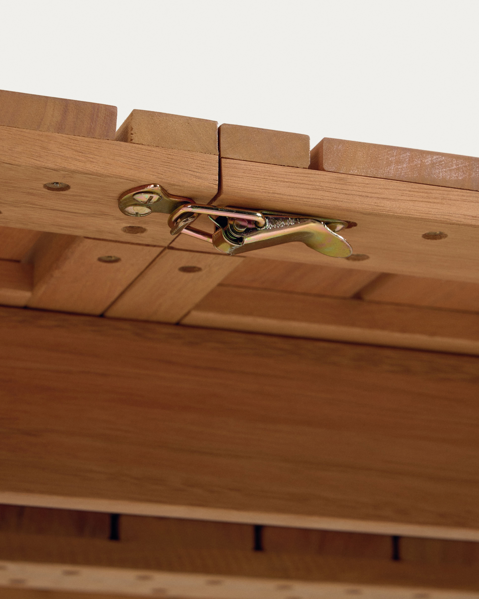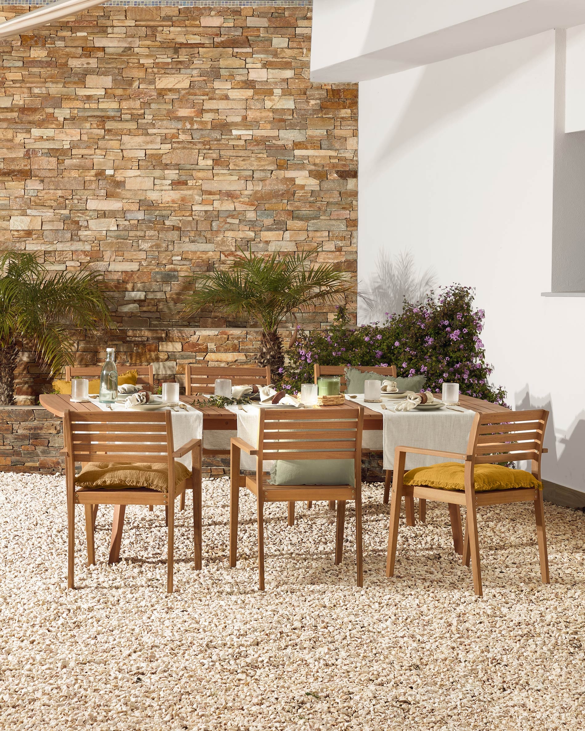 Стол имеет прямоугольную форму и полностью сделан из древесины эвкалипта. Столешница толщиной 2,5 см имеет дощатую структуру, благодаря чему она быстро просыхает, не накапливает влагу.