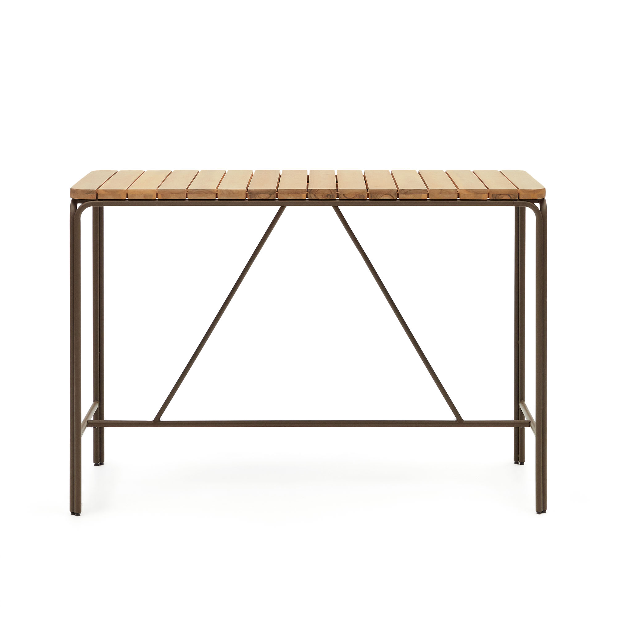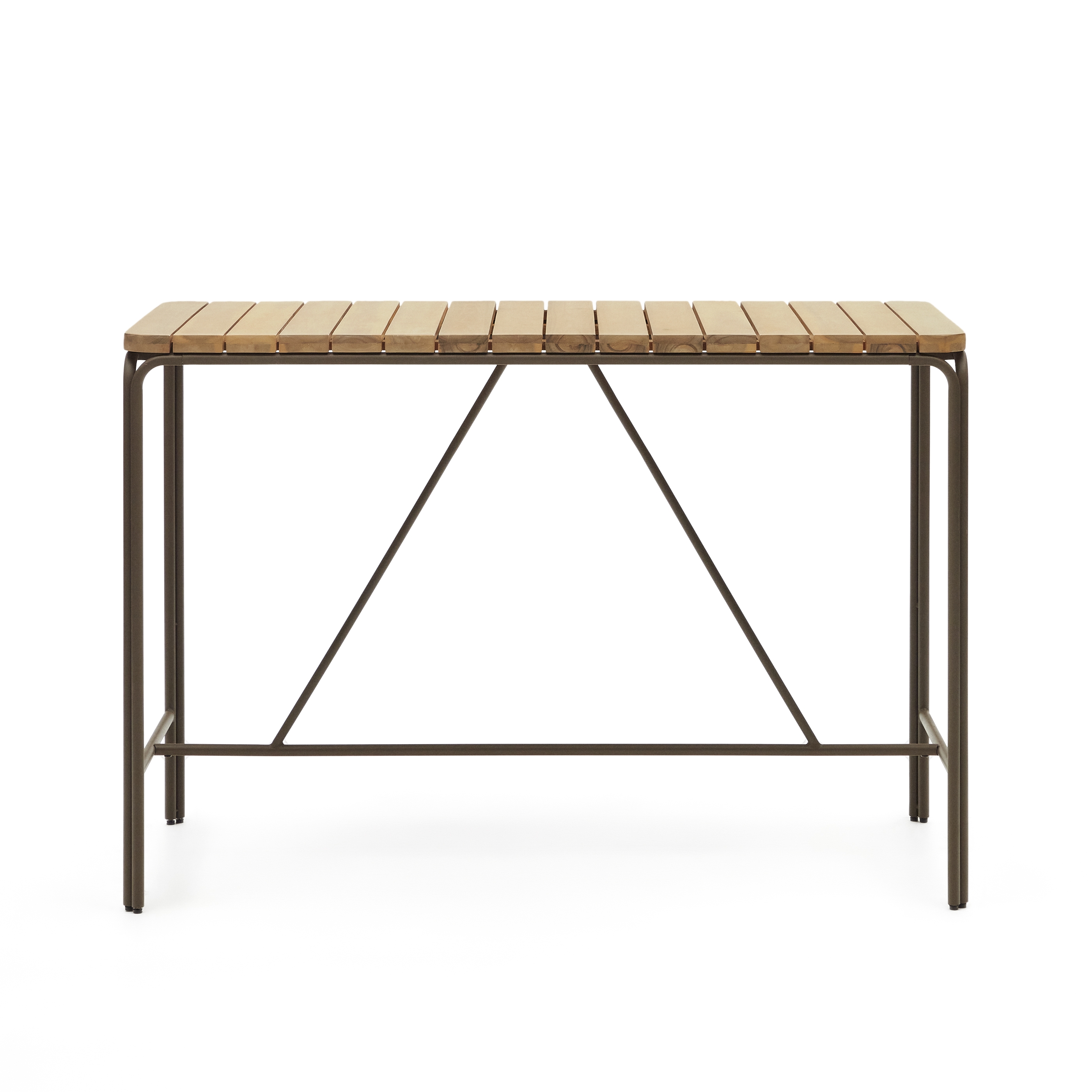 Стол прямоугольной формы. Он состоит из металлического каркаса, окрашенного порошковой краской в коричневый цвет, и деревянной столешницы из массива акации. Столешница толщиной 1,5 см имеет реечную структуру, благодаря чему она будет быстро высыхать после намокания. Древесина обработана полиуретаном, который защищает ее от влаги и ультрафиолета.