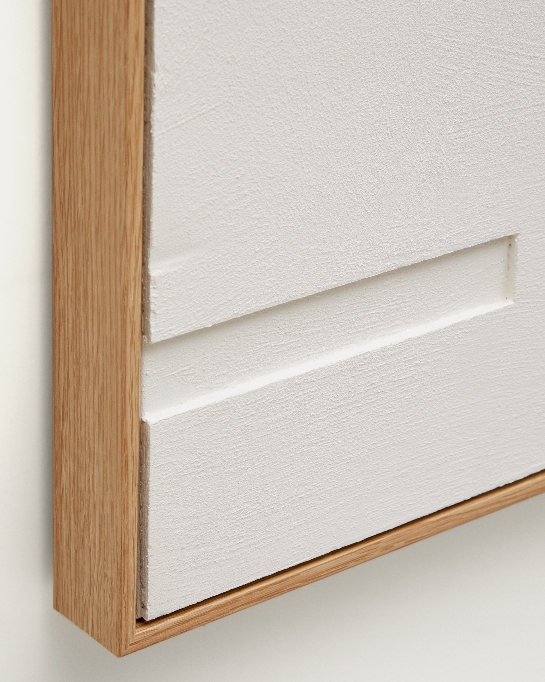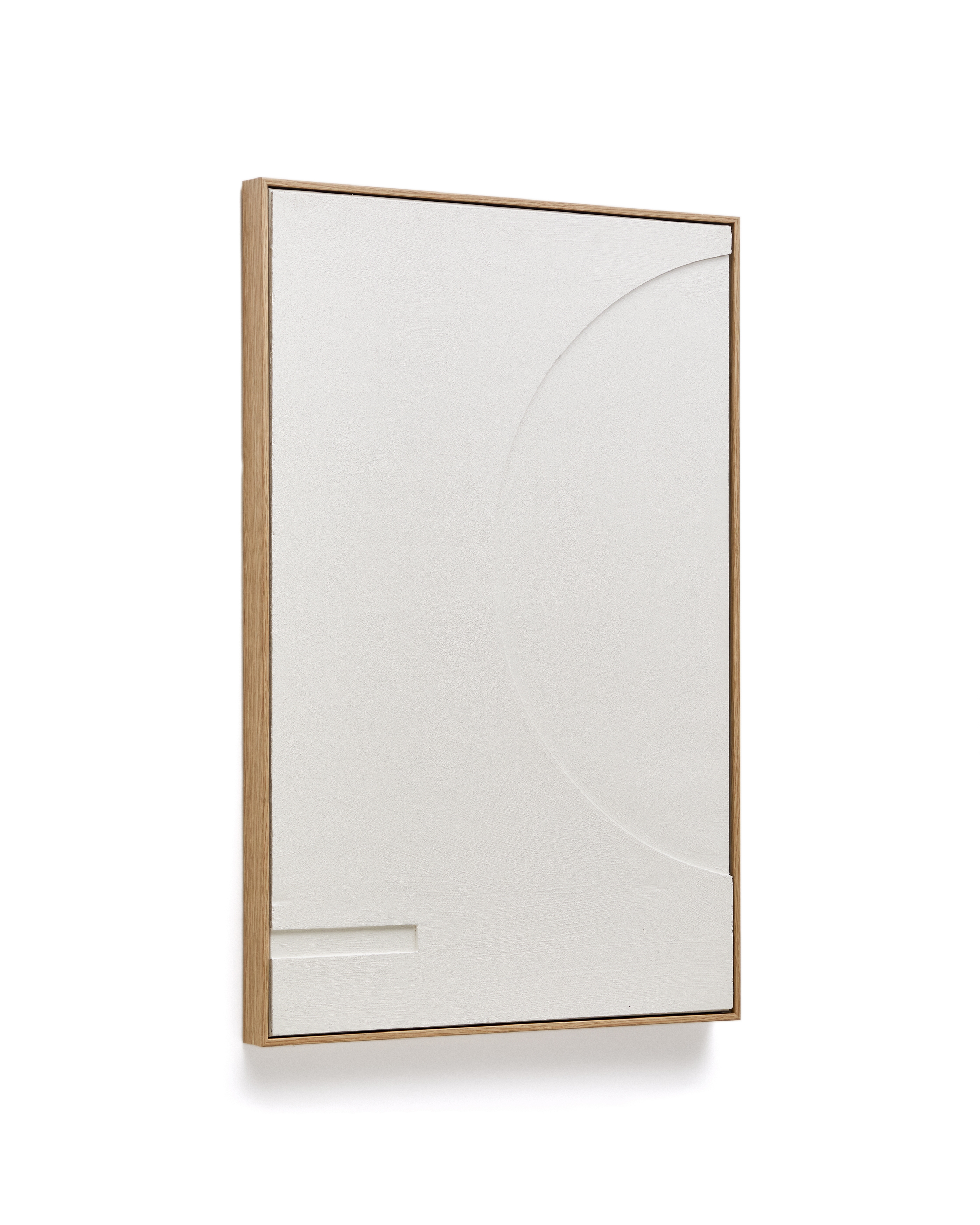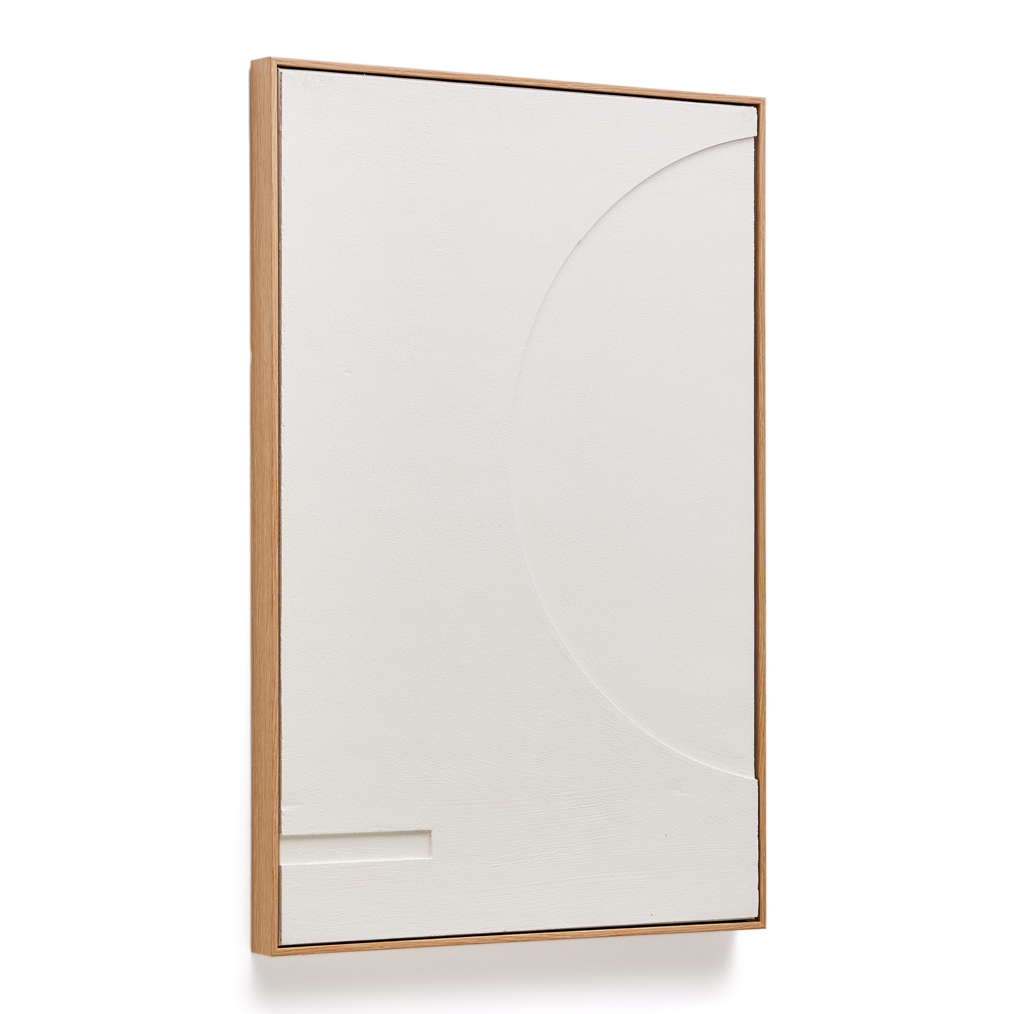 Картина имеет прямоугольную форму. Это скульптурное изделие, созданное из фактурной штукатурки белого цвета. Картина вставлена в деревянную раму цвета дубовой древесины.