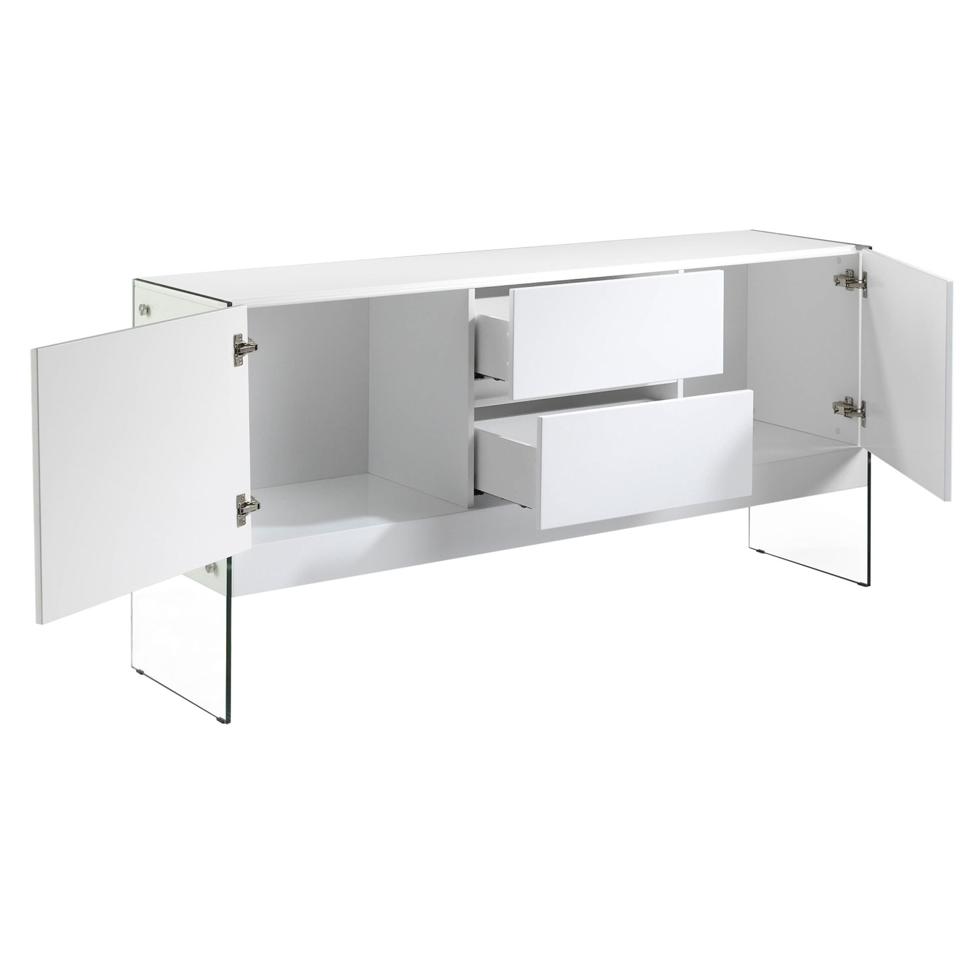 Сервант CP1410-E от фабрики Angel Cerda — беспроигрышный вариант для любого современного интерьера. С первого взгляда сервант убеждает в своей способности идеально вписаться в любой городской интерьер. Стеклянные опоры практически незаметны, за счет чего акцентируется только каркас. Сделанный из одного материала и простой по своей форме, он легко «подружится» с другими предметами интерьера в квартире с европейским модерном. Этот сервант представлен в двух моделях — BLANCO (выполнена из белого глянцевого МДФ) и NOGAL (произведена из шпона орехового дерева). Конструкция изделия предусматривает каркас, состоящий из четырех отделений. Справа и слева — две секции на дверцах, а в центре — два выдвижных ящика. Ручки отсутствуют, так как вместо них — доводчики на открывание и закрывание. По бокам к серванту прикручены две стойки из закаленного ударопрочного стекла. Каждая панель держится на четырех металлических крепежах, что обеспечивает надежность и прочность всей конструкции. Размеры серванта: ширина — 180 см, высота — 85 см, глубина — 45 см. Вес составляет 95 кг. Потребуется самостоятельная сборка. Инструкция и крепеж входят в комплектацию.